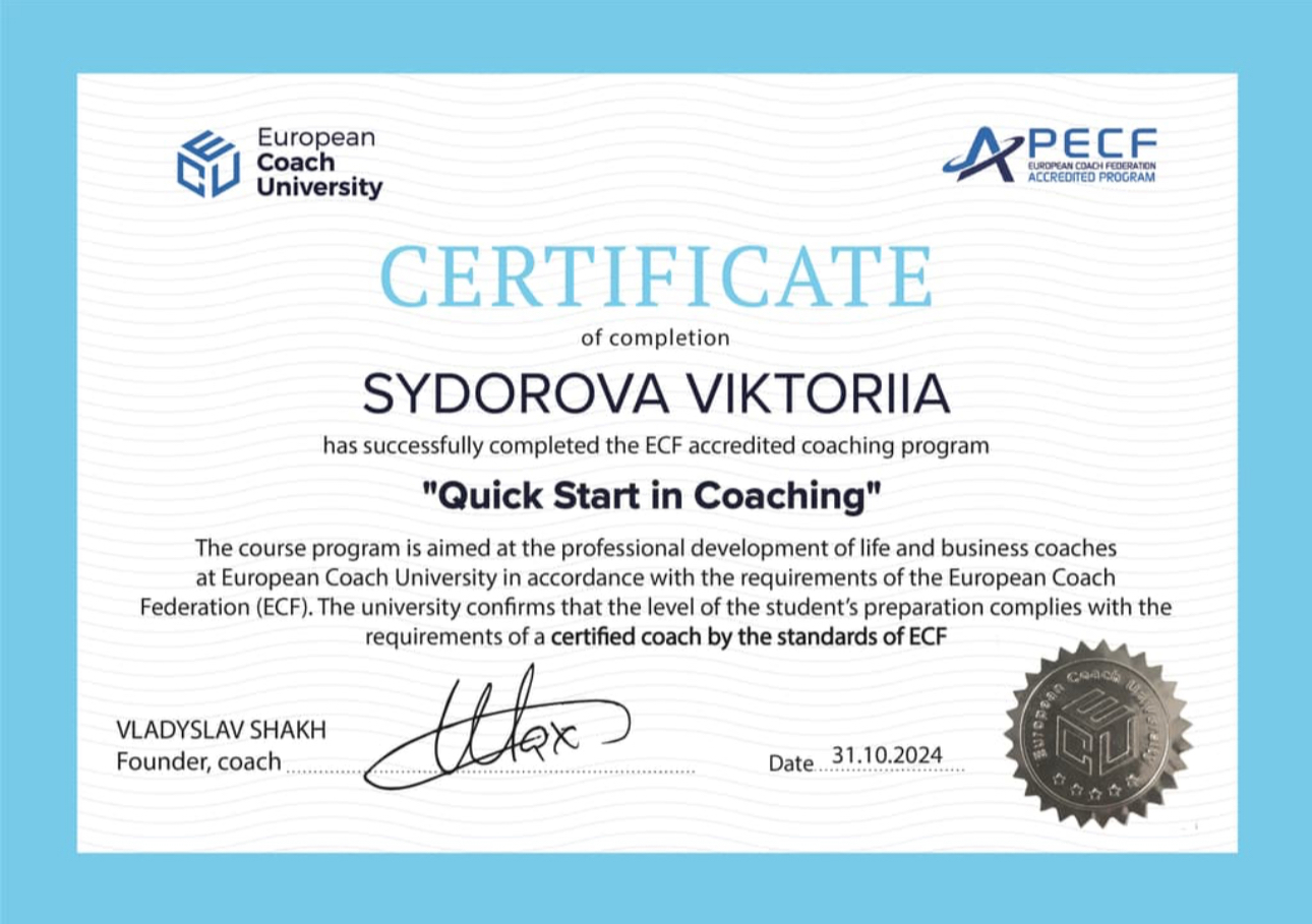 European Coach University, согласно требованиям Европейской федерации коучей (ECF). Университет подтверждает, что уровень подготовки студента отвечает требованиям сертифицированного коуча по стандартам ECF, сертифицированный life and business coach