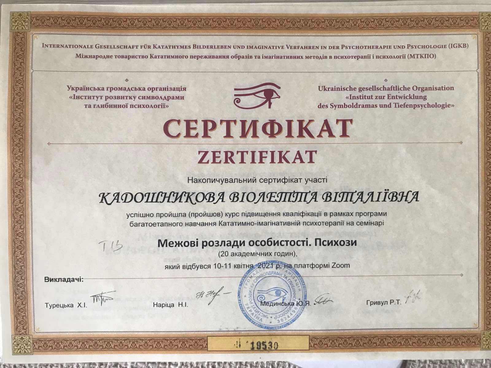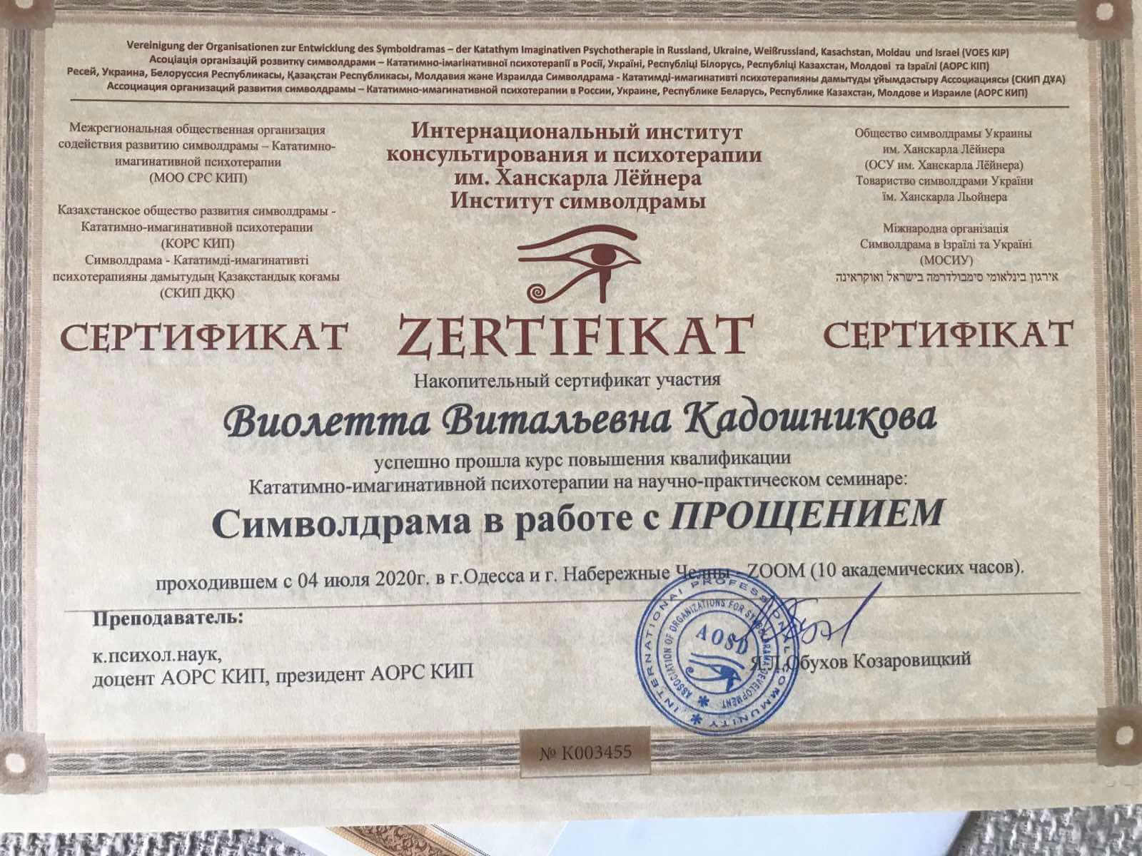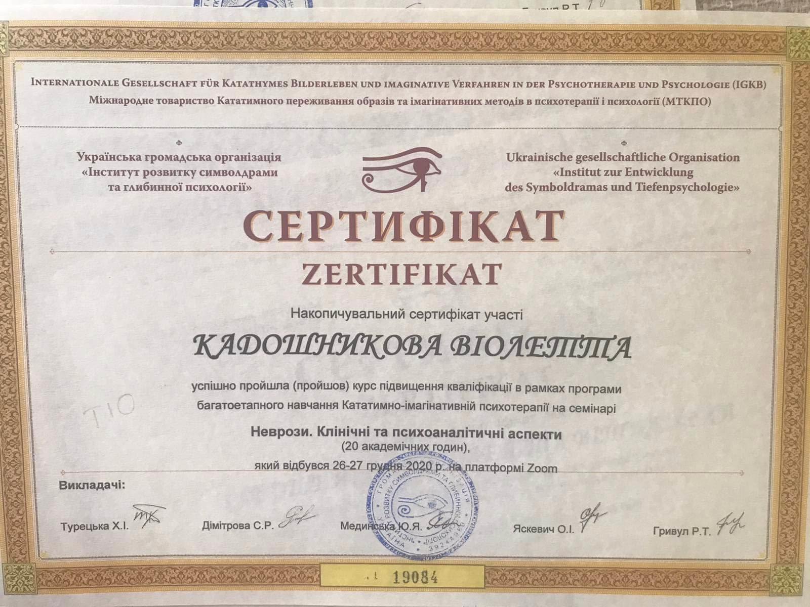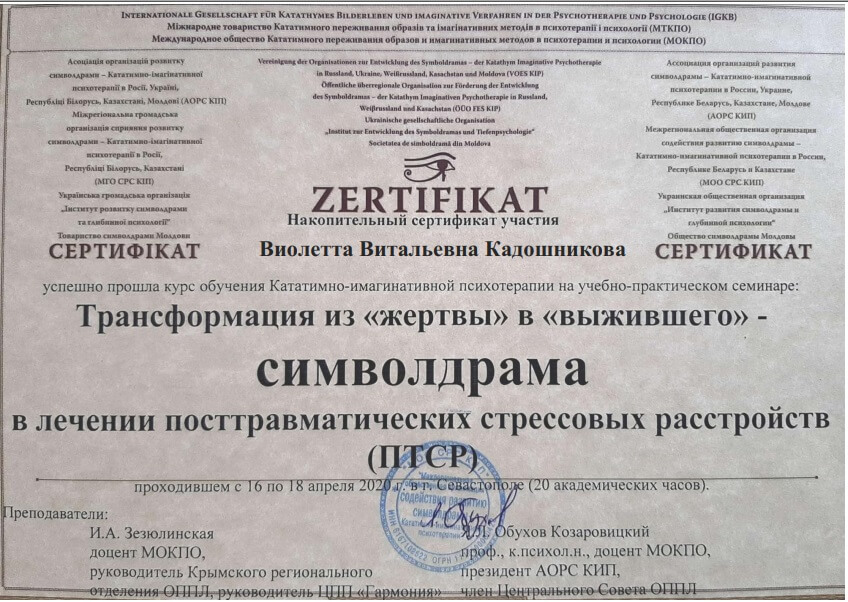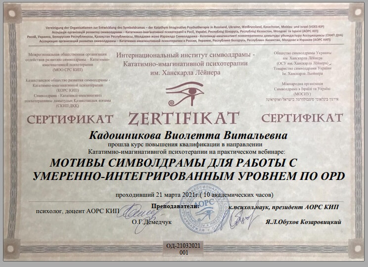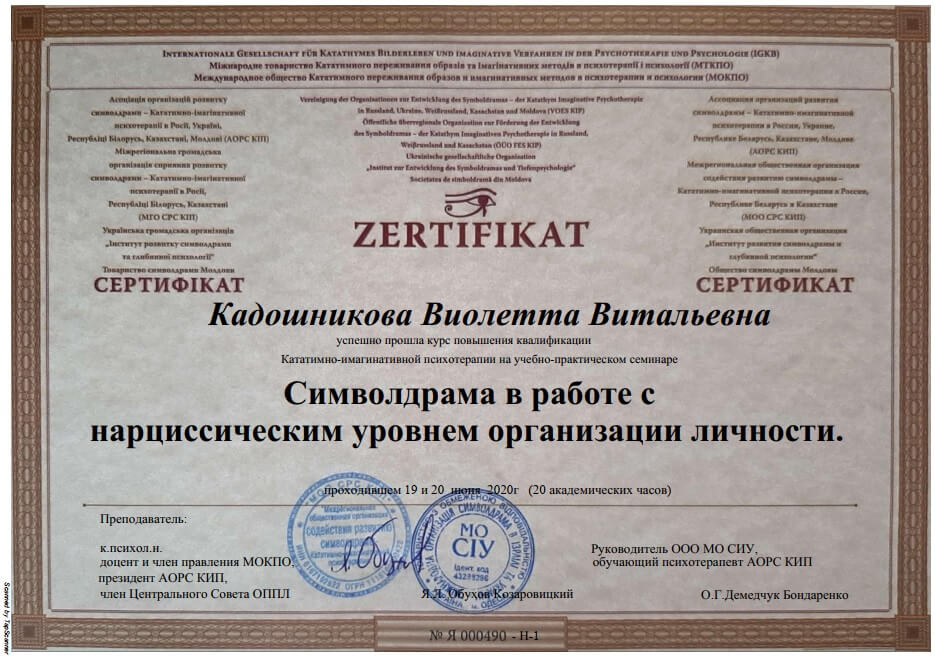 • Сертификат международного общества катативно-имагинативных образов и образных методов в психотерапии и психологии «Символрама в работе с нарциссическим уровнем организации личности (19-20 июня)», г. Одесса, Украина, (онлайн), 2020 г.