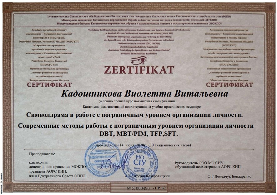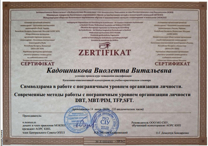 • Сертификат международного общества катативно-имагинативных образов и образных методов в психотерапии и психологии «Символрама в работе с пограничным уровнем организации личности. Современные методы работы с пограничным уровнем организации личности DBT, MBT / PIM, TFP, SFT (14 июня)», г. Одесса, Украина, (онлайн), 2020 г.