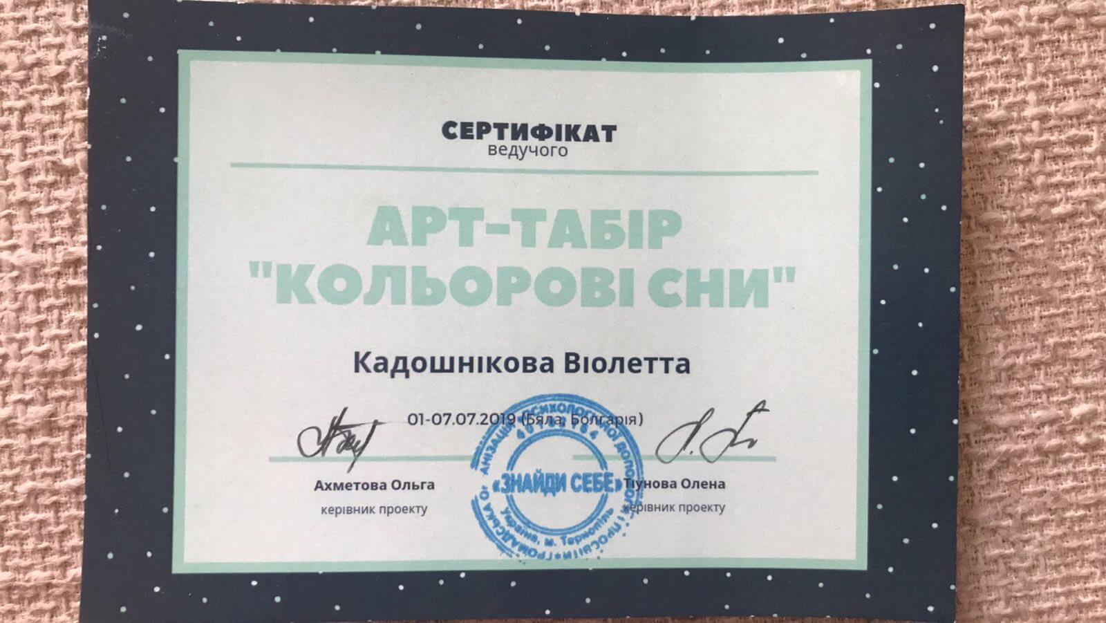 • Сертификат Ассоциации Розвития Глубинной Психологии и Коучинга «Сновидения и символика. Базовый курс (ноябрь-март)», г. Тернополь, Украина, 2019-2020 г.