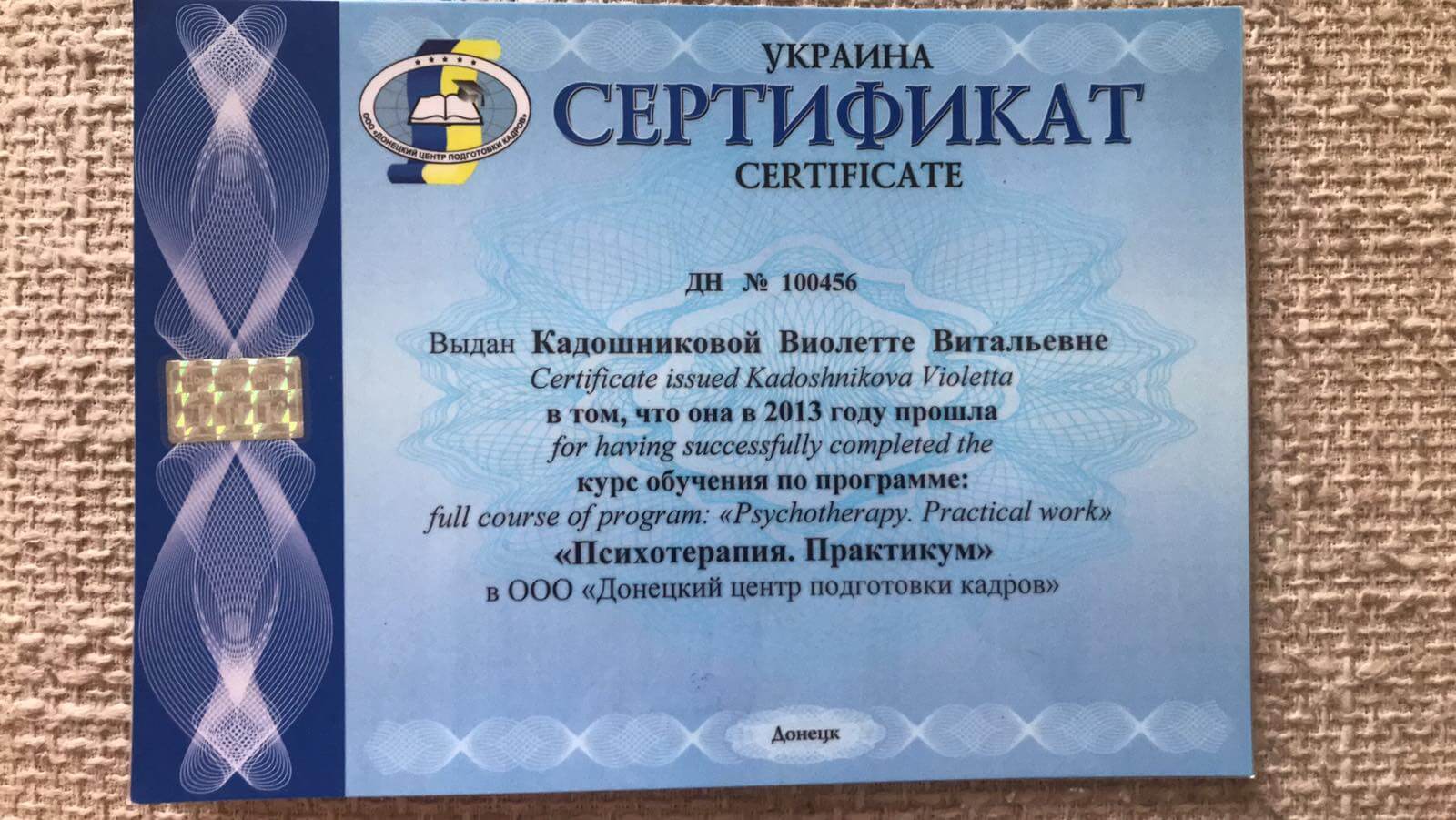 • Сертификат о полном курсе программы «Психотерапия. Практикум», Донецкий учебный центр, Донецк Украина, 2011-2013 гг.