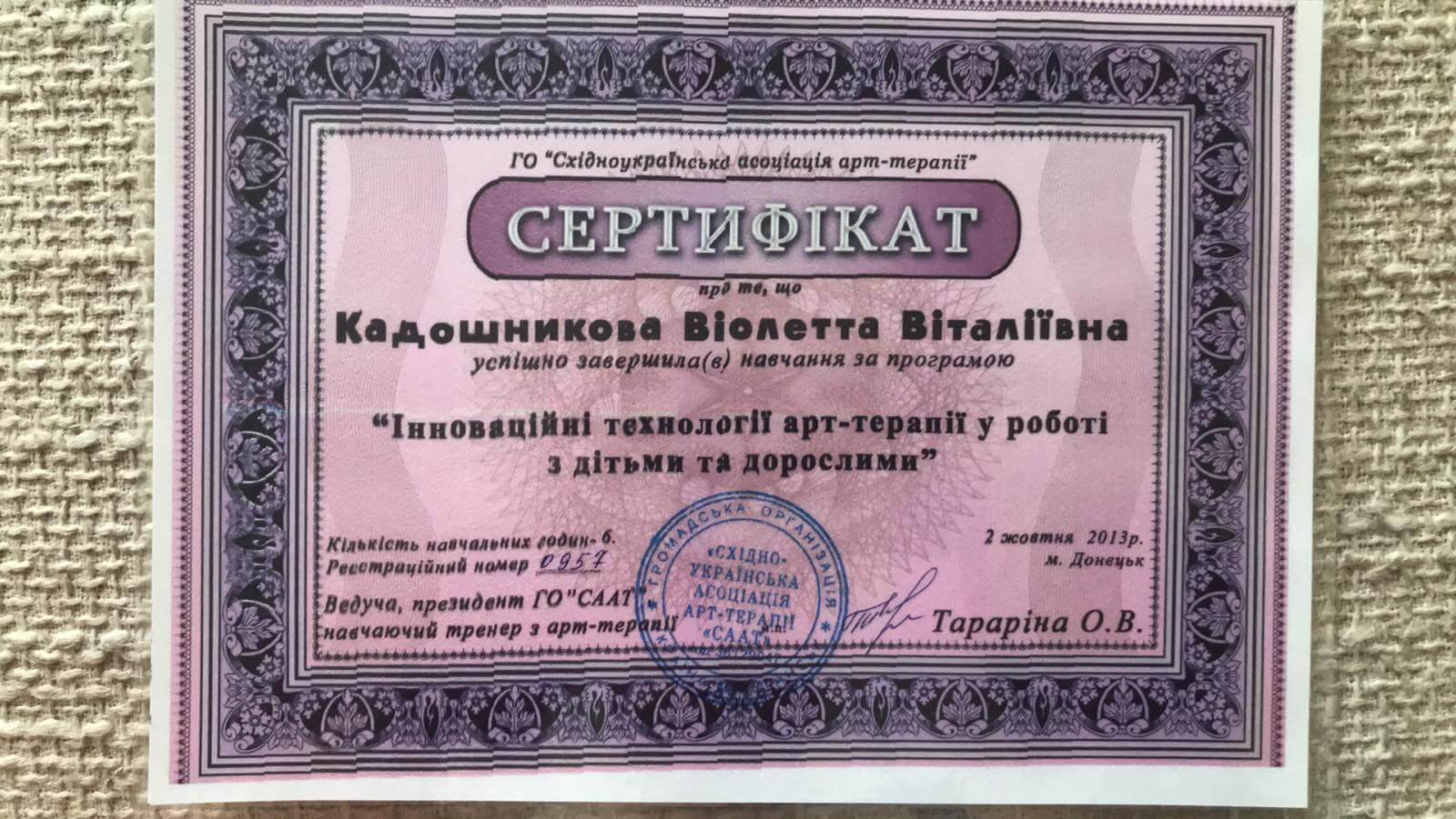 • Сертификат «Инновационные технологии арт-терапии в работе с детьми и взрослыми (02 октября)» Западно-Украинская Ассоциация Арт-Терапии, Донецк, Украина, 2013 г.