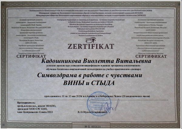 • Сертификат международного общества катативно-имагинативных образов и образных методов в психотерапии и психологии «Символ драма в борьбе с чувством вины и стыда (11-12 мая)», г. Алматы, Казахстан, (онлайн), 2020 г.