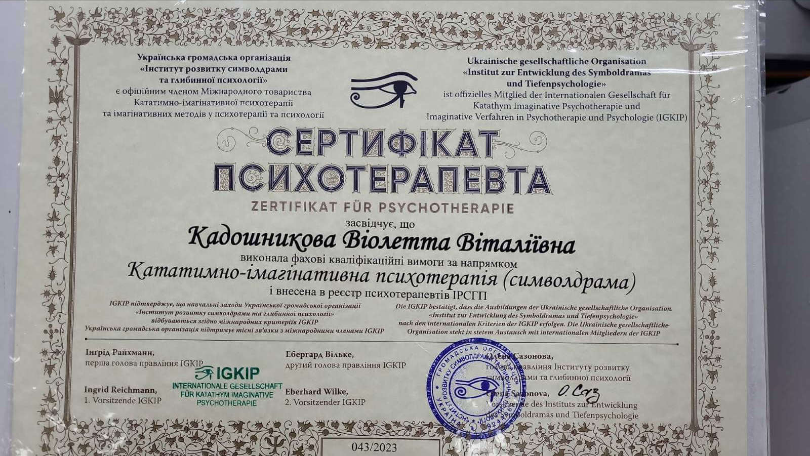 • Сертификат ИРСГП «Психоаналитические основы Кататимно-Имагинативной психотерапии (символ драмы): Вступление в психотерапевтическую практику. Основы психотерапевтического процесса. Психотерапевтический сеттинг. Психоанализ теорий развития (сентябрь-ноябрь)», г. Каменец-Подольский, Украина, (онлайн), 2020 г.