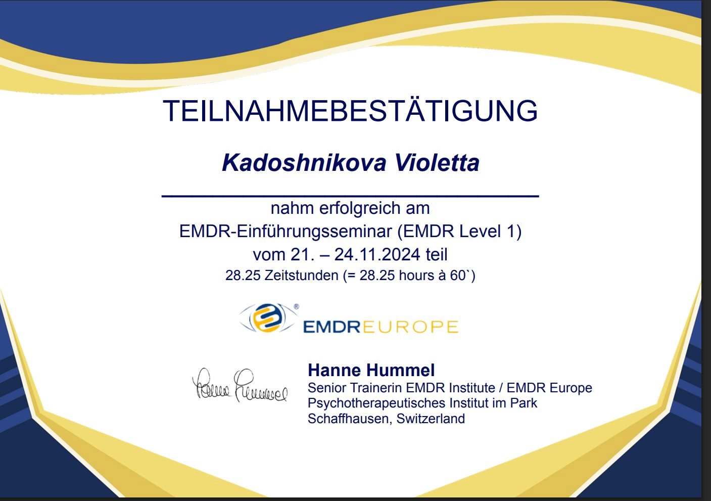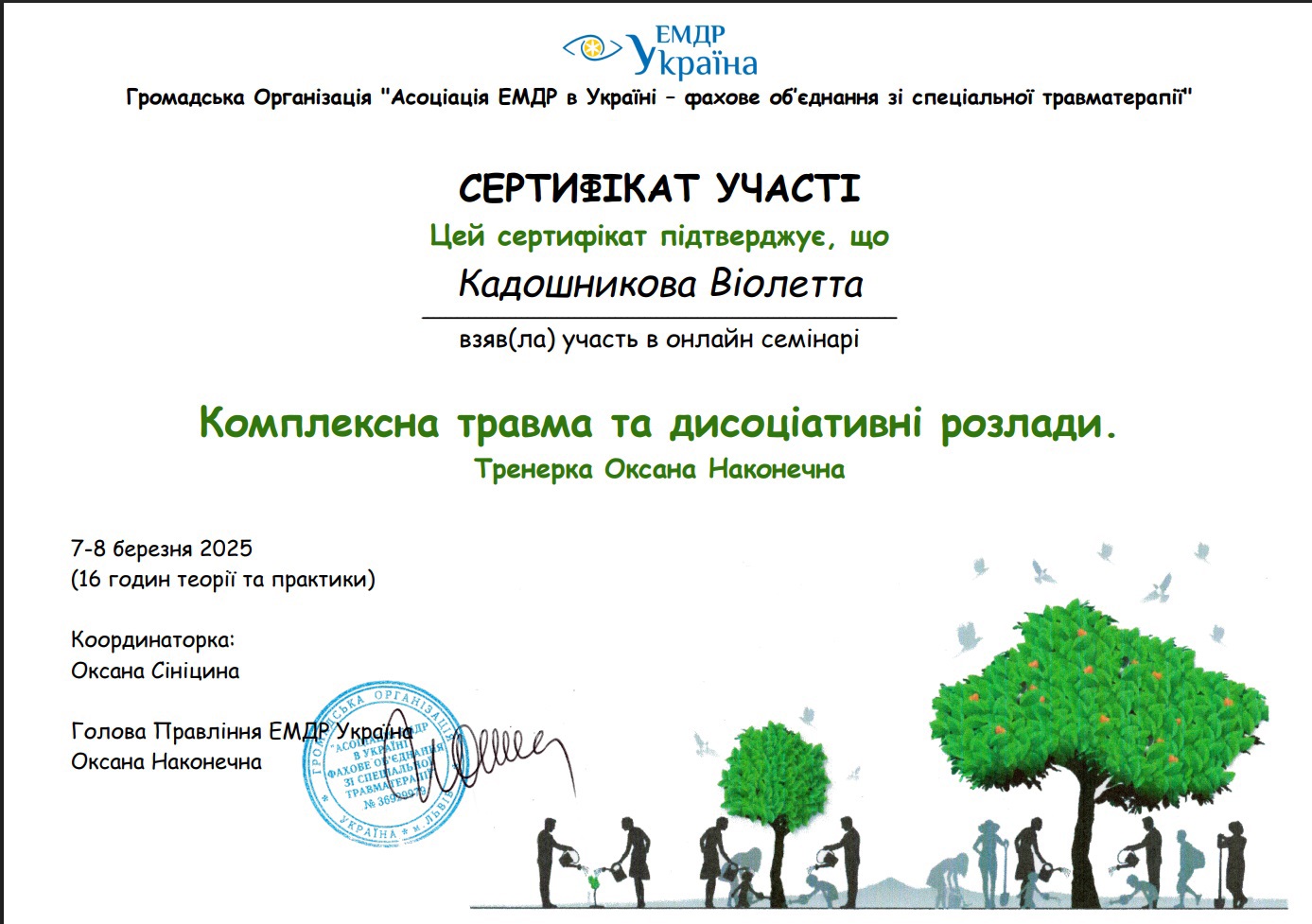 • Сертификат УСП «Международный научно-практический семинар «Конфронтация травмы методом символ драма (12-13 марта)» с участием Ульриха Загсе (м Геттінген, Німеччина), д.мед.н., професора, психотерапевта, психиатра, психоаналитика, супервизора EMDR, главы Правления и доцента AGKB, научного сотрудника клиники Асклепія в м. Геттінгені (Asklepios Fachklinikum Göttingen) по психотравмоталогии и психотерапии пограничных растройств личности Borderline, Украина, Германия, (онлайн), 2021 г.