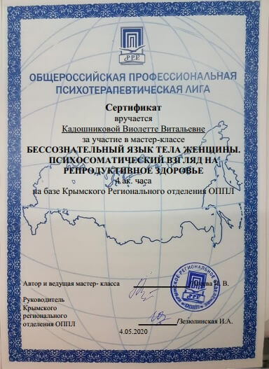 • Сертификат Крымского регионального отделения Всероссийской профессиональной психотерапевтической лиги, «Бессознательный язык тела женщины. Психосоматический взгляд на репродуктивное здоровье (04 мая)» Крым, Россия, (онлайн), 2020 г.