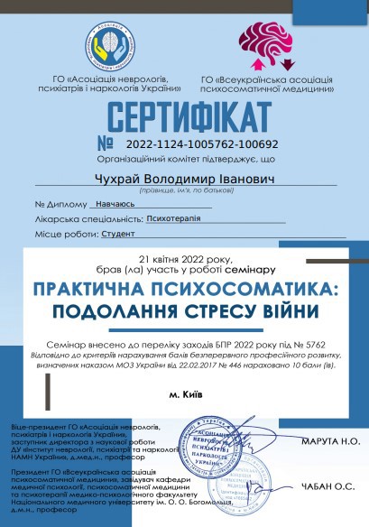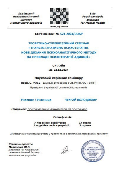 – Трускавецкая школа психотерапии на 4 году обучения (5 летний проект), направление психоанализ.