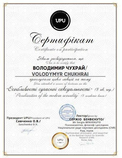 - - Львовский психоаналитический институт ментального здоровья, продолжаю обучение 3 год (4-летний проек), направление психоанализ.