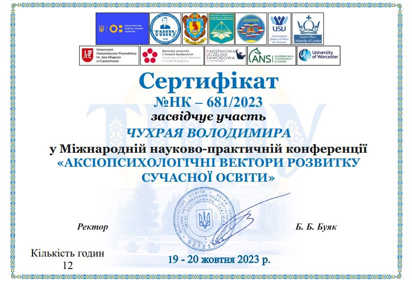 - Международная научно-практическая конференция «АКСИОПСИХОЛОГИЧЕСКИЕ ВЕКТОРЫ РАЗВИТИЯ СОВРЕМЕННОГО ОБРАЗОВАНИЯ 19-20 октября 2023 год.