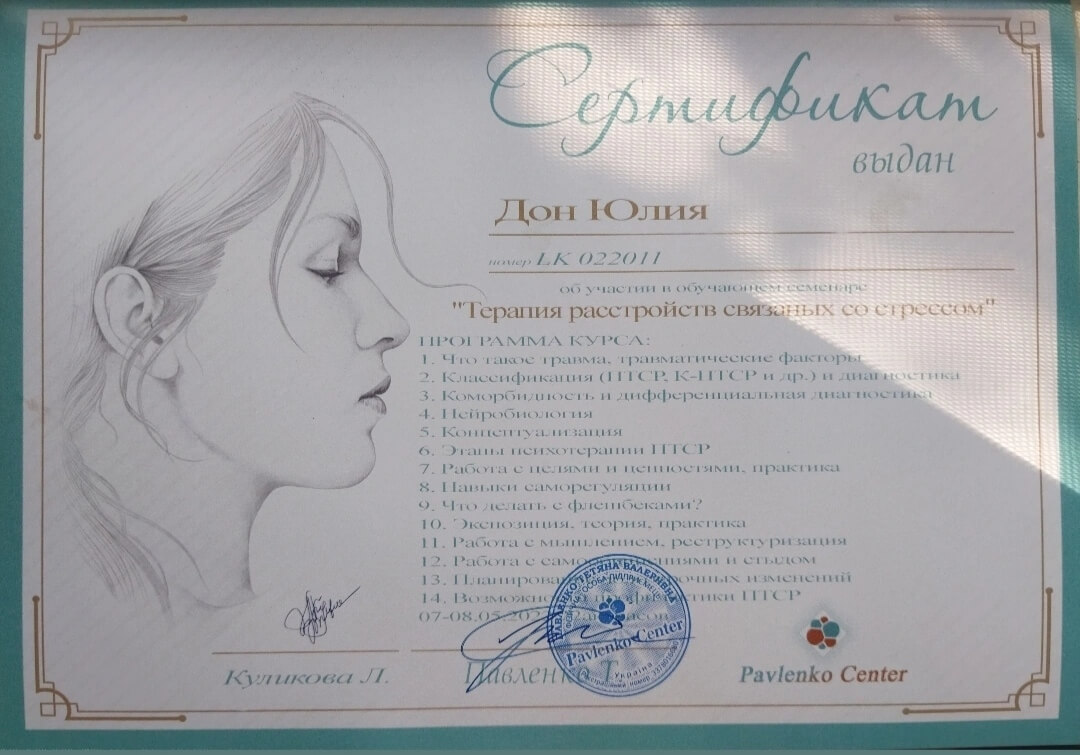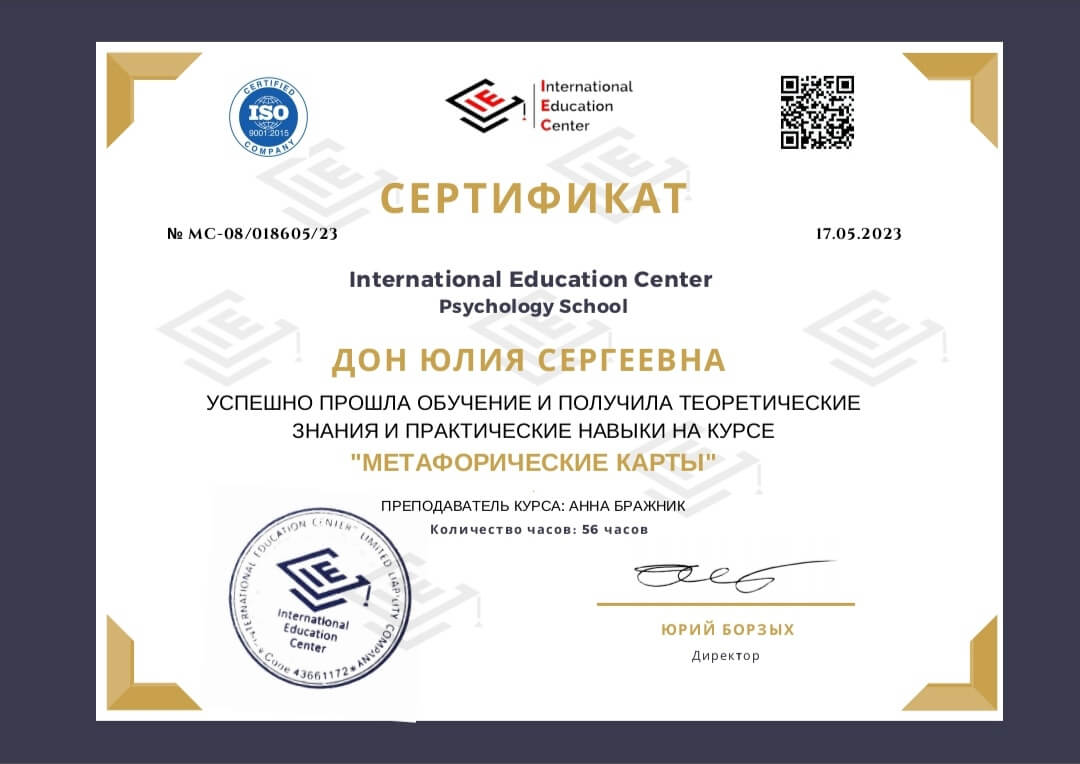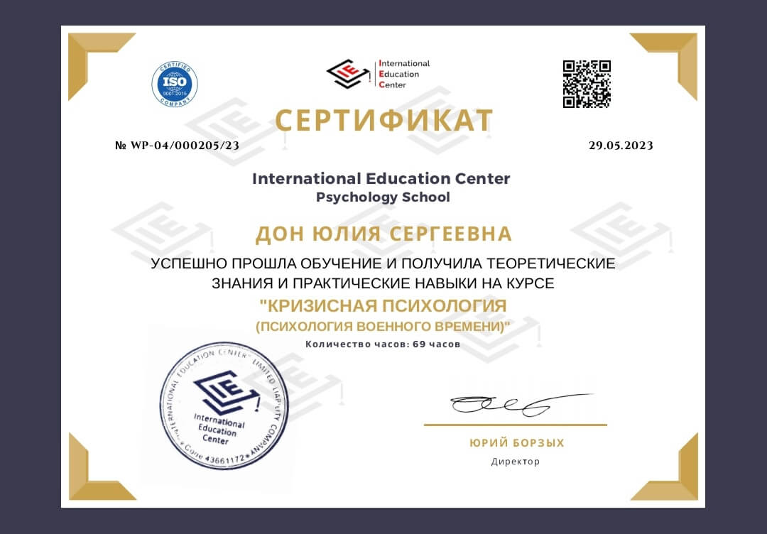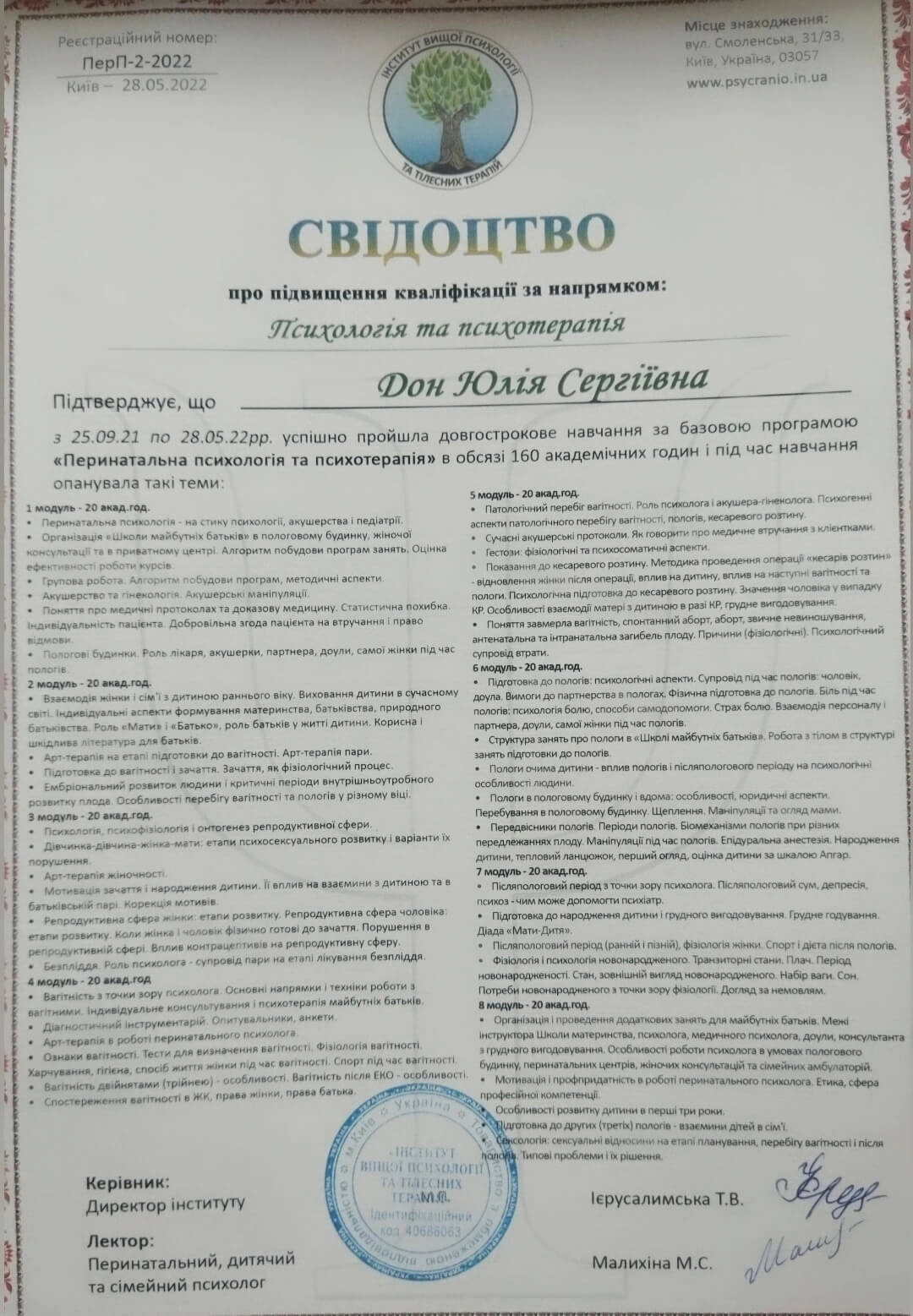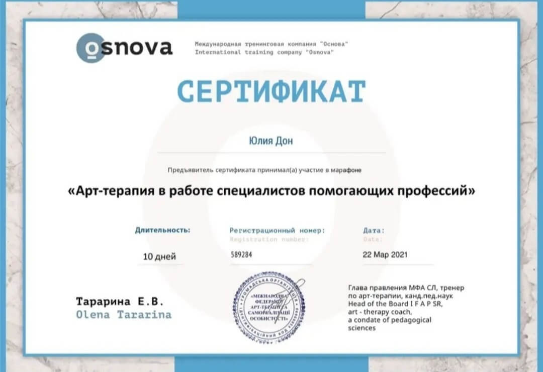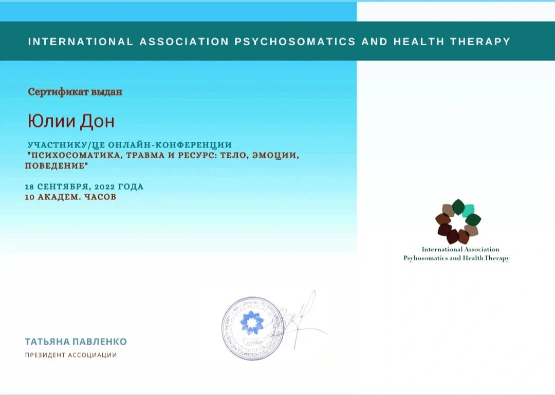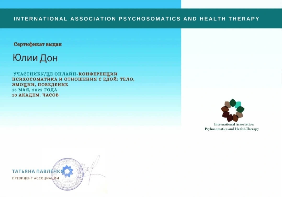 2020-2021 Теория и практика гештальт-терапии 2021 - ... II степень гештальт-терапии 2021-2022 Перинатальный психолог и психотерапевт