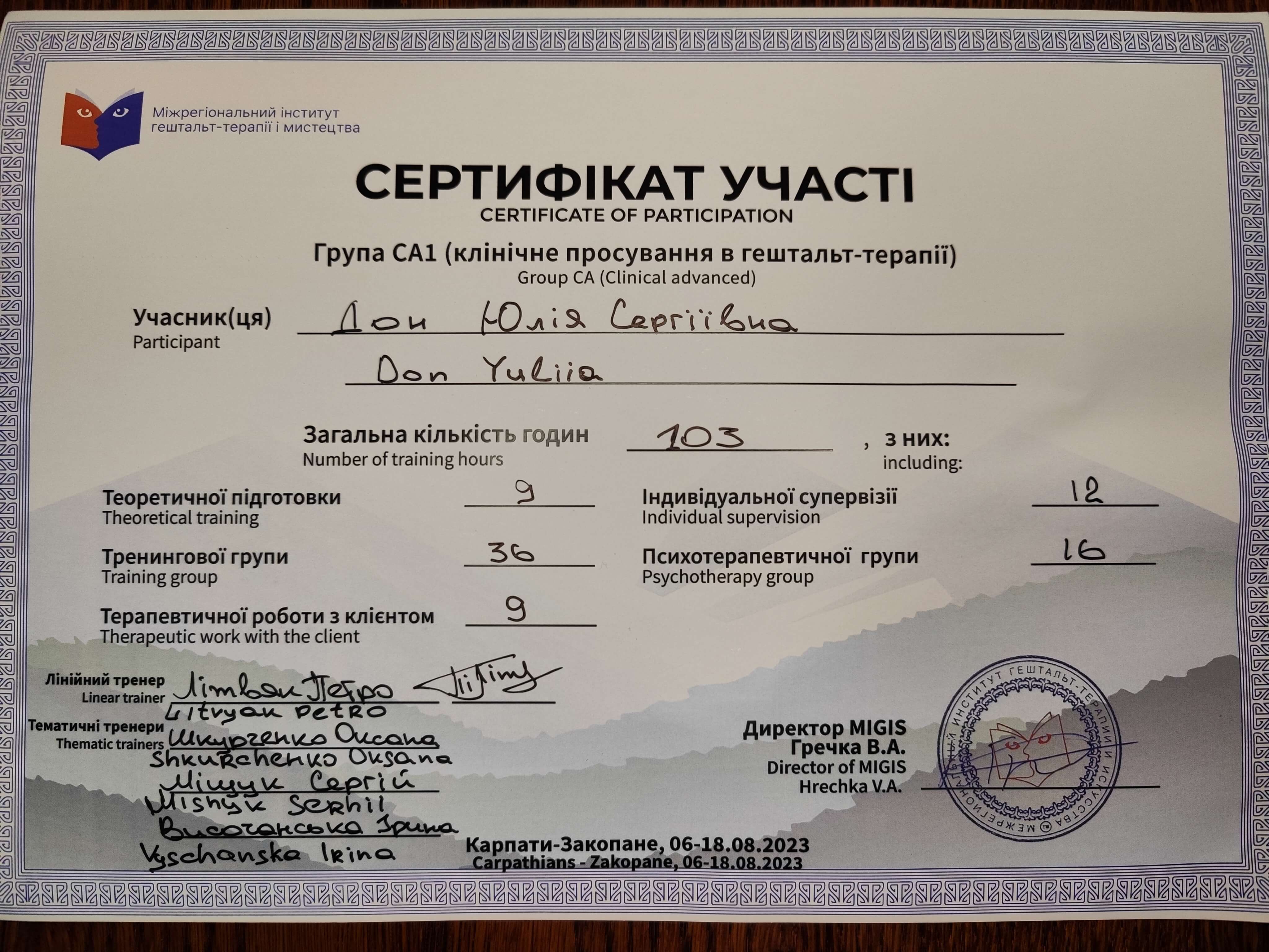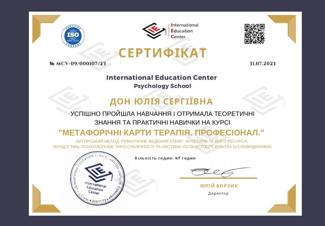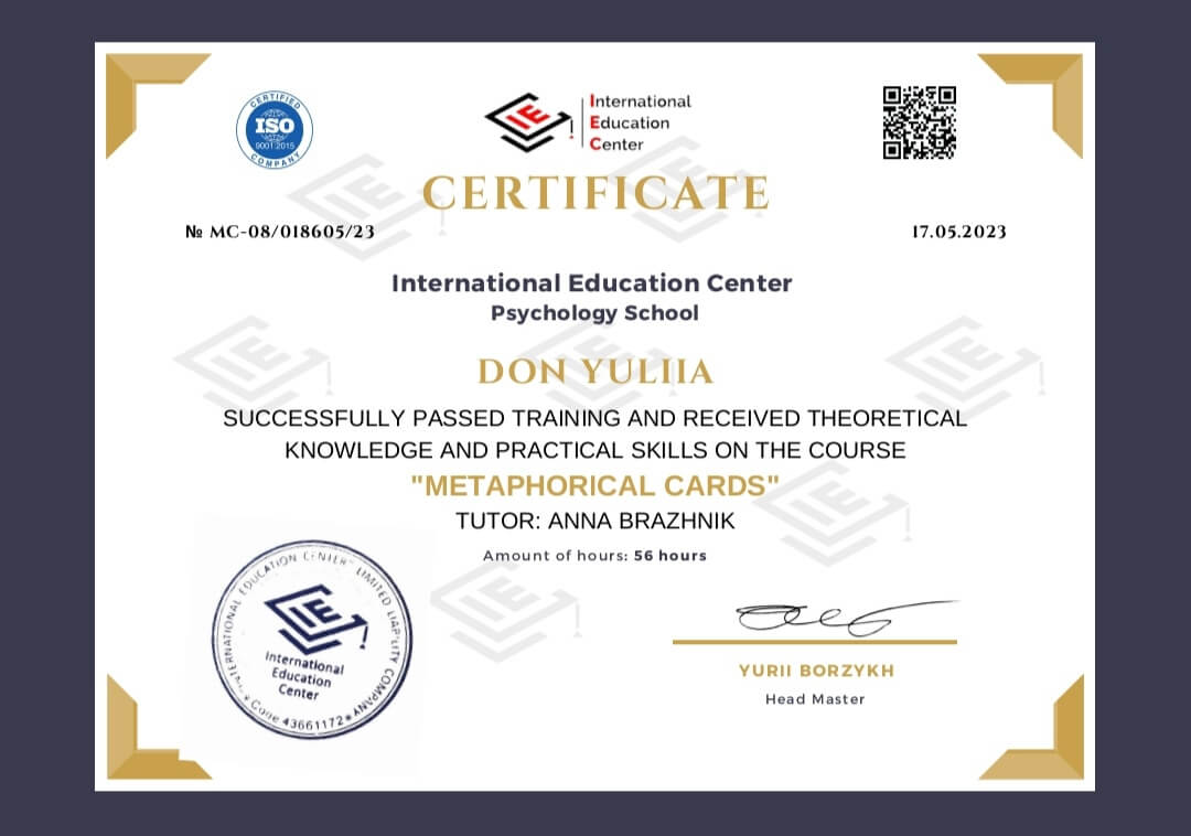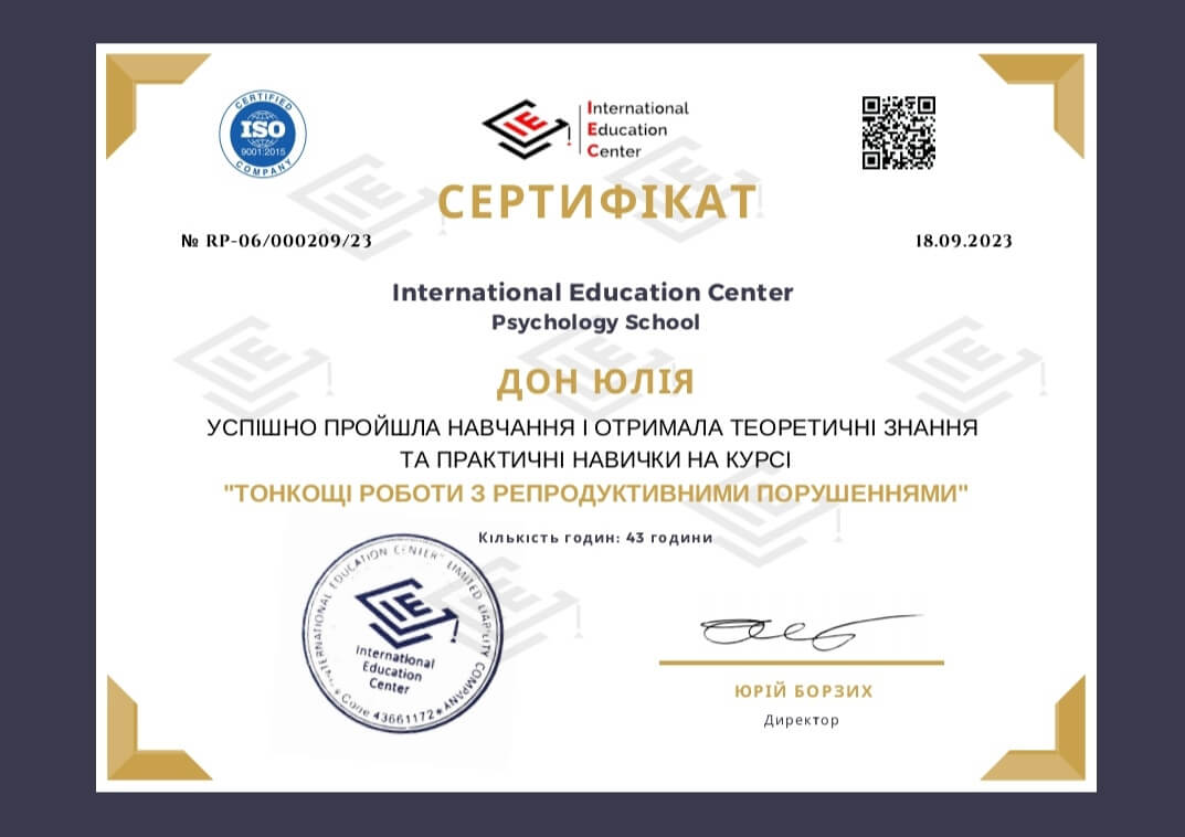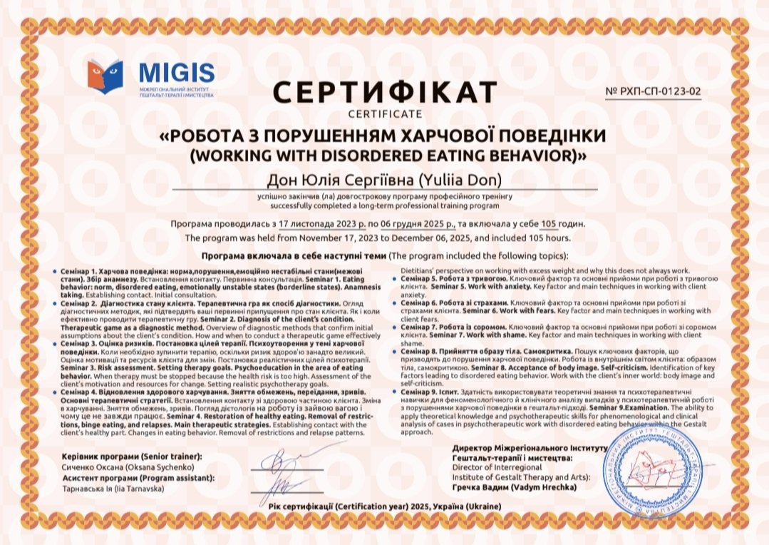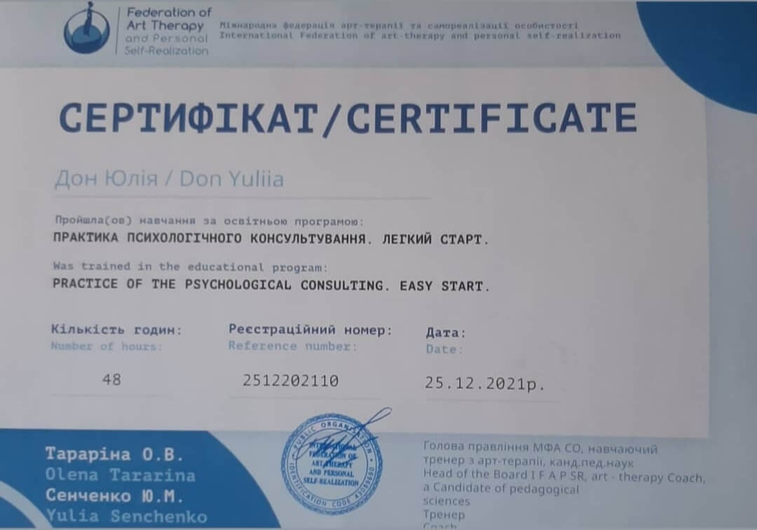 2020-2021 Теория и практика гештальт-терапии 2021 - ... II степень гештальт-терапии 2021-2022 Перинатальный психолог и психотерапевт