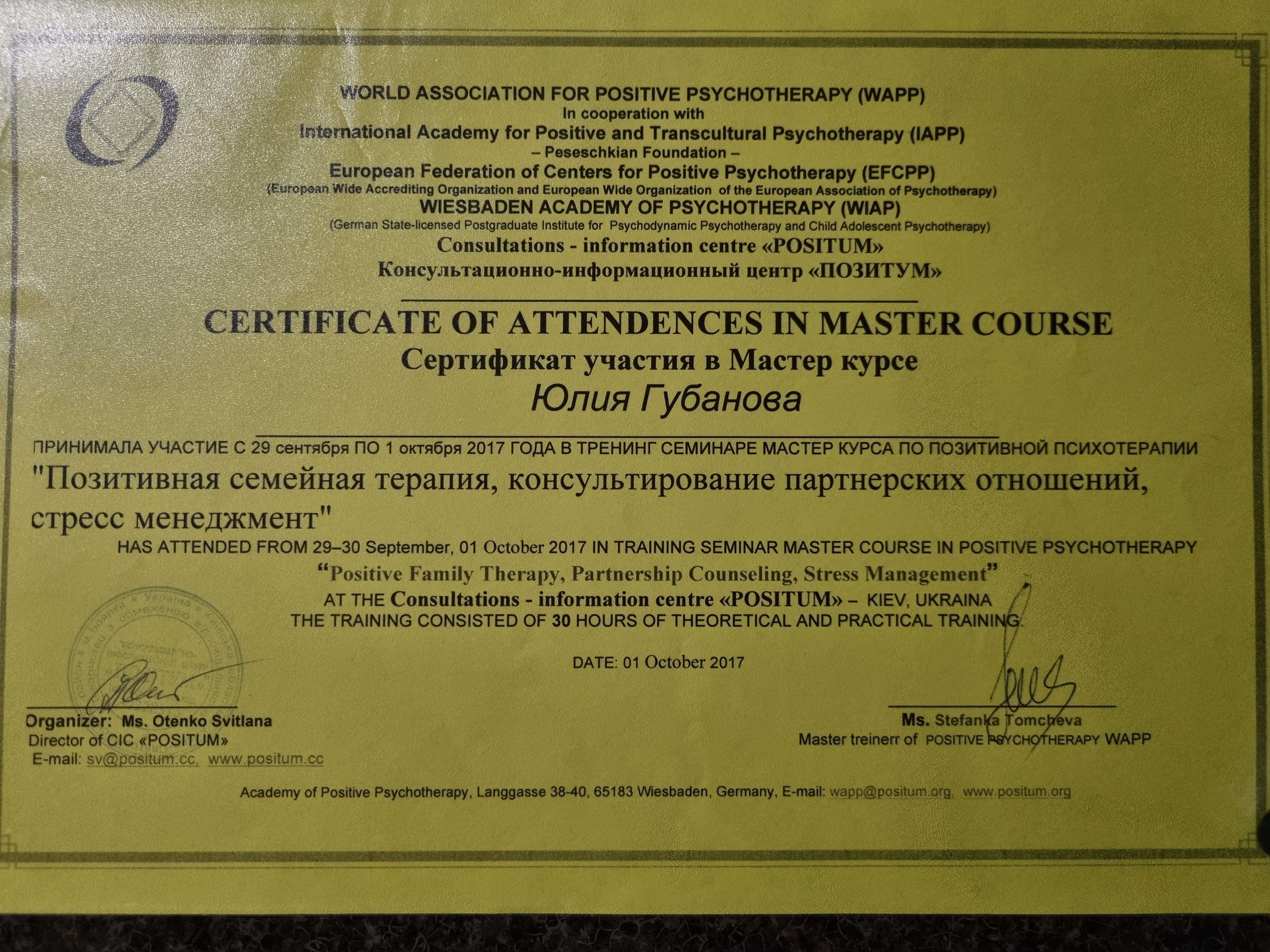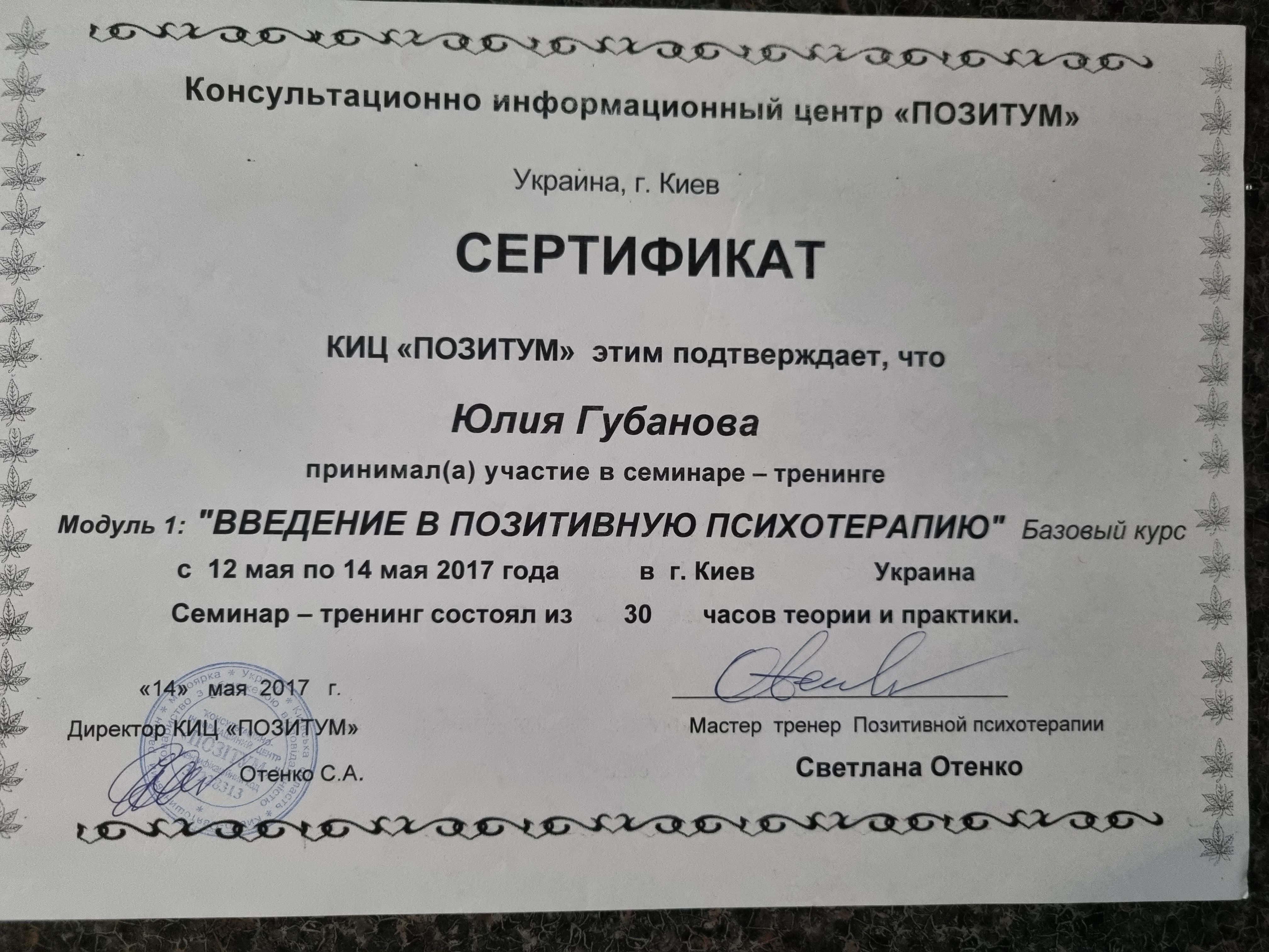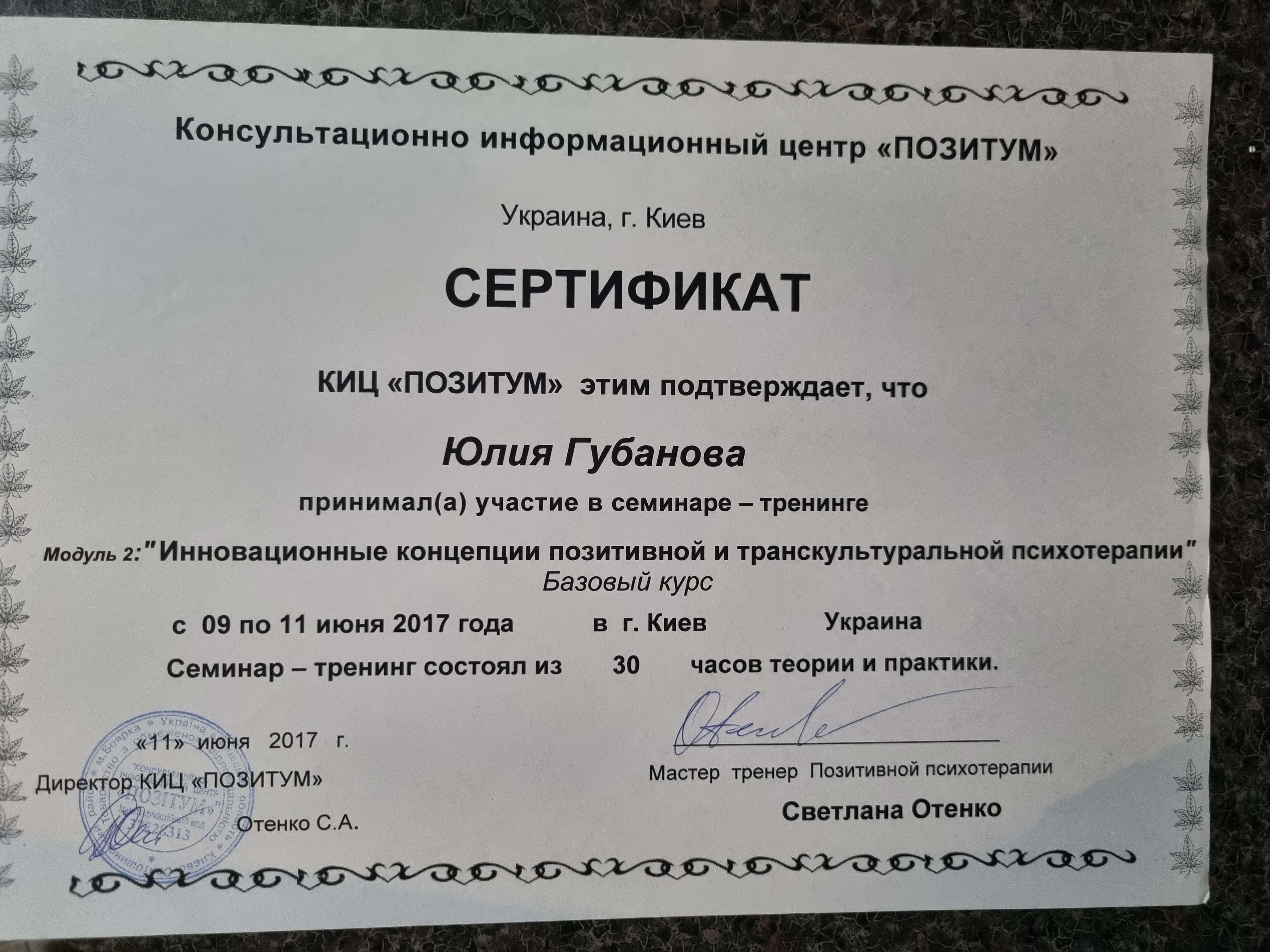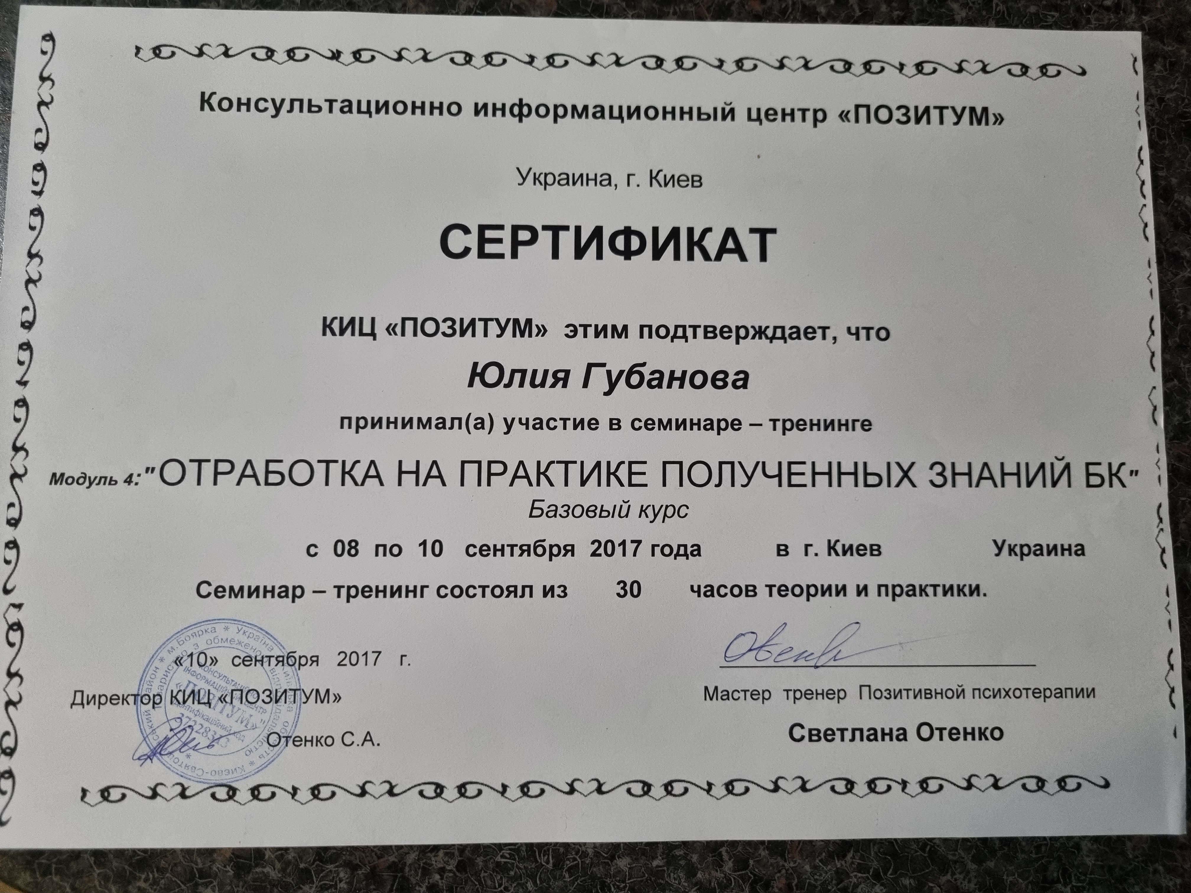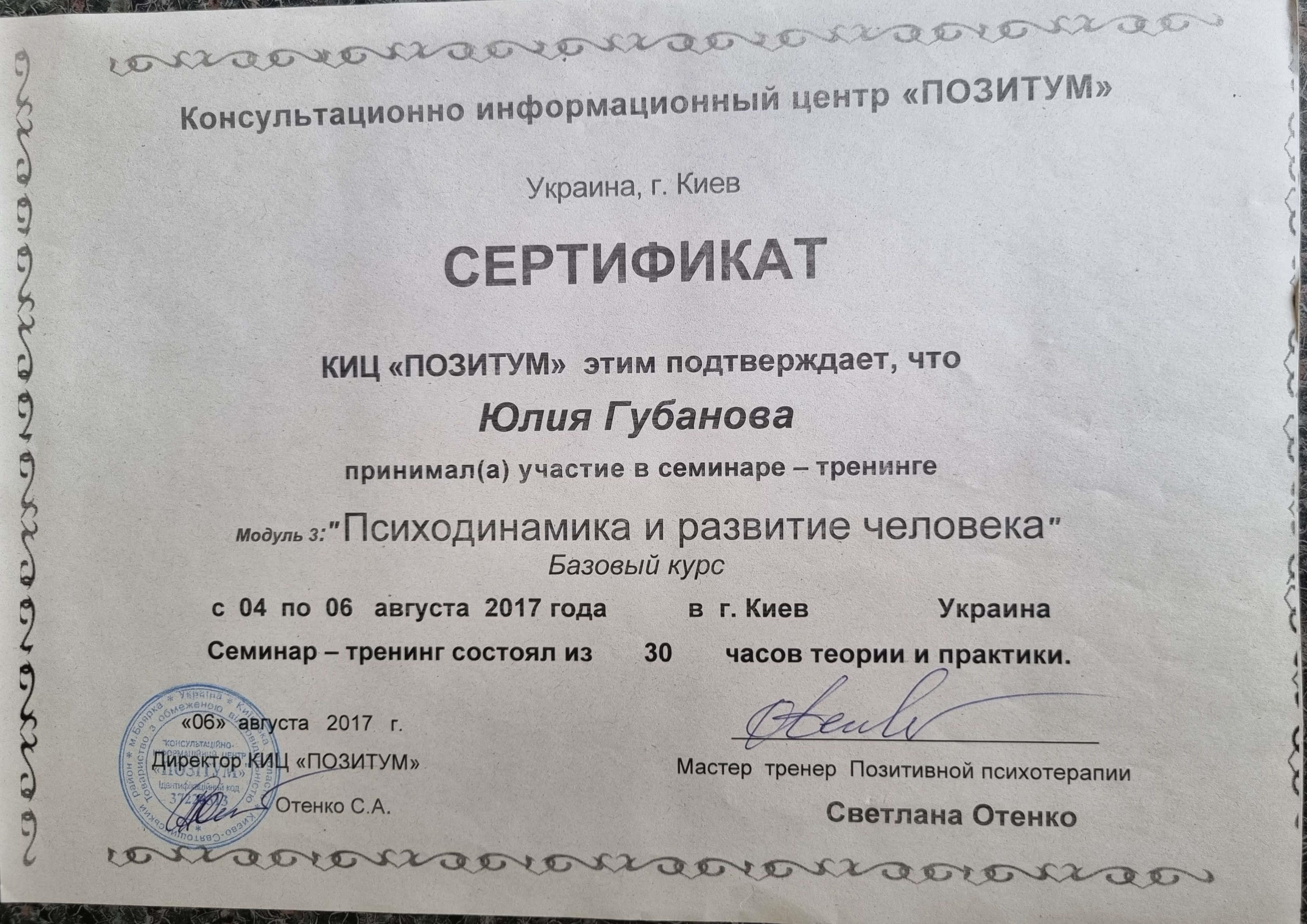 Киевский государственный университет им Т.Г.Шевченко; Открытый Международный университет развития человека "Украина"; Висбаденская Академия Транскультуральной Позитивной психотерапии; Межрегиональный институт гештальт-терапии и искусства; Открытый институт психоанализа