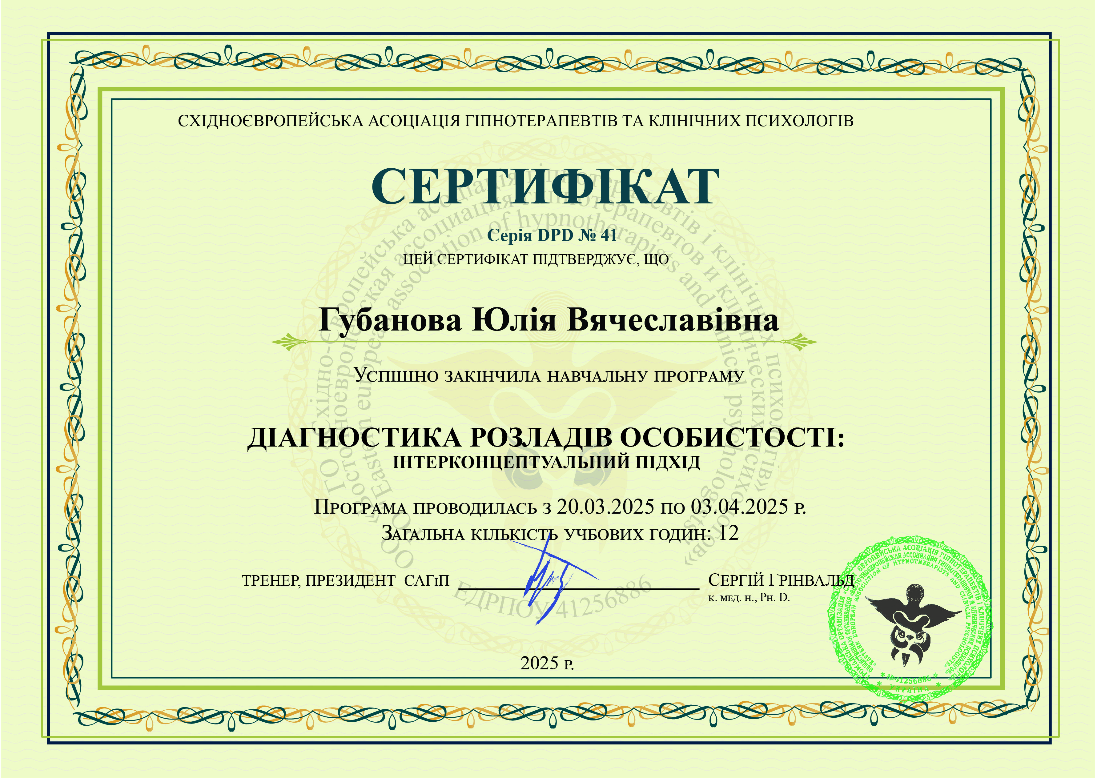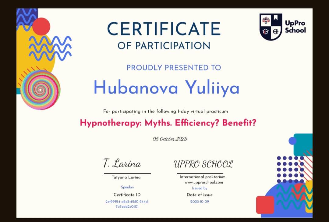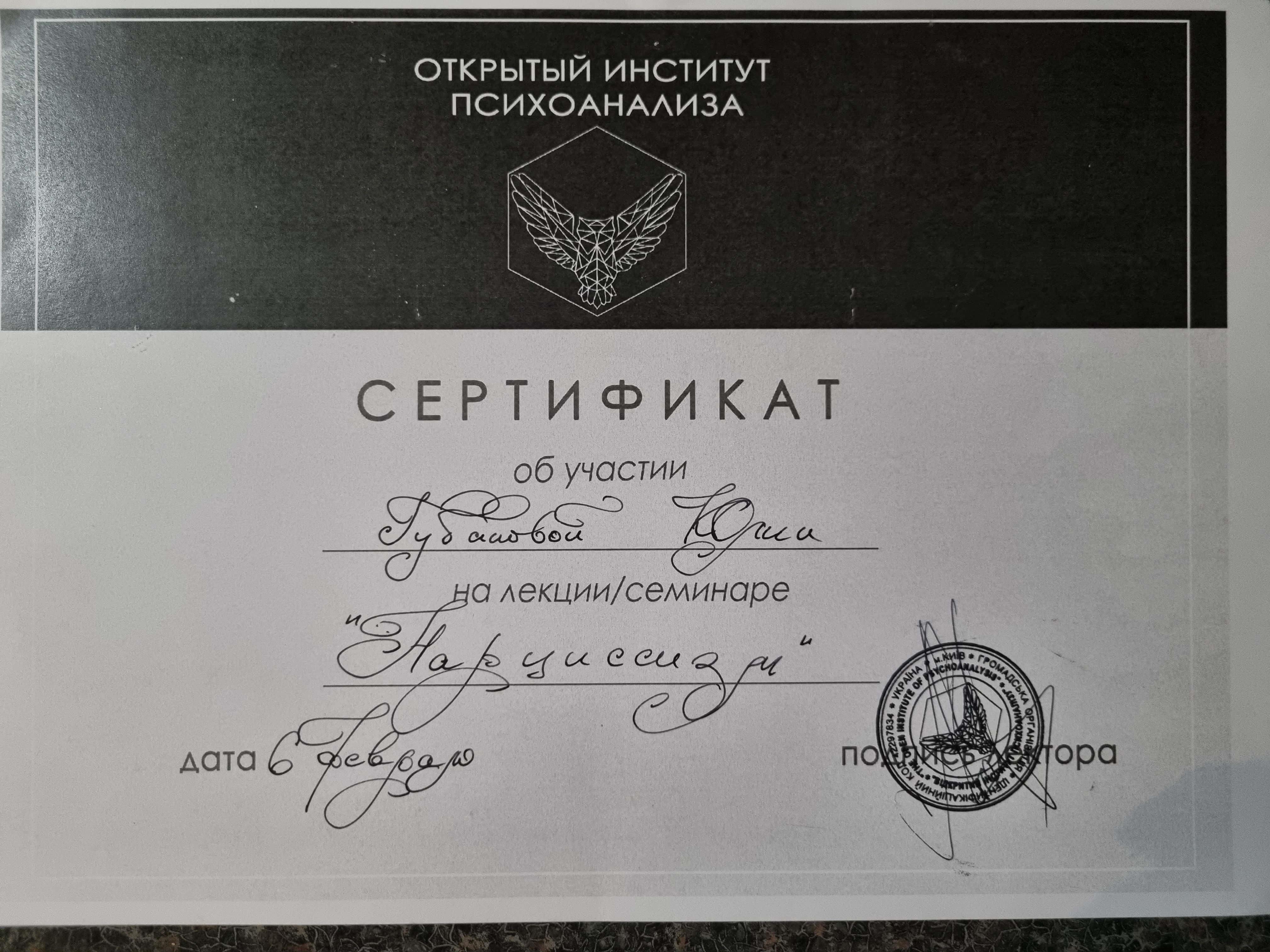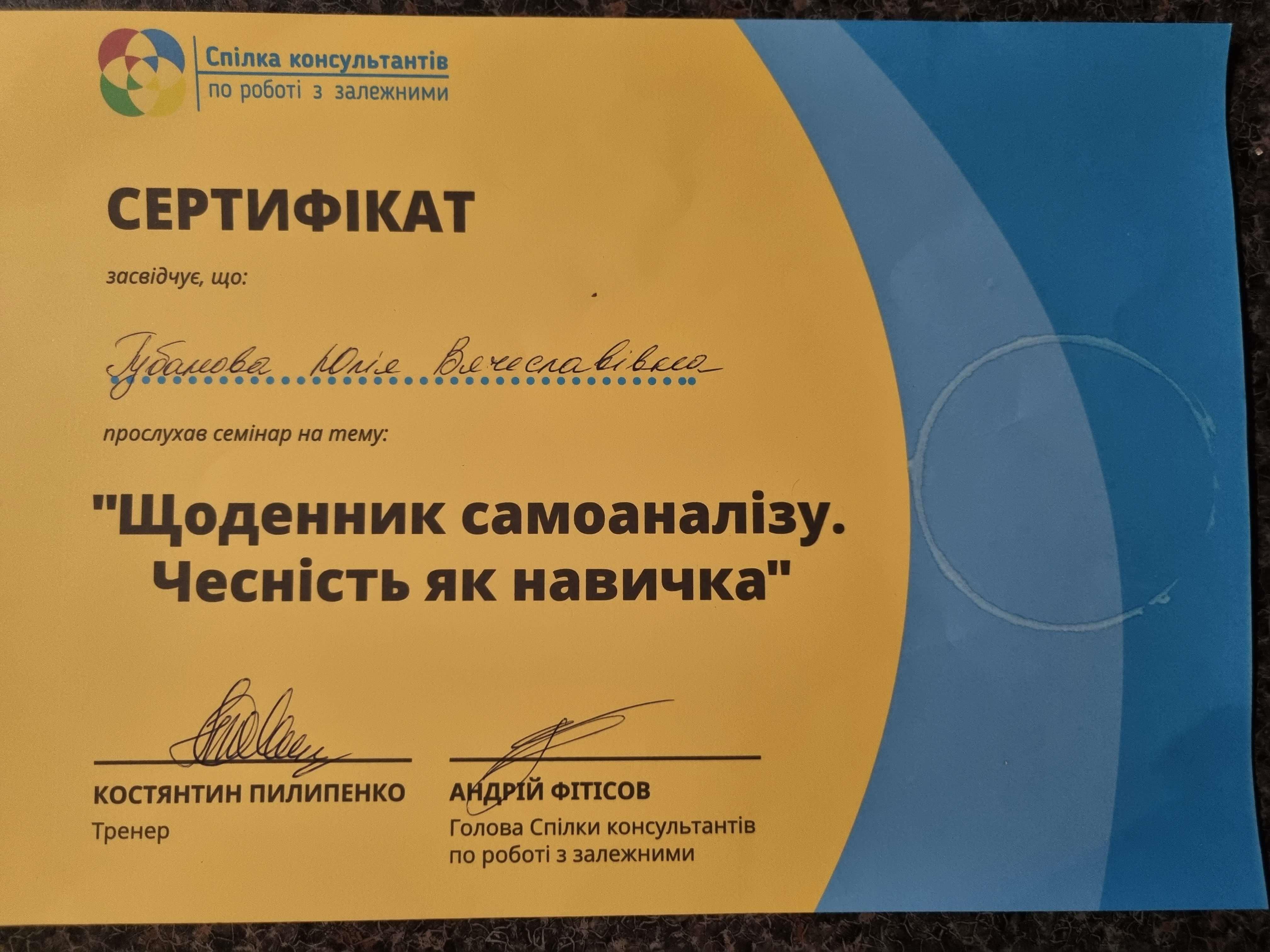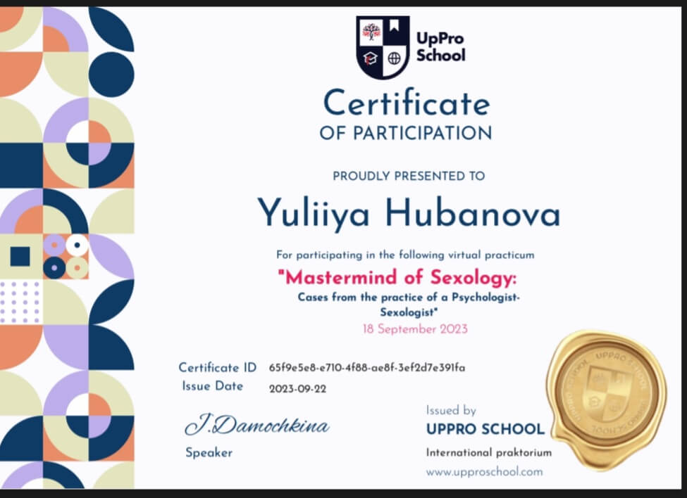 Киевский государственный университет им Т.Г.Шевченко; Открытый Международный университет развития человека "Украина"; Висбаденская Академия Транскультуральной Позитивной психотерапии; Межрегиональный институт гештальт-терапии и искусства; Открытый институт психоанализа