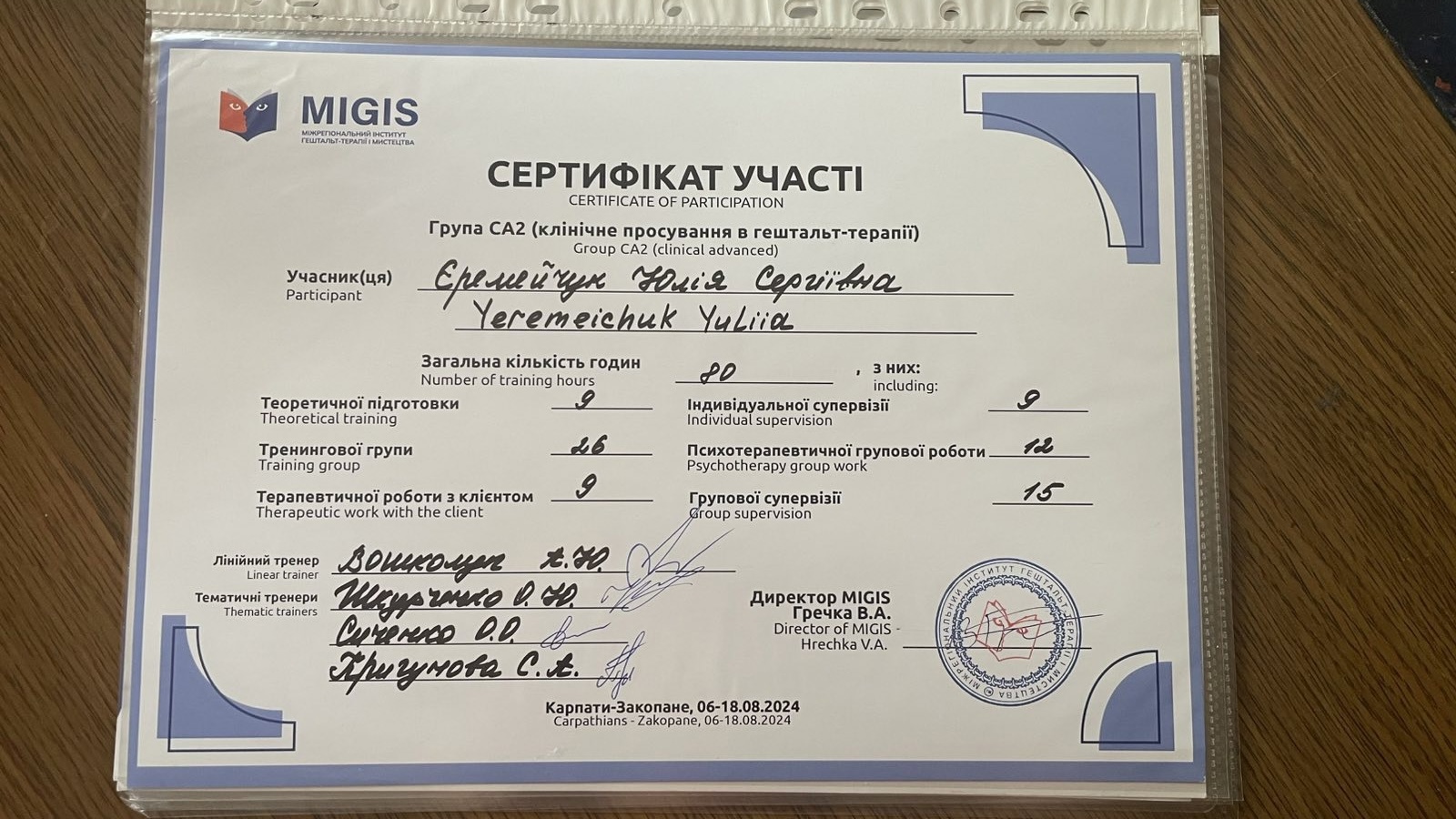 Межрегиональный институт гештальт – терапии и искусства (МИГИС), программа подготовки гештальт – терапевтов специализация "Терапия зависимых отношений" с 2021 по 2025 год.