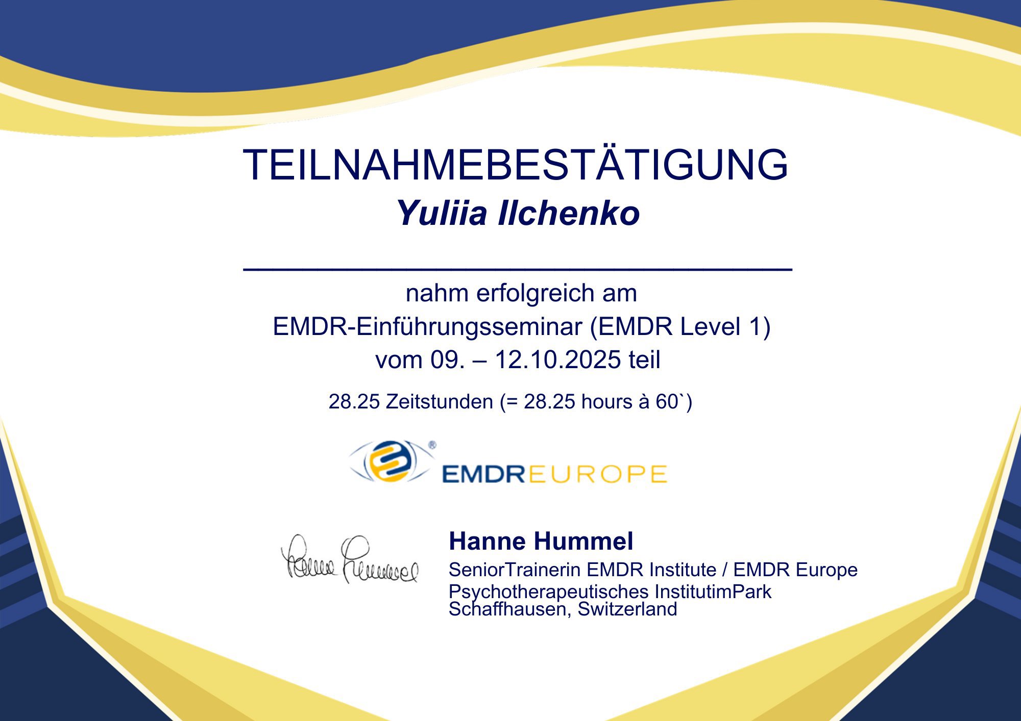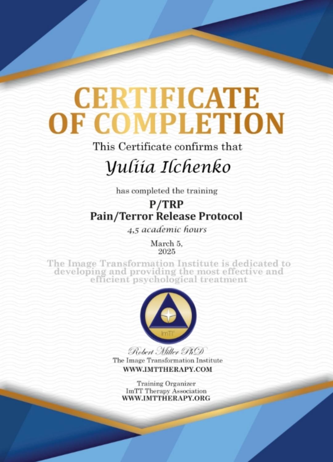 • International Psychology School, 2025 – психологическая помощь при военной травме.