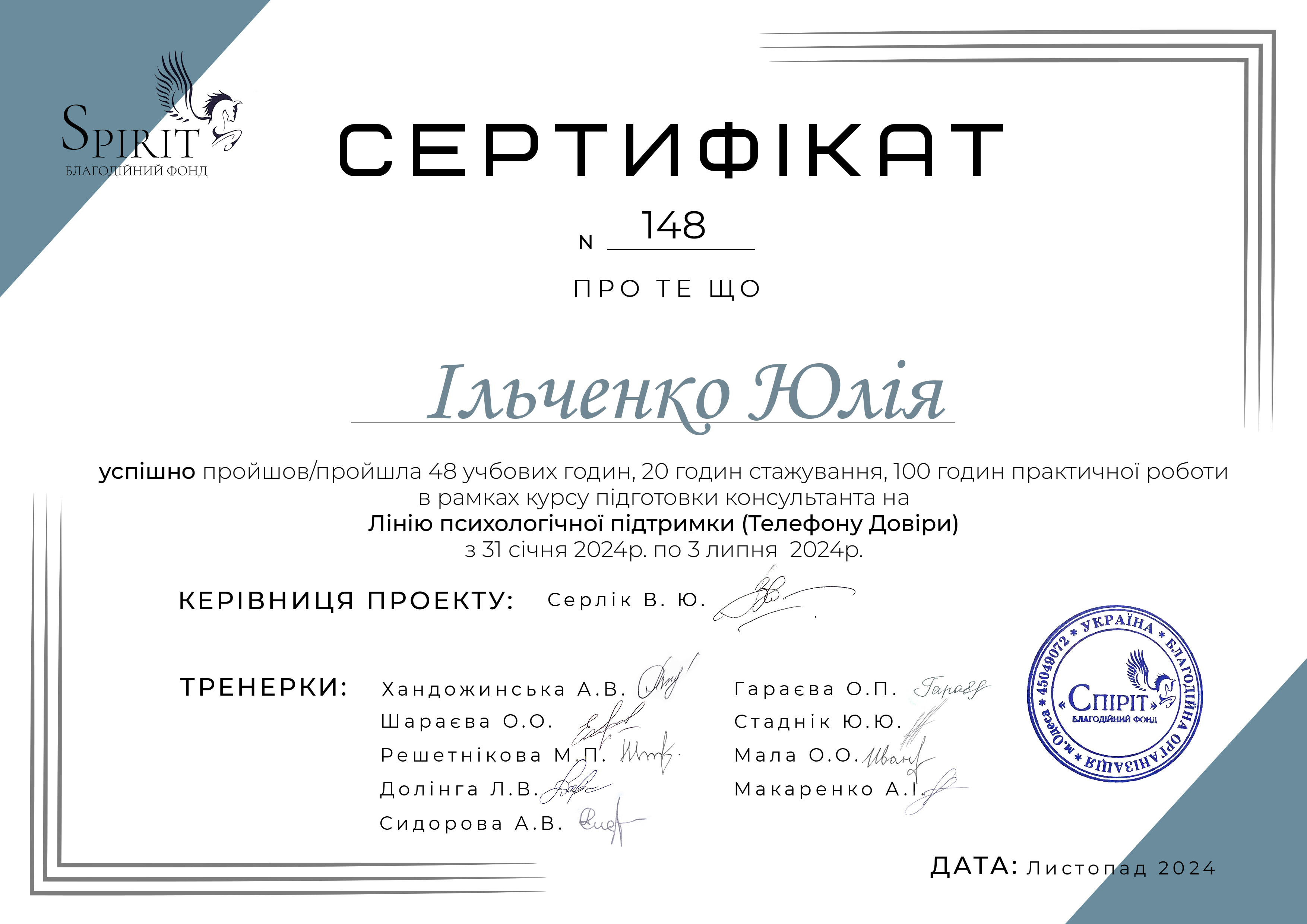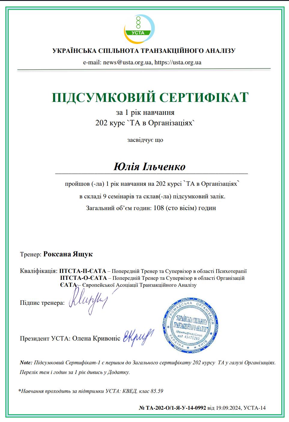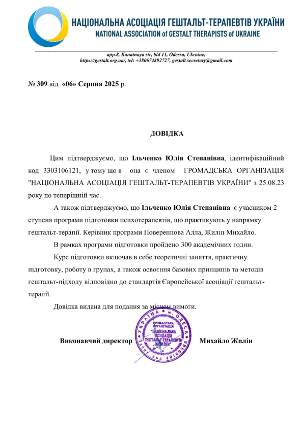 НАГТУ (Национальная ассоциация гештальт-терапевтов Украины), 2023-2027, гештальт-терапевт, ІІ степень.