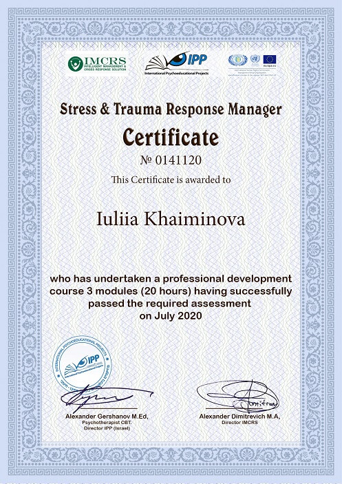2021 г. - настоящее время: Национальный университет «Одесская юридическая академия» специальность 053 - психология, (2021 г. – настоящее время).