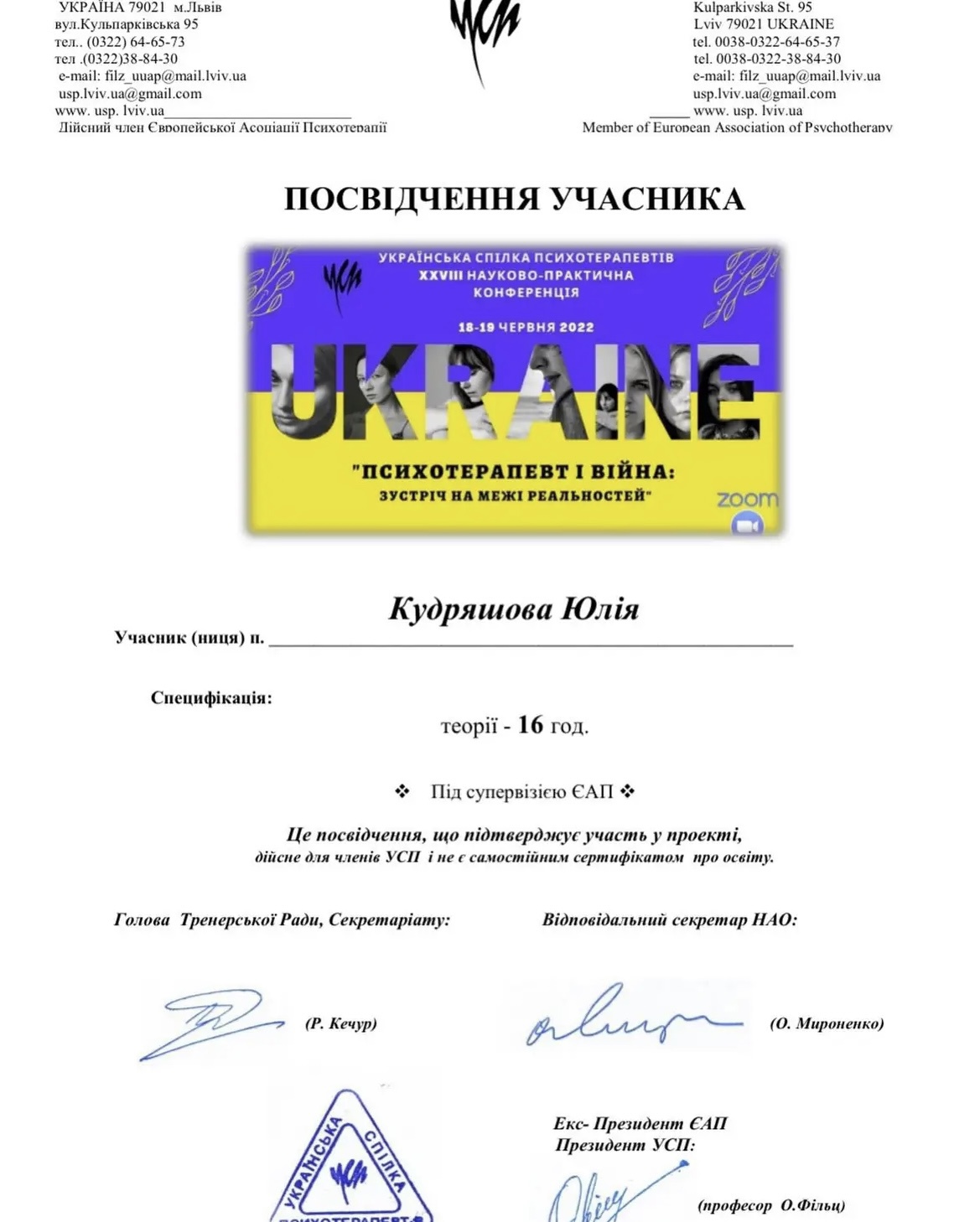 Я закончила Институт профессионального обучения и получила диплом «Семейный практикующий психолог», затем получила сертификат НАГТУ по направлению «Гештальт терапия». Имею специализацию (не менее 180 часов каждая):