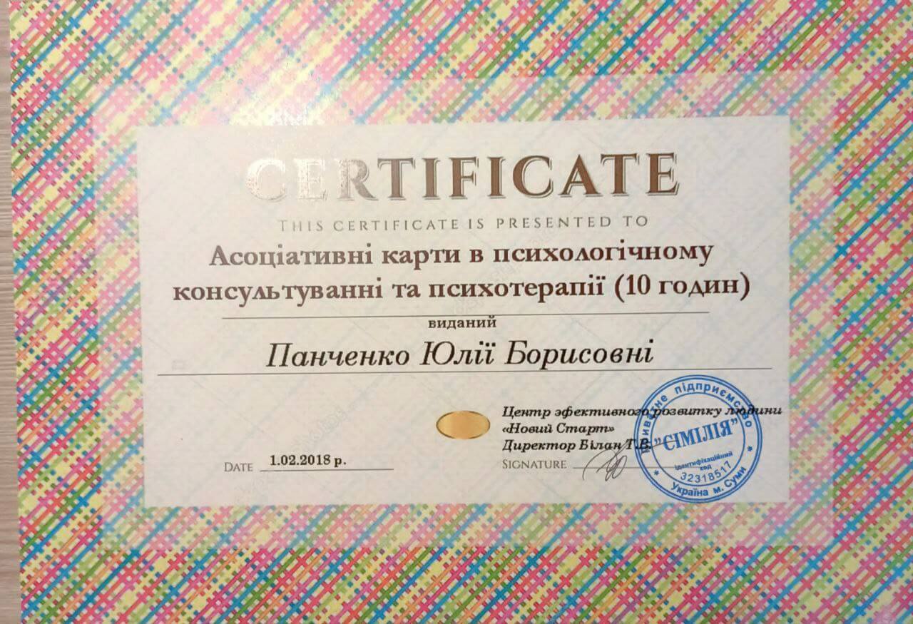 - специализация «Клиническая психология и терапия травмы» ( Международный институт последипломного образования, совместная украинско-американская программа "Психологическое консультирование" (Риджент, США и ЗВО "Международный институт последипломного образования, Украина), интернатура в Центре Open doors", Киев)