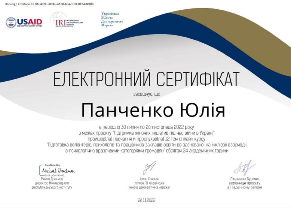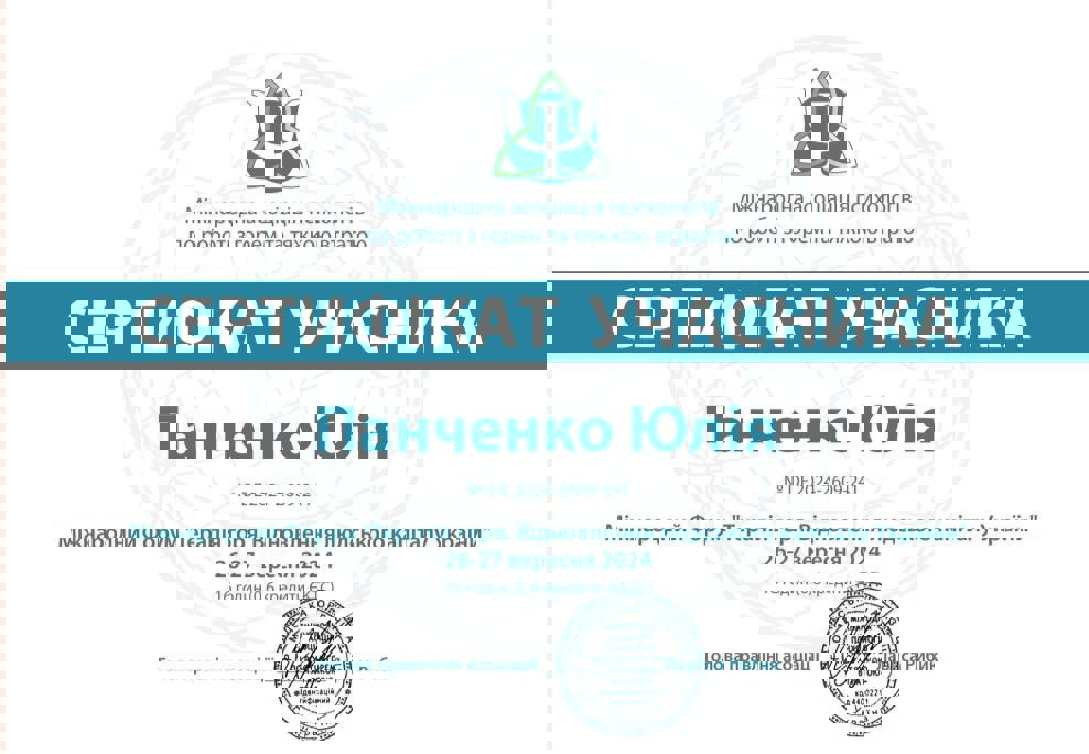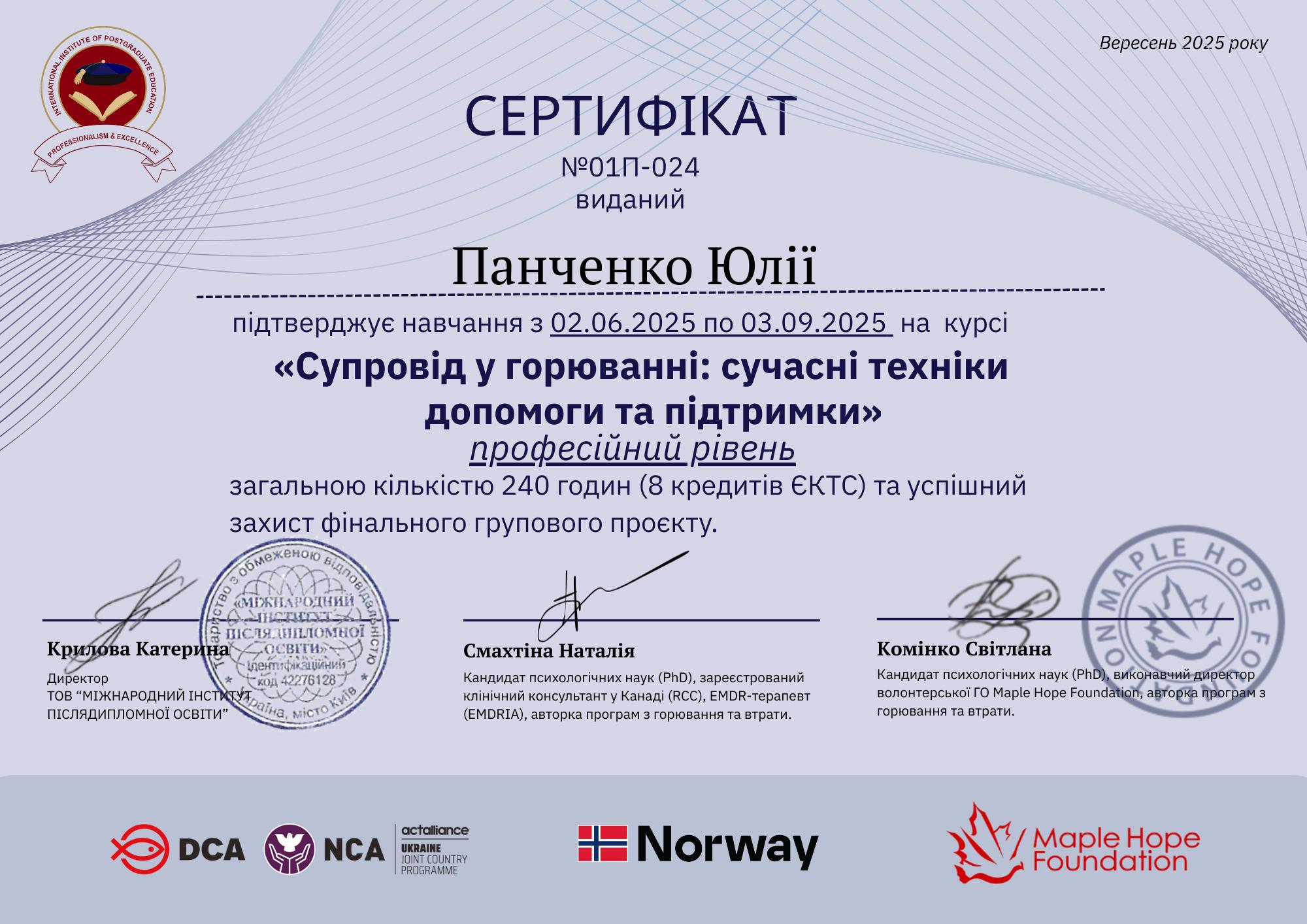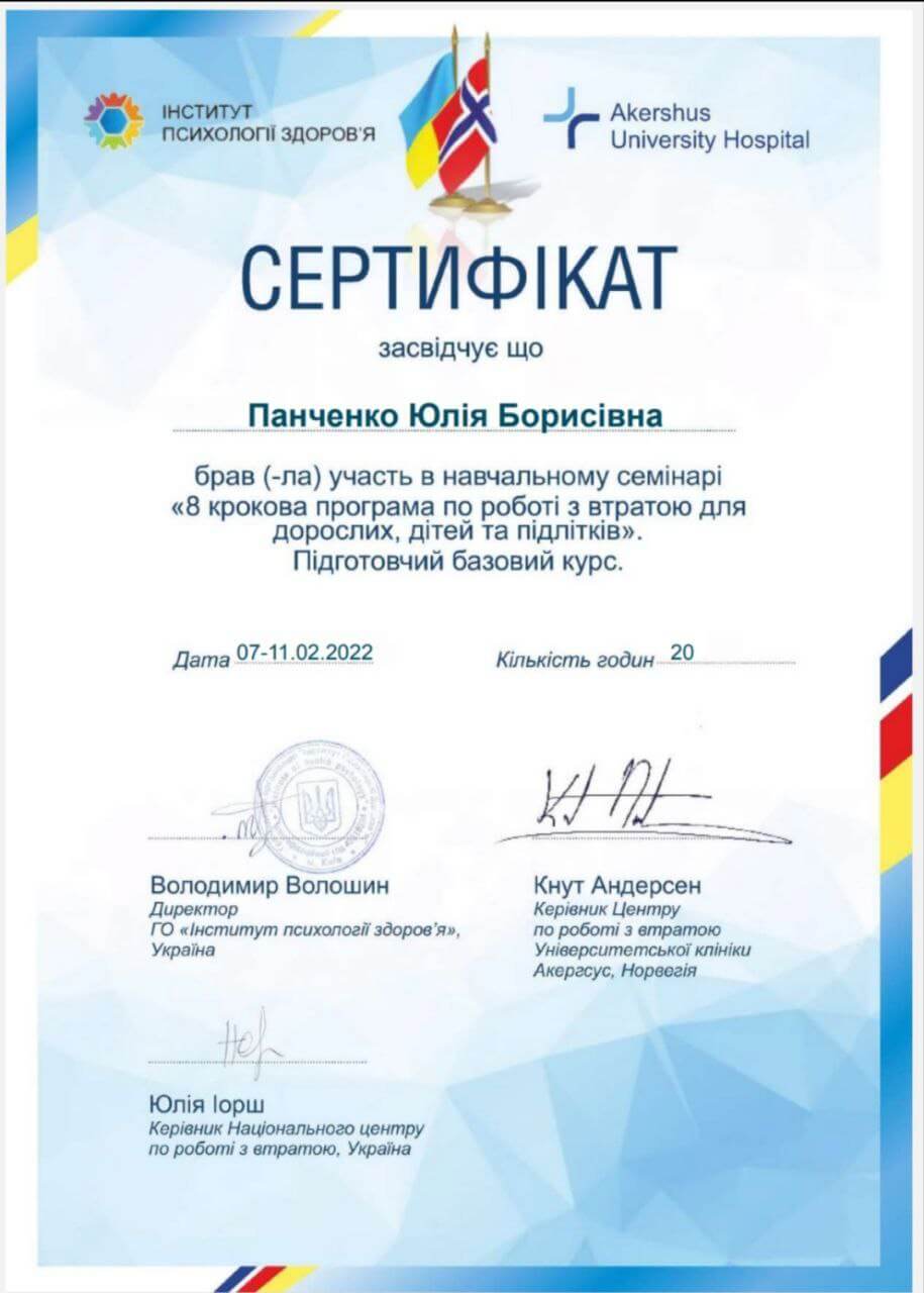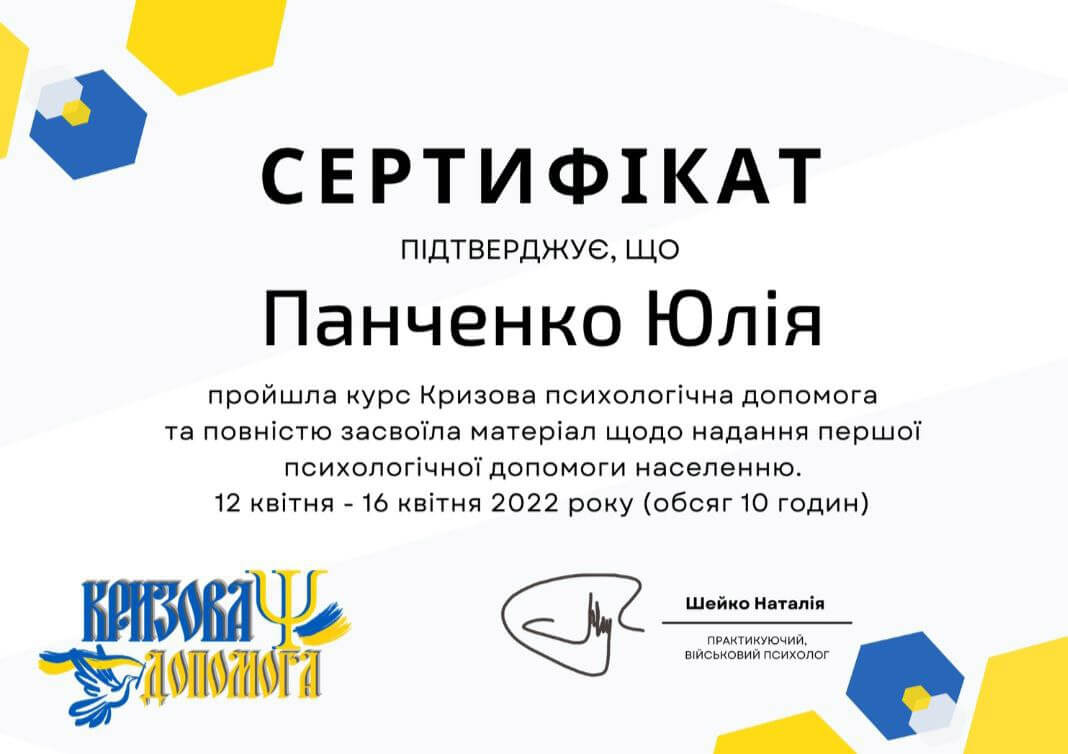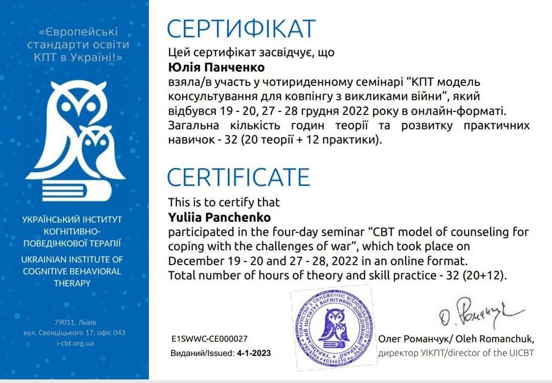 - обучение «КПТ модель консультирования для коупинга с вызовами войны» (Украинский институт КПТ, Львов)