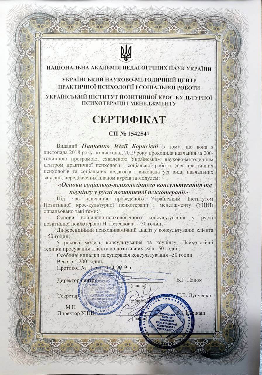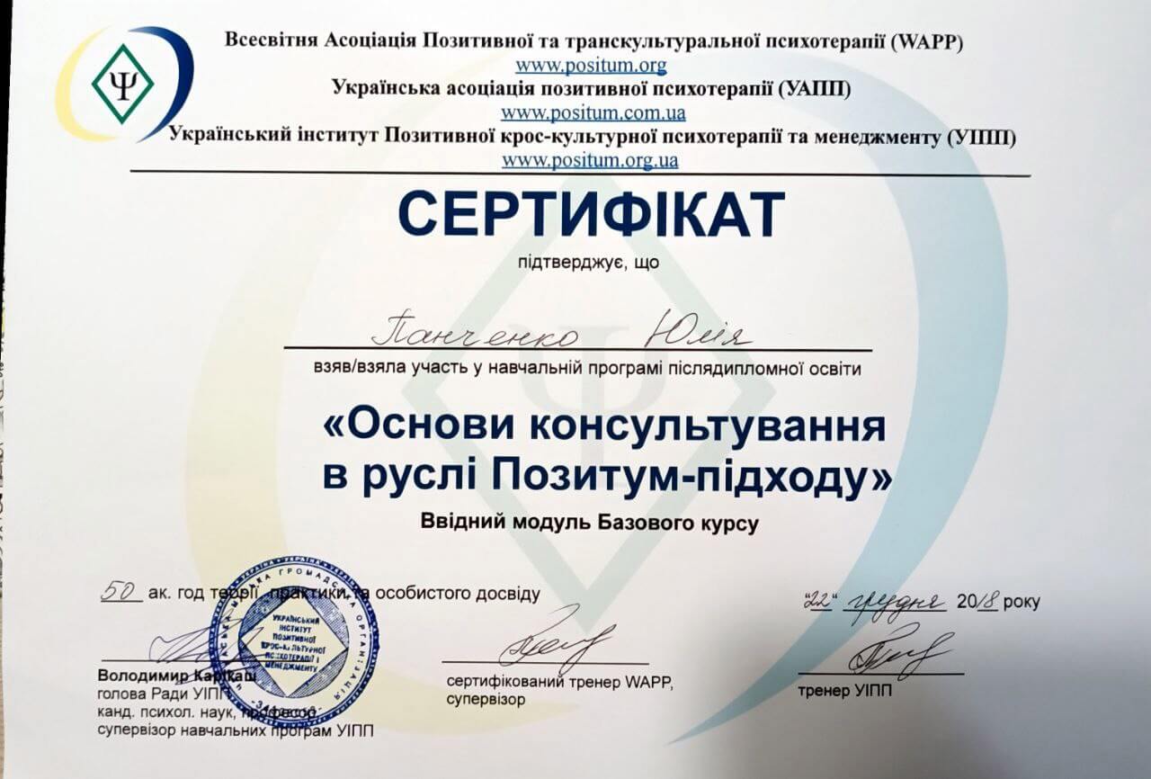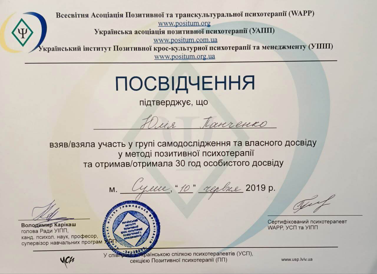 психотерапии (Украинский Институт Позитивной кросс-культурной психотерапии и менеджмента),