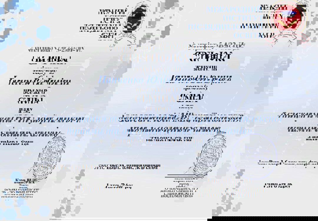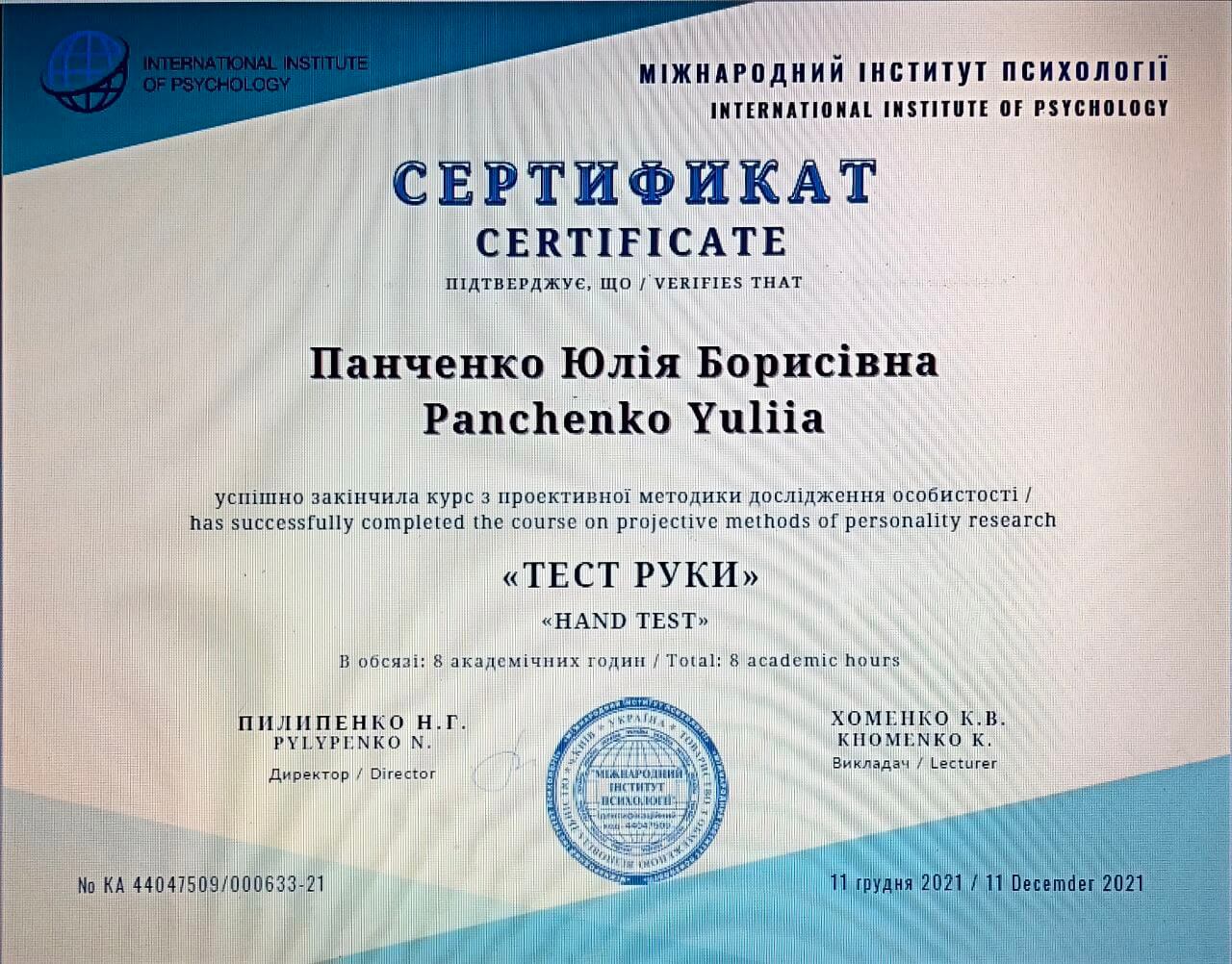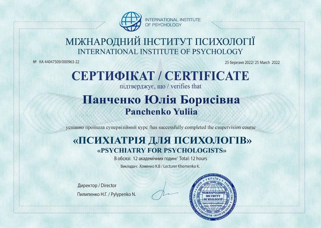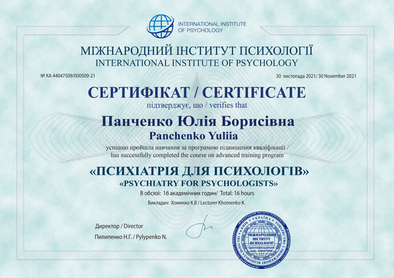 психотерапии (Украинский Институт Позитивной кросс-культурной психотерапии и менеджмента),