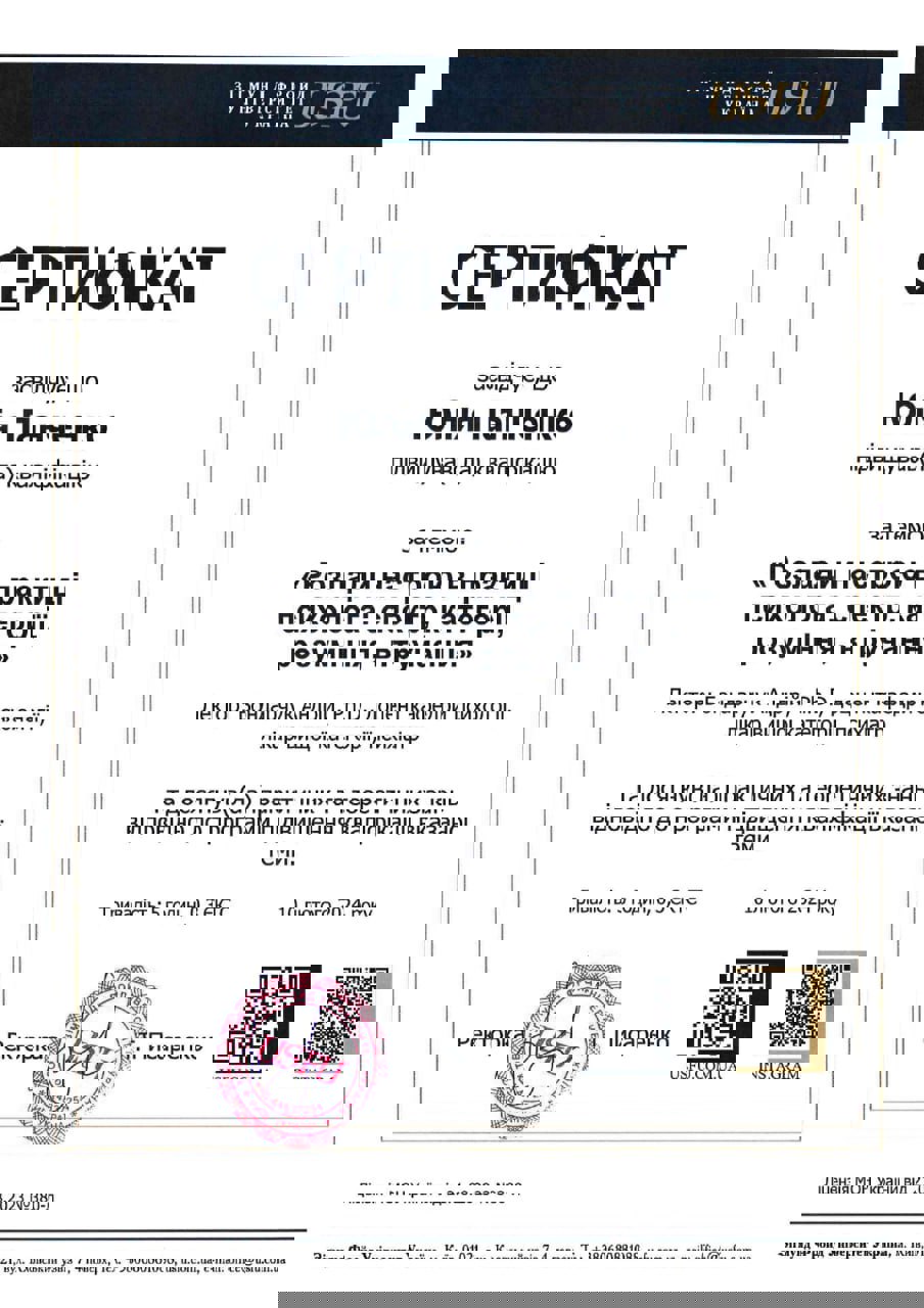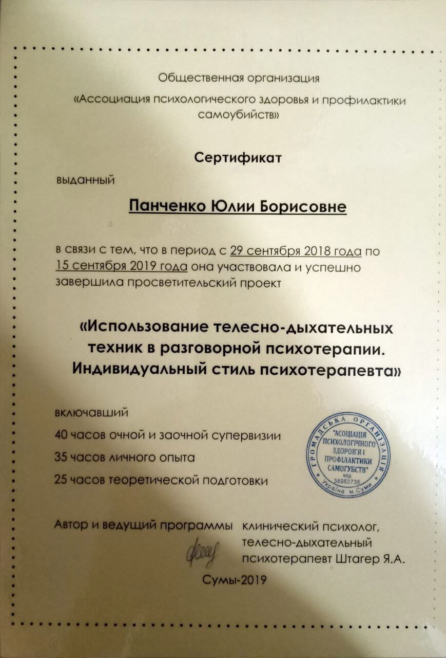 - усвоила курс «Использование телесно-дыхательных техник в разговорной психотерапии» (ОО "Ассоциация психологического здоровья и профилактики самоубийств"),