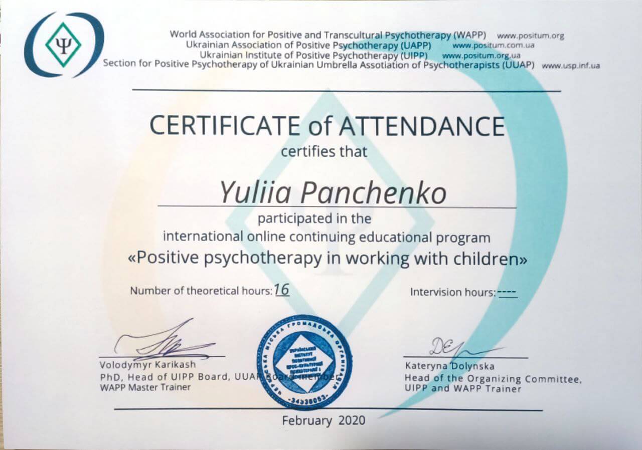 - курс: «Работа с детьми в Позитум подходе»( Всемирная Ассоциация Позитивной и