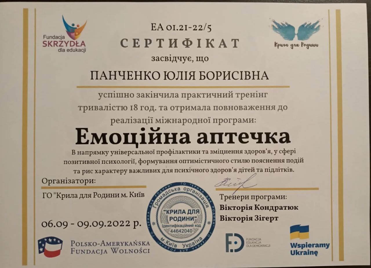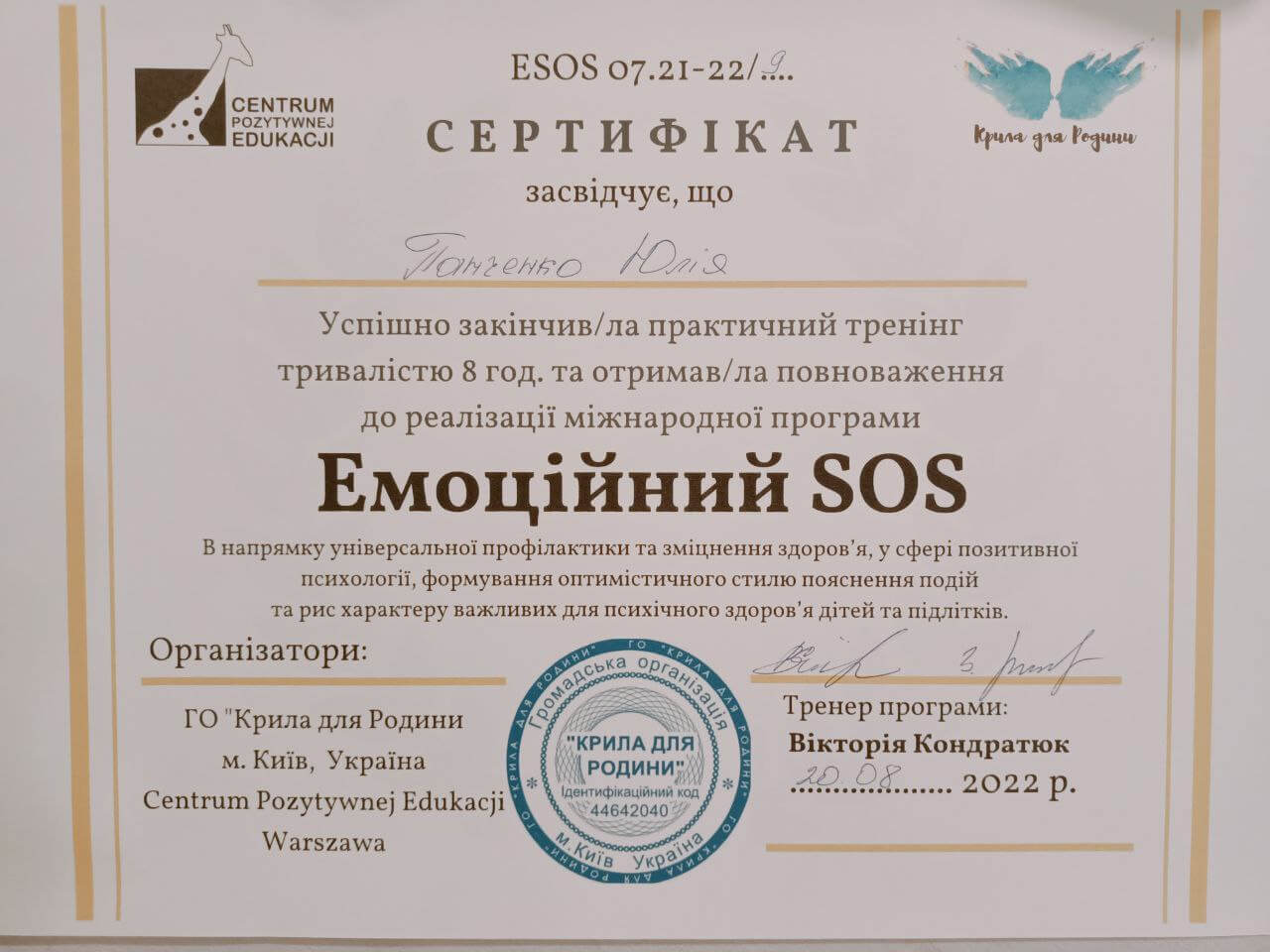 - Прошла обучение и получила полномочия по реализации международных программ «Эмоциональная аптечка», «Эмоциональный SOS» (Фонд «Крылья для Образования», Центр Позитивного Образования, ОО «Крылья для семьи»)