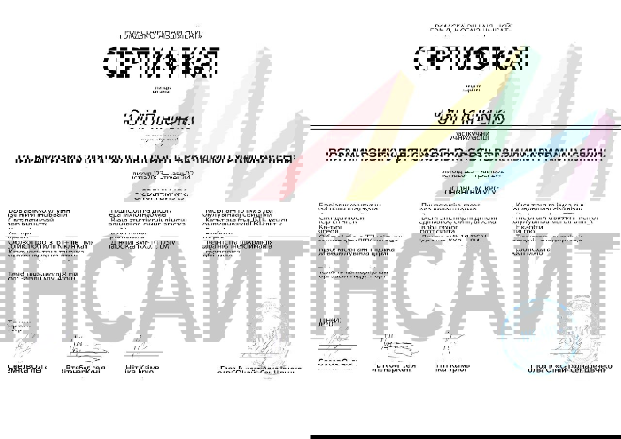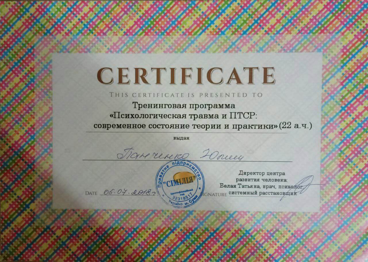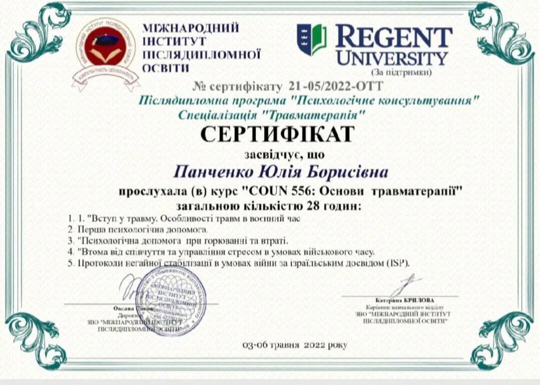 - Курс: «Основы детского консультирования, травматерапия»( Международный институт последипломного образования),