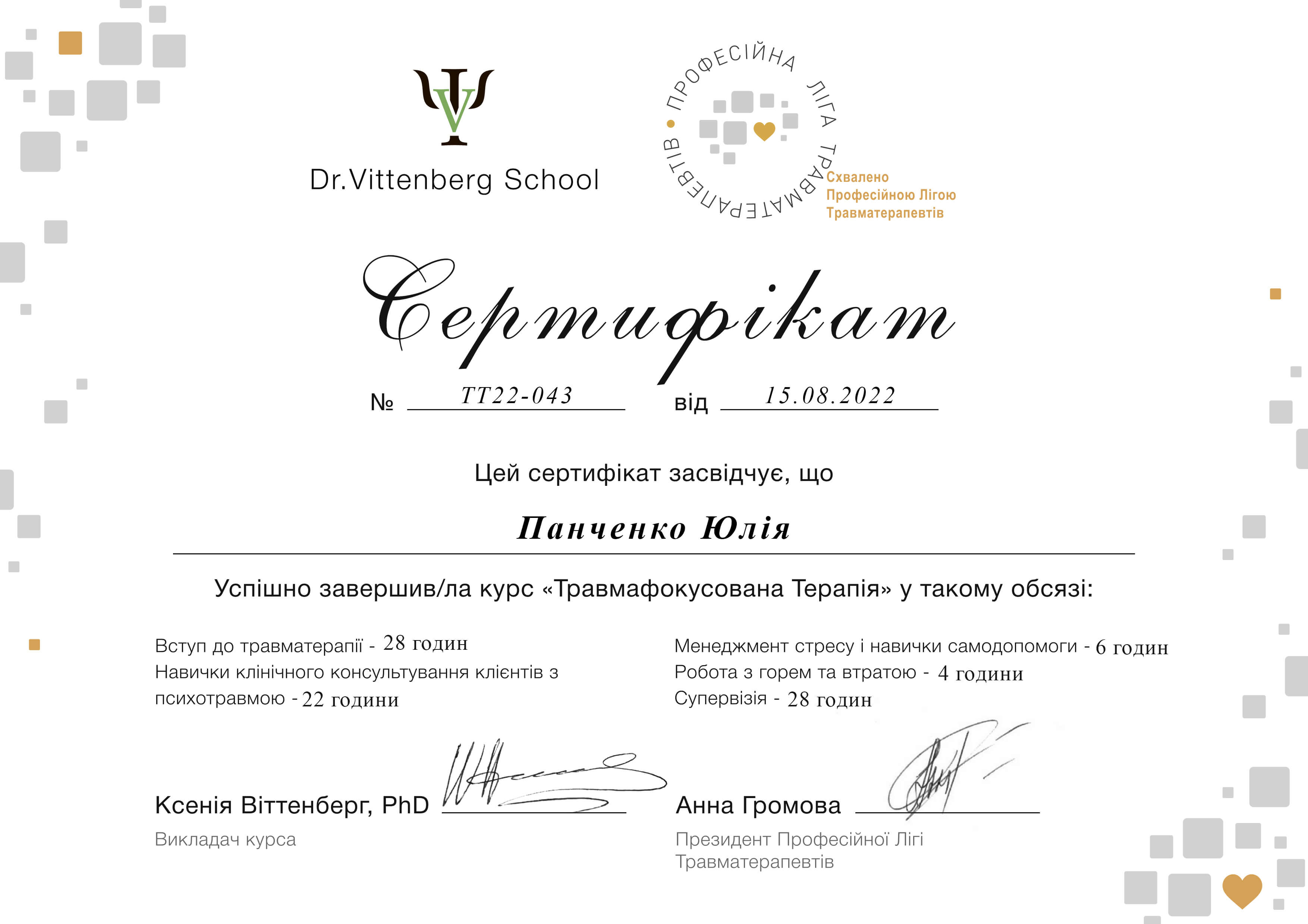 - Курс «Травмафокусированная терапия» (Dr. Vittenberg School, Профессиональная лига травматерапевтов)