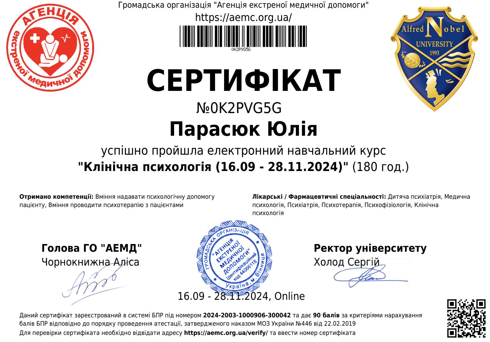 – Свидетельство о повышении квалификации «Клиническая психология» (180 часов, 6 кредитов) – Университет им.Альфреда Нобеля