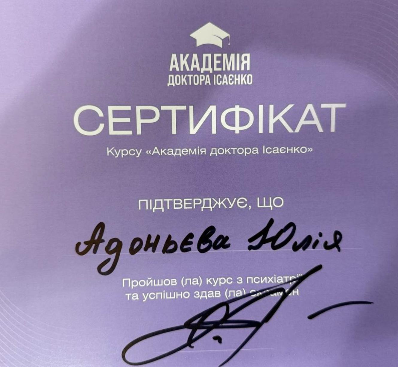 - Сертификат «Психиатрия для психологов: клинические ориентиры и взаимодействие с психиатром» (180 ч) - Светлана Исаенко