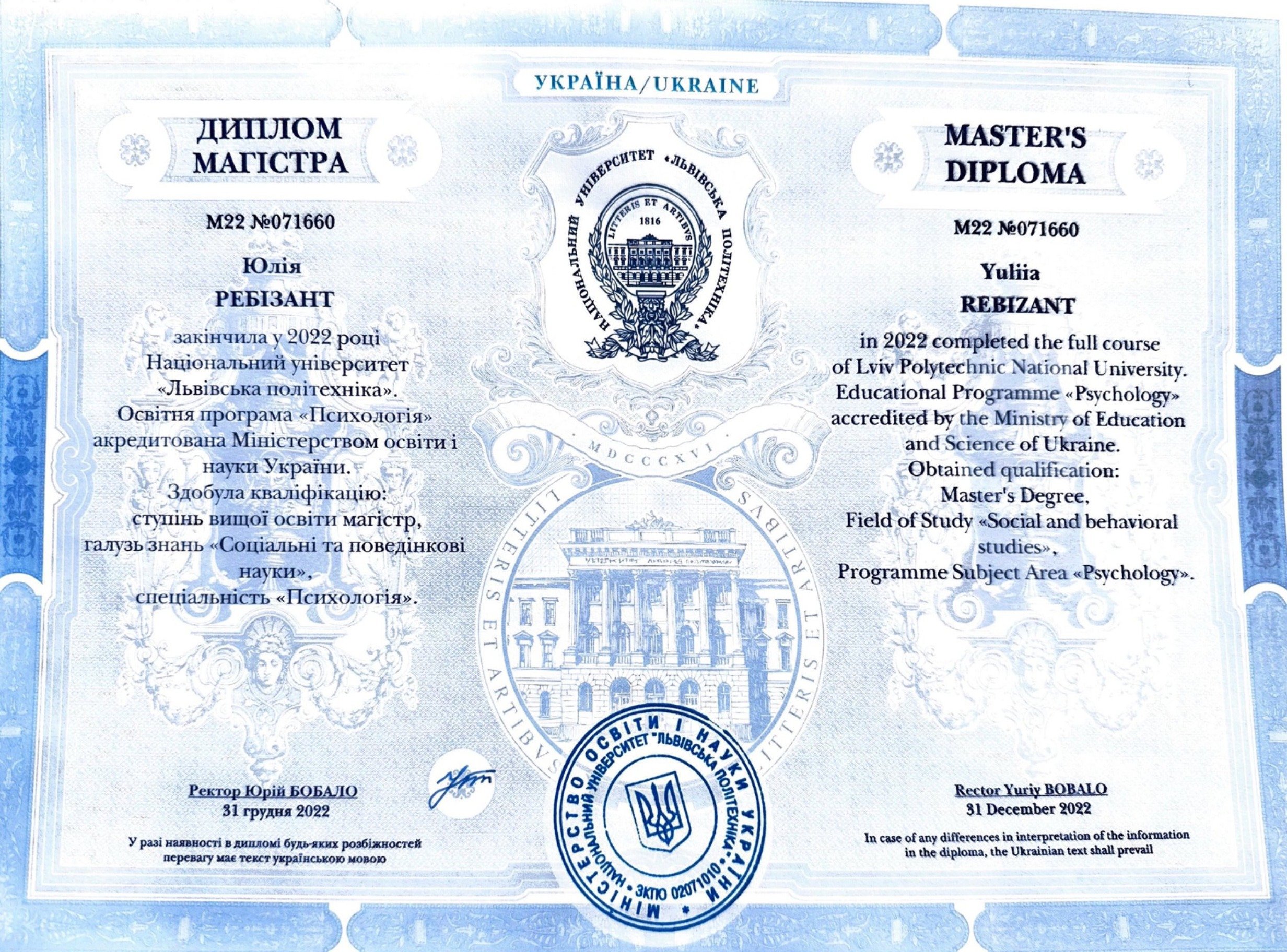 Восточно-европейский национальный университет имени Леси Украинки, бакалавр психологии, 2020 год. – Национальный университет «Львовская политехника», магистр психологии, 2022 год.