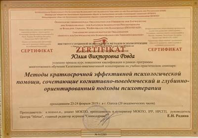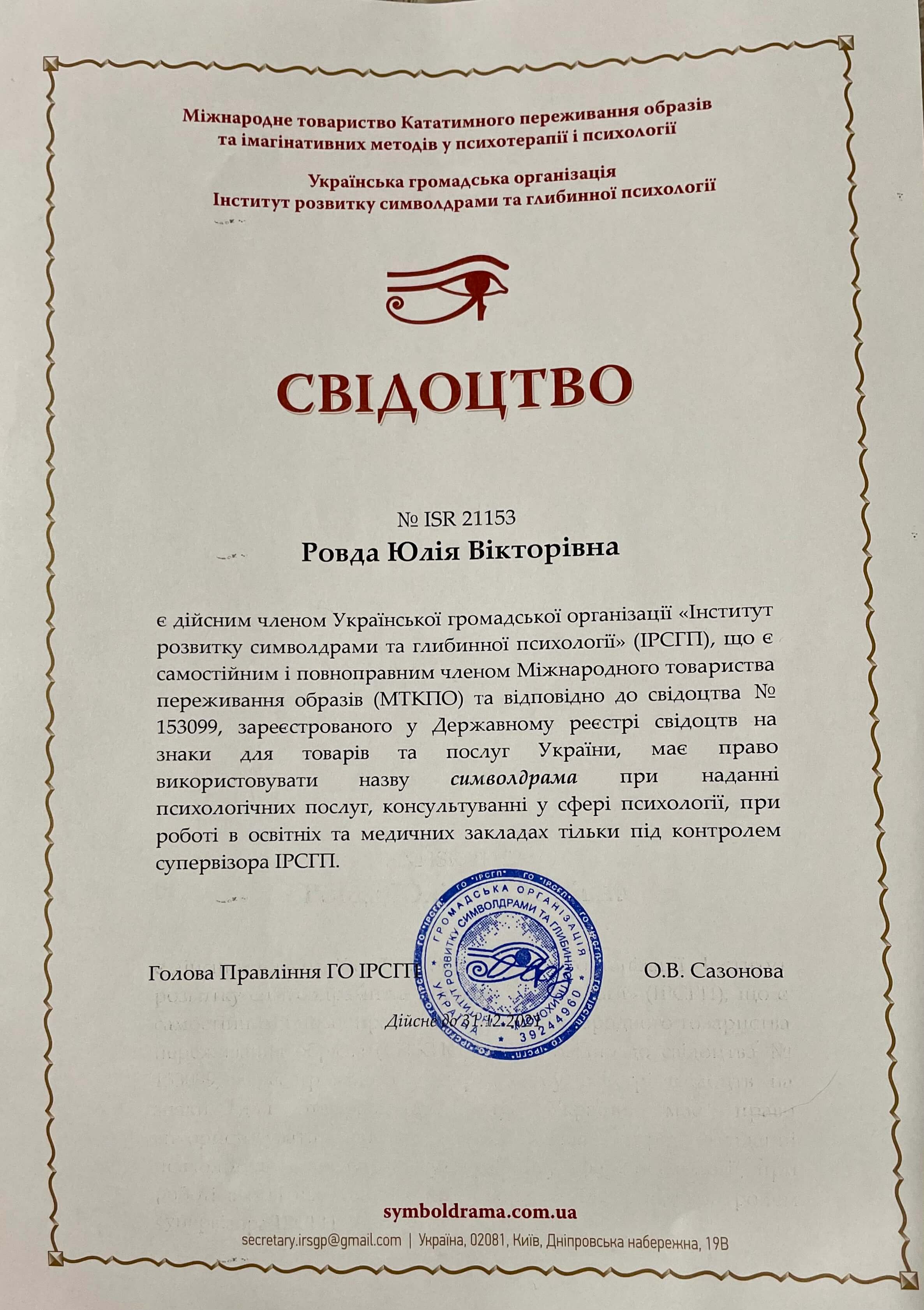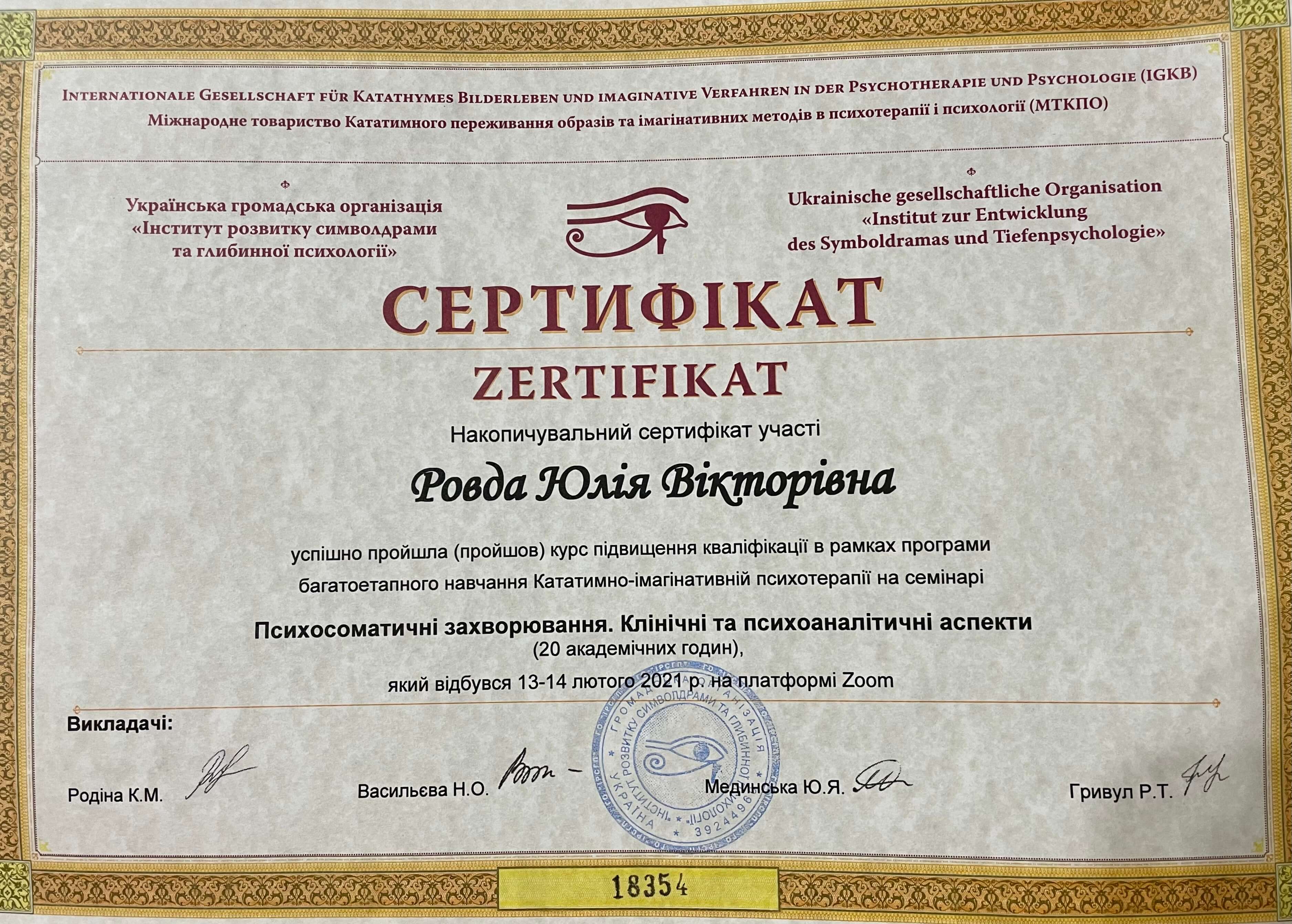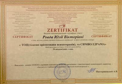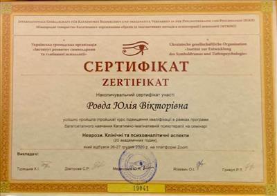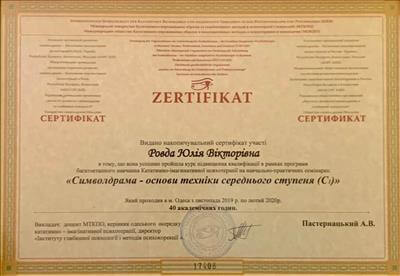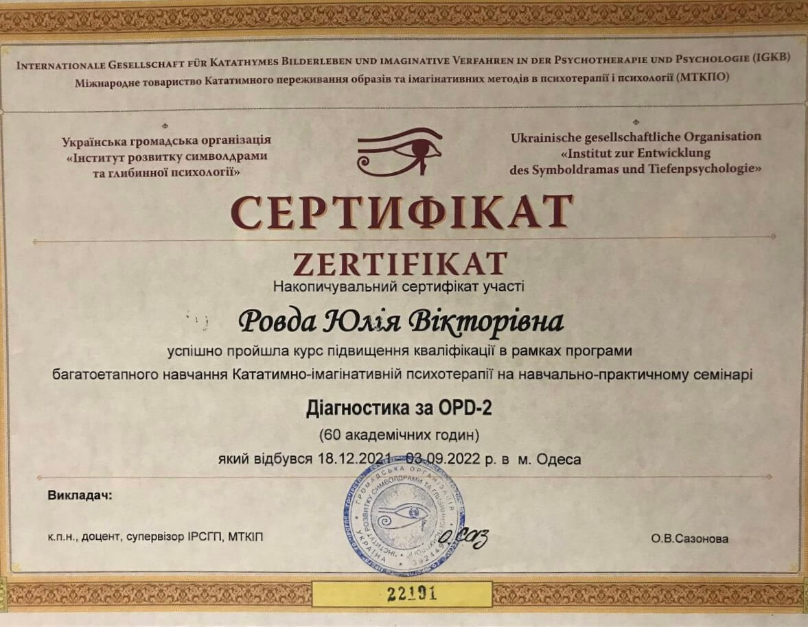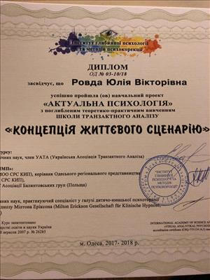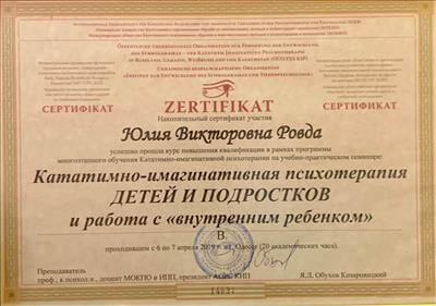 Нейропсихология и коррекция детского поведения .Введение в Символдраму. Основная ступень символдрамы. Тайны жизненного сценария. Депрессия с позиции современного психоанализа и психотерапии по методу символдрамы . Символдрама-основы техники средней ступени .Телесно ориентированная психотерапия и символдрама .Вступление в аналитическую психологию Карла Густава Юнга. Кататимно-имагинативная психотерапия Детей и Подростков и работа с «внутренним ребёнком».Концепция жизненного сценария. Методы краткосрочной эффективной психологической помощи,сочетающие когнитивно-поведенческий и глубинно-ориентированный подходы психотерапии.