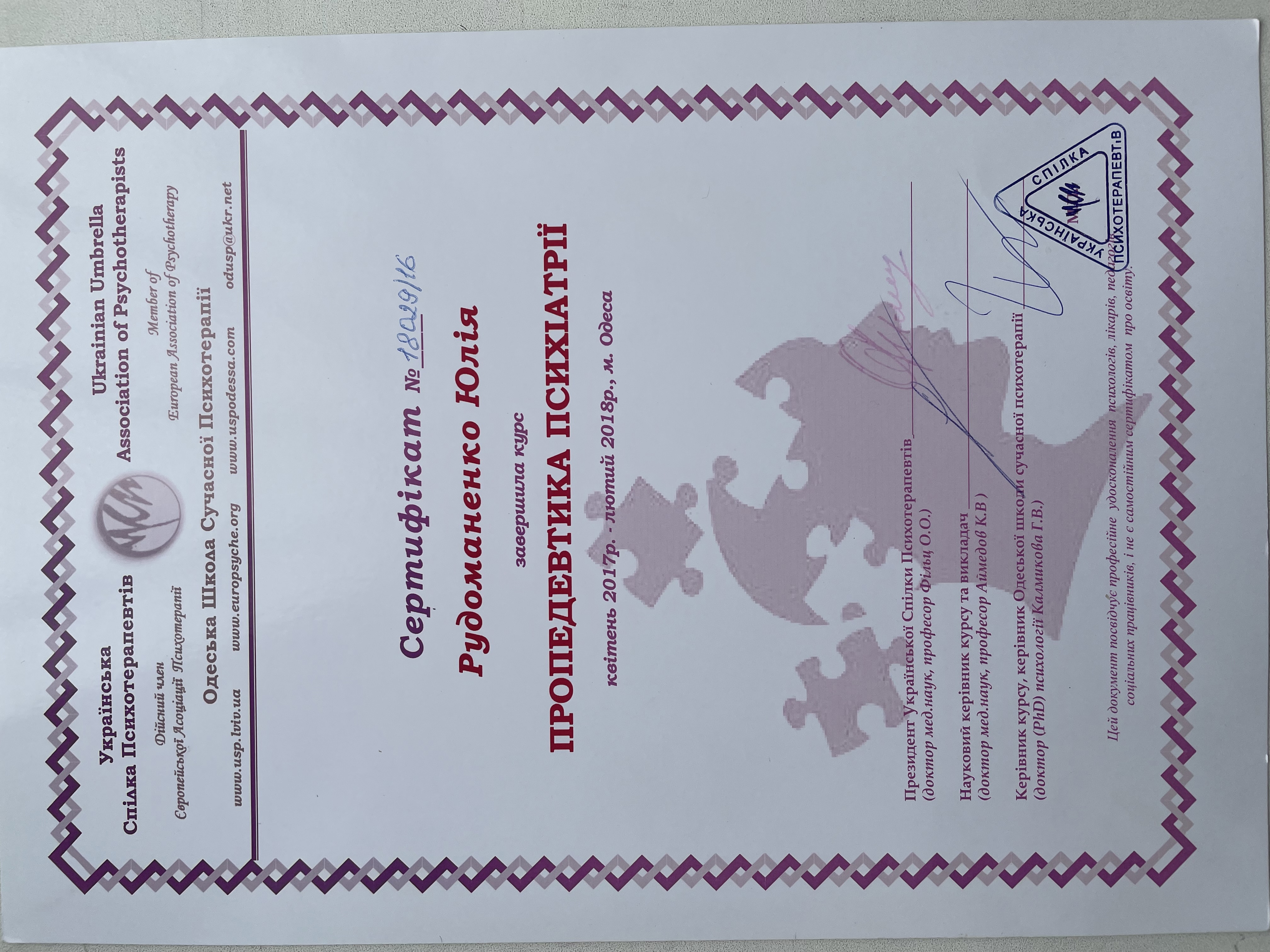 Имею три государственных диплома по психологии – специалиста, магистра, доктора философии. Сертифицированная гештальт-терапевт, КПТ-консультант, психотравматерапевт, семейная психотерапевт. Имею более тридцати сертификатов по практическим направлениям обучения в психологии, среди них – работа с сексуальной тематикой в гештальт – подходе, арт-терапия, телесная терапия, работа с зависимым поведением и другие.