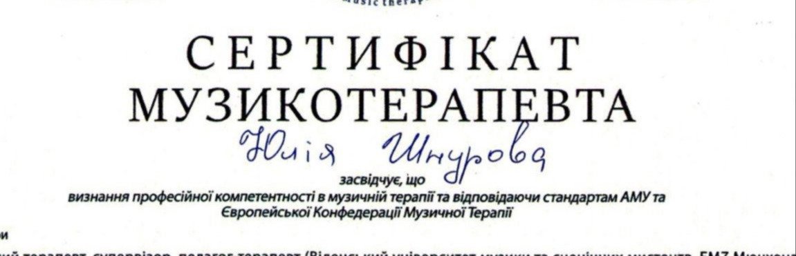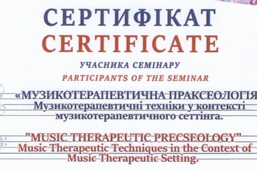 •• Участница международного образовательного проекта подготовки музыкальных терапевтов – сертификация музыкотерапевта;
