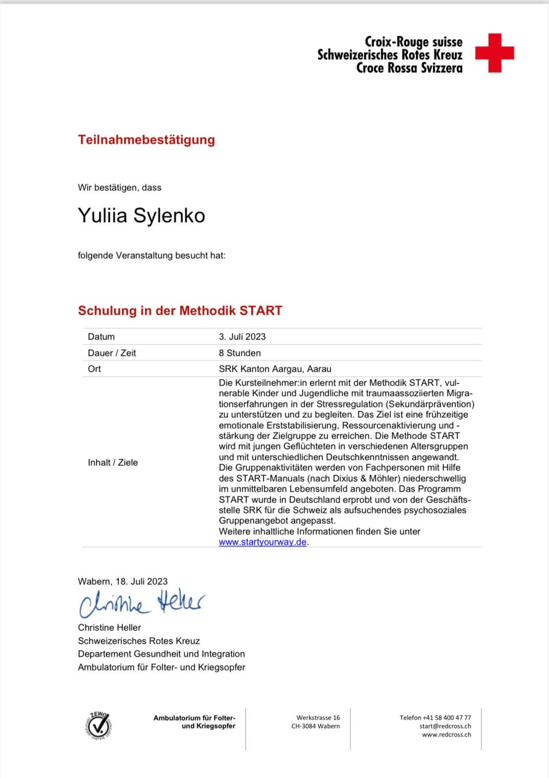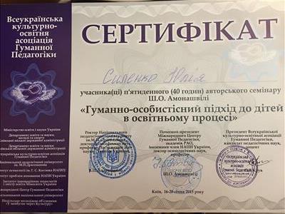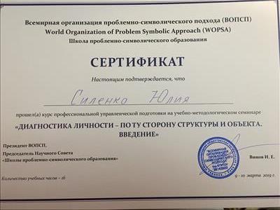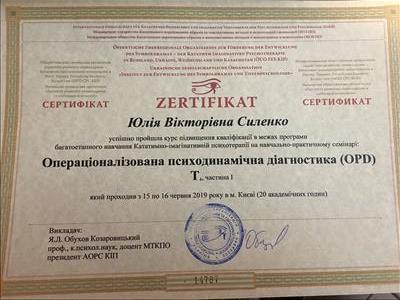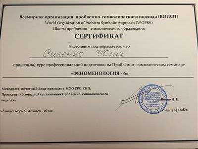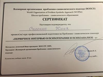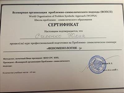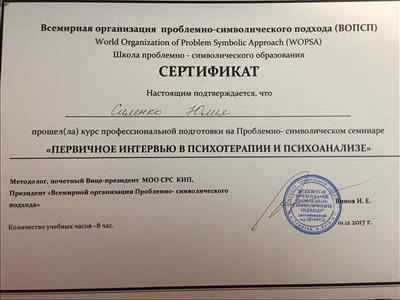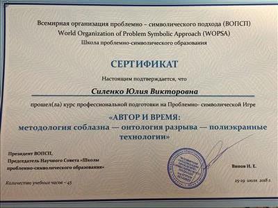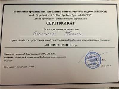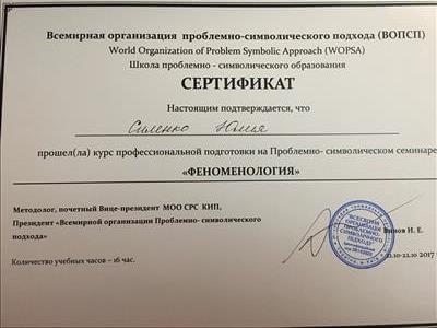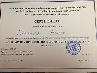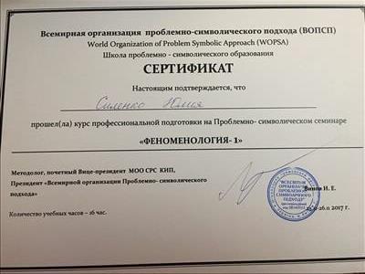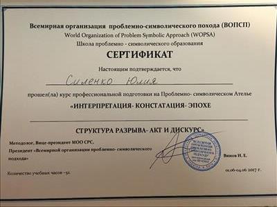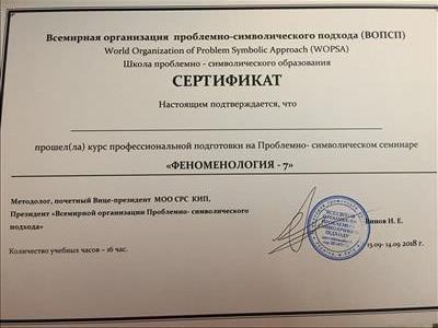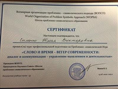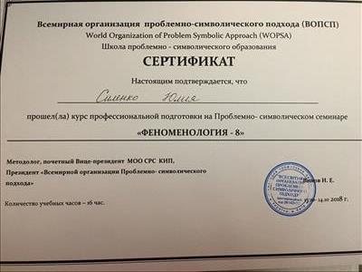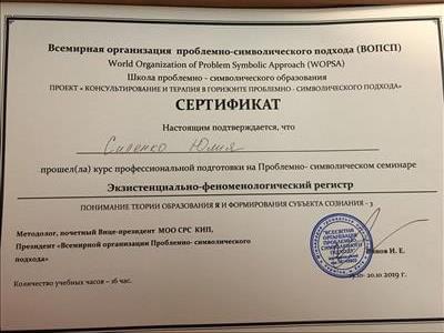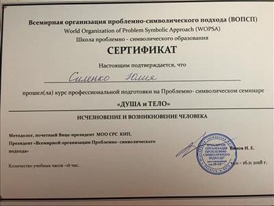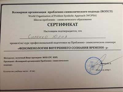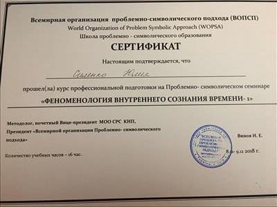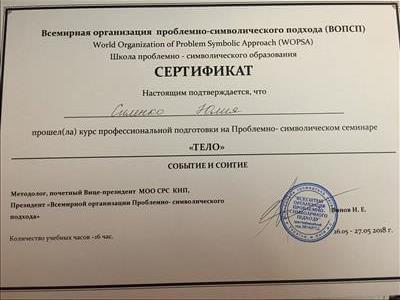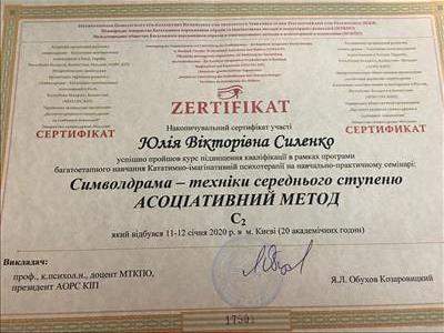 С 2016 -2021 Межрегиональная общественная организация содействия развитию символдрамы - Кататимно-имагинативной психотерапии в России, Украине, Республике Беларусь, Казахстане (МОО СРС КИП) Украинская общественная организация «Институт развития символдрамы и глубинной психологии» Закончила обучение, готовлюсь к сдаче диплома.