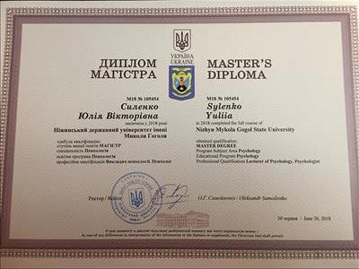 Закончила в 2018 году Неженский государственный университет имени Николая Гоголя приобрела квалификацию : степень высшего образования МАГИСТР, специальность Психология, образовательная программа Психология, профессиональная квалификация Преподаватель психологии. Психолог.