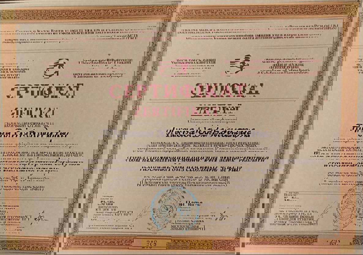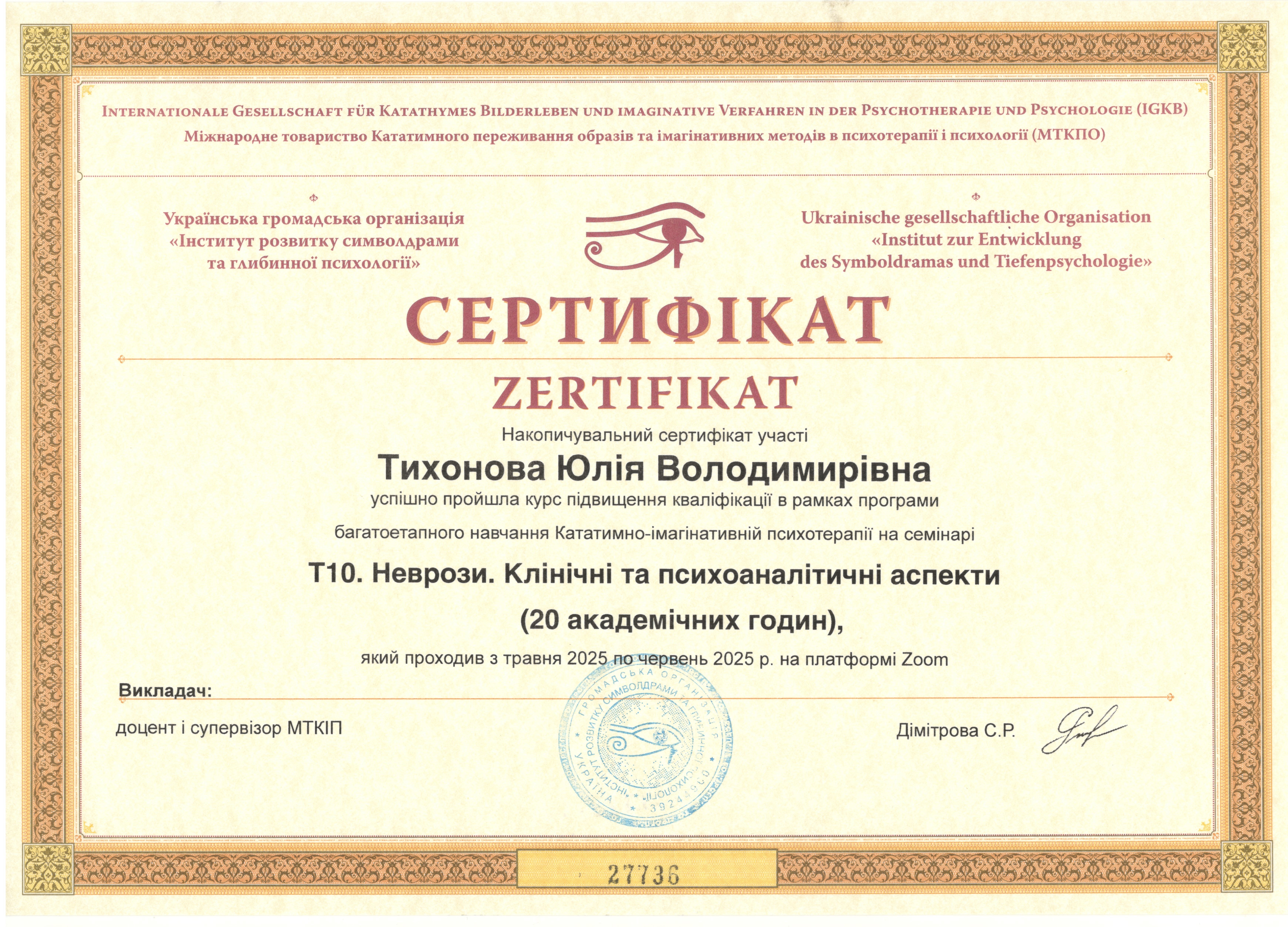 Я являюсь ассоциированным членом Украинской общественной организации «Институт развития символдрамы и глубинной психологии» (ИРСХП), принимаю участие в психотерапевтических мероприятиях института. Имею опыт собственной и групповой психотерапии. Регулярно принимаю участие в интервизиях и супервидениях.