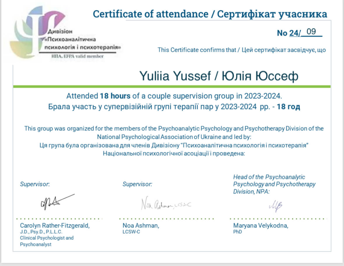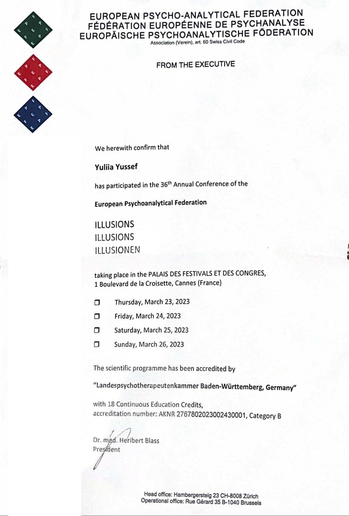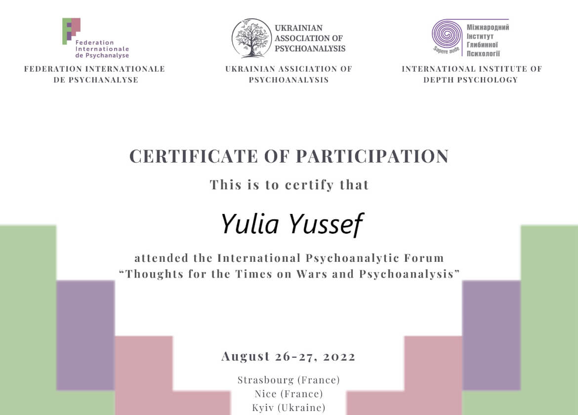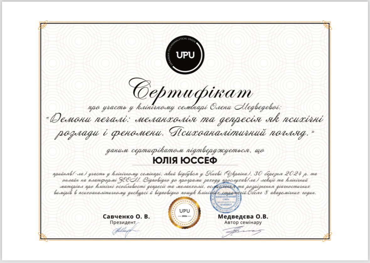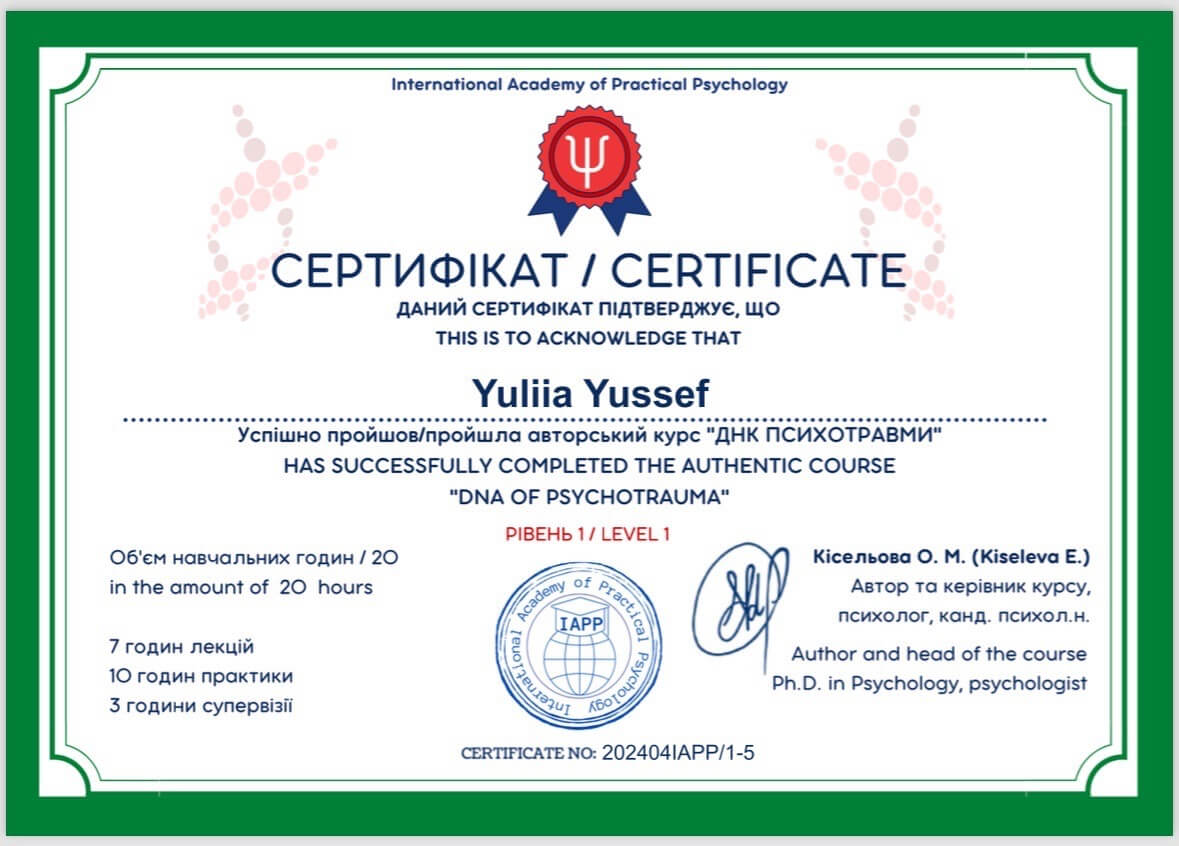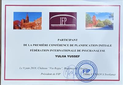 Сегодня я практикующий психолог, психоаналитик, сертифицированный арт-терапевт по направлению "Психодинамическая арт-терапия", выпускница Международного Института Глубинной Психологии, член национальны и международных профессиональных сообществ Украинской Ассоциации Психоанализа, Европейской Конфедерации Психоаналитической Психотерапии; участник инициативной группы и член исполнительного комитета FIP - Fédération International de Psychanalyse Международной Федерации Психоанализа (г. Страсбург, Франция); член Украинского Психоаналитического Союза; член НПА, EFPA; член организационного комитета Международной Психоаналитической Школы; ведущая проекта «Психоаналитическая библиотека» и «Психоаналитический киноклуб».