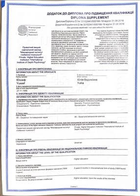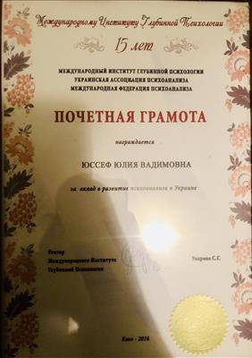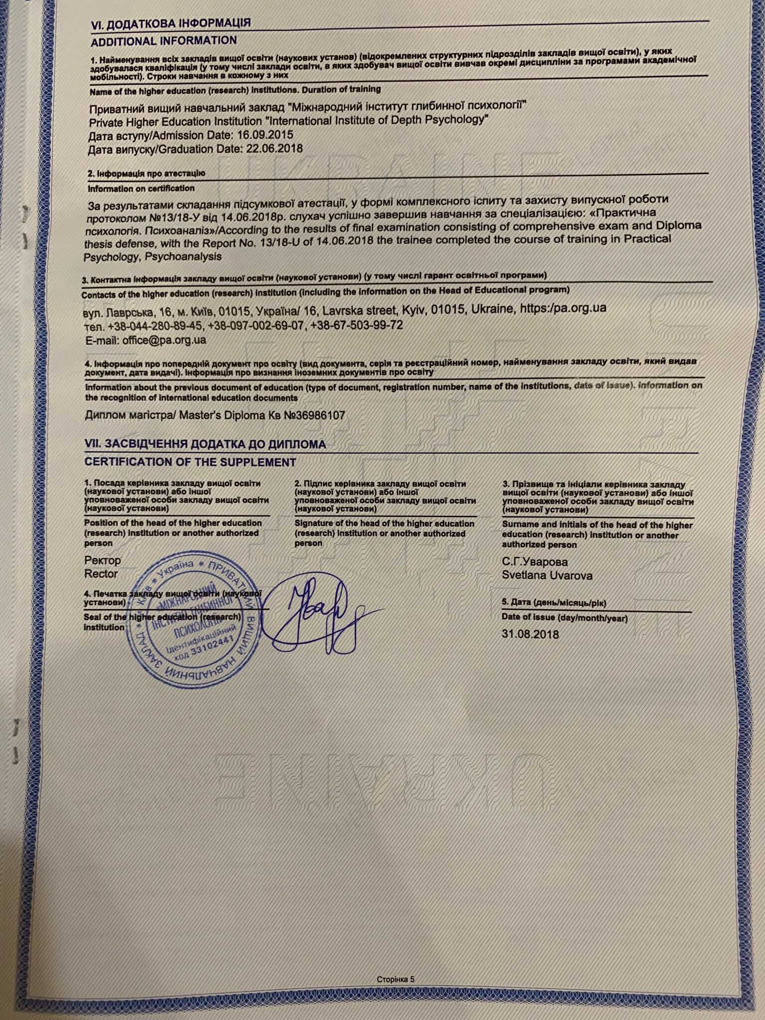 Магистратура по Психологии; Международный Институт Глубинной Психологии, специальность Практическая психология, специализация: Психоанализ (1904 ак. часов);