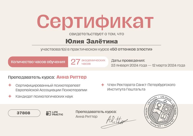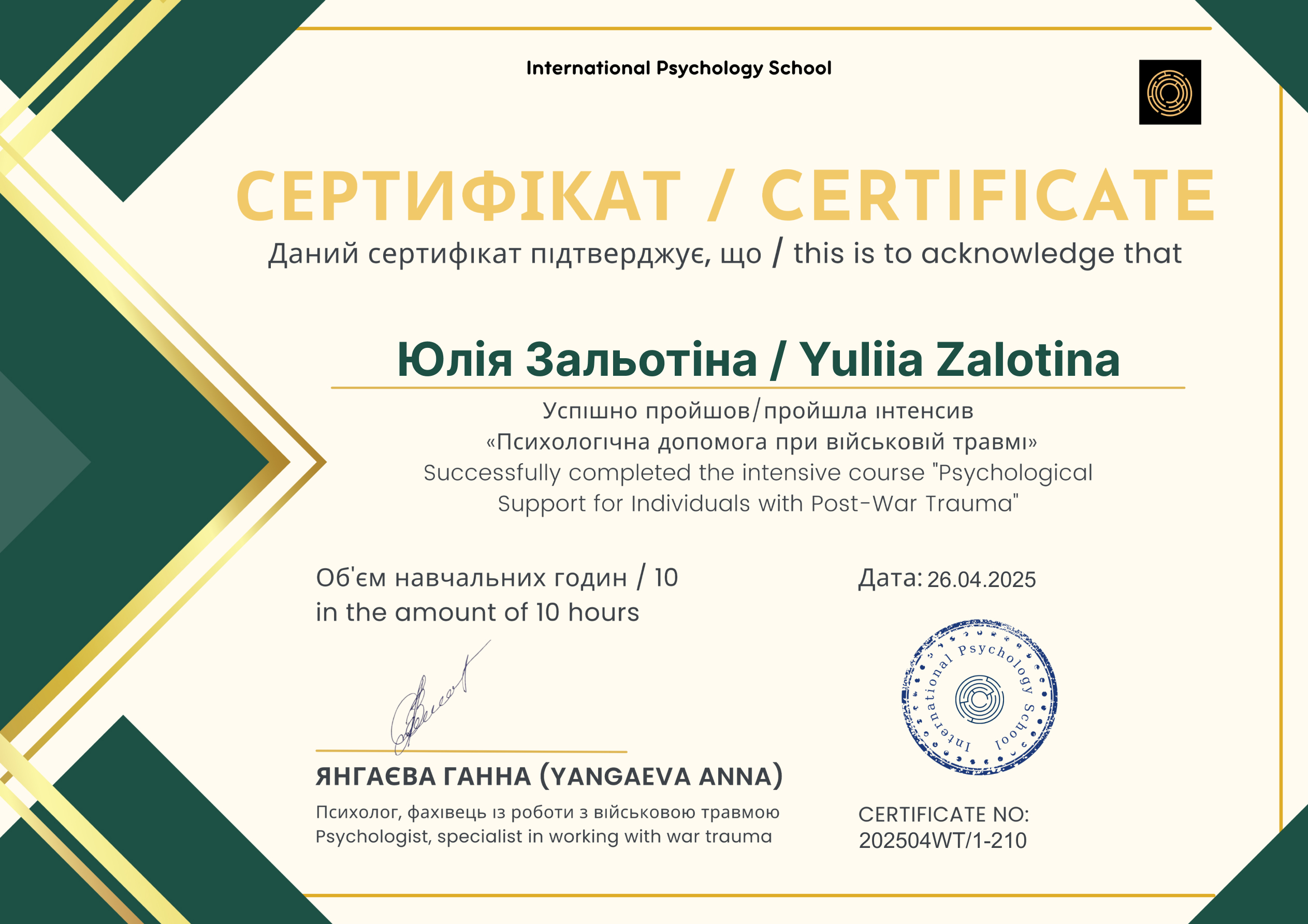 В 2020 году после тяжелого выгорания на работе я решила сменить профессию экономиста психологом. Ибо именно психотерапия помогла мне выйти из выгорания и отстроить свою жизнь. Я окончила Институт социальной психологии и получила специальность Психолог-консультант в полимодальном подходе.