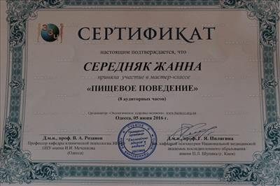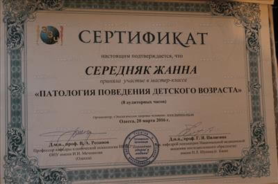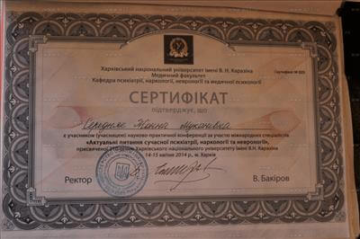 Сертифікат про участь у науково-практично конференції за участю міжнародних спеціалістів «Актуальні питання сучасної психіатрії, та неврології»