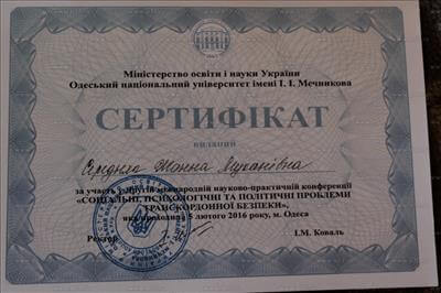 Сертифікат про участь в другій міжнародній науково-практичній конференції «Соціальні, психологічні та політичні проблеми транскордонної безпеки»