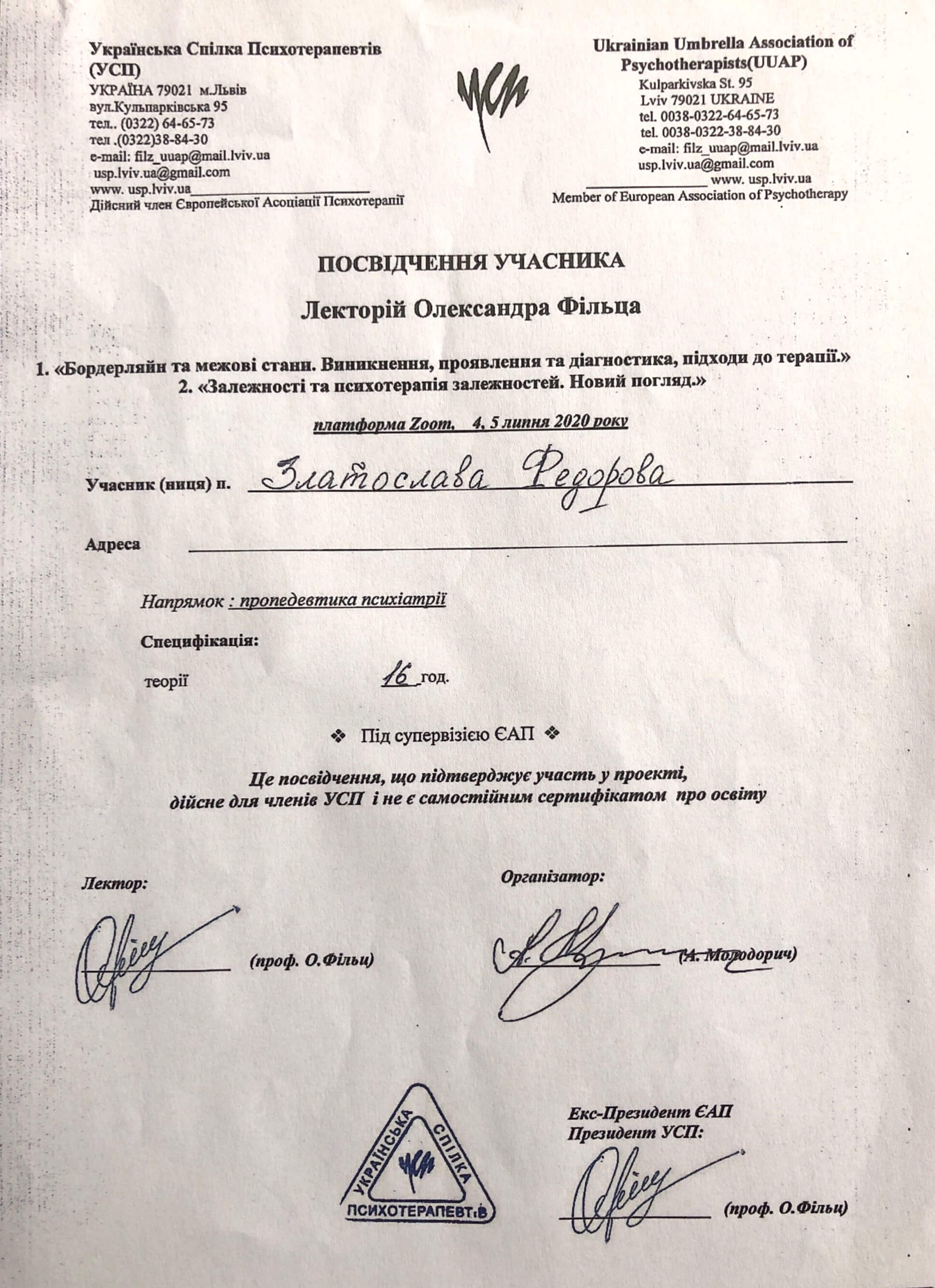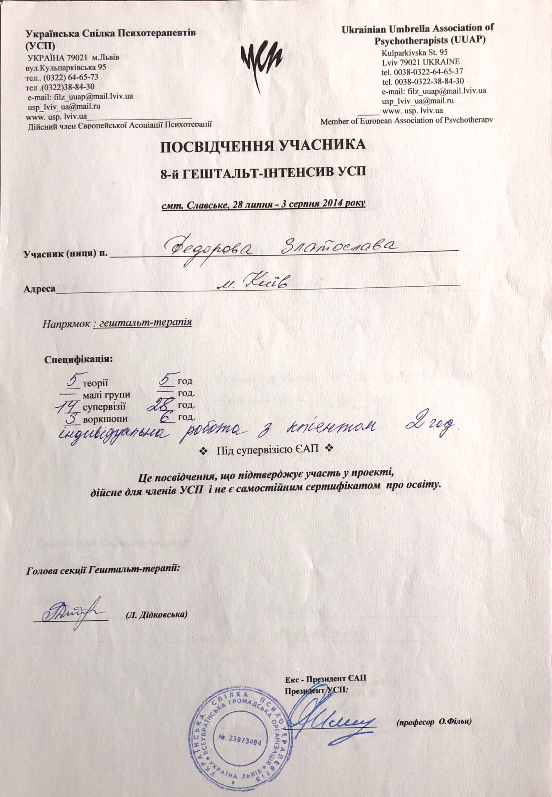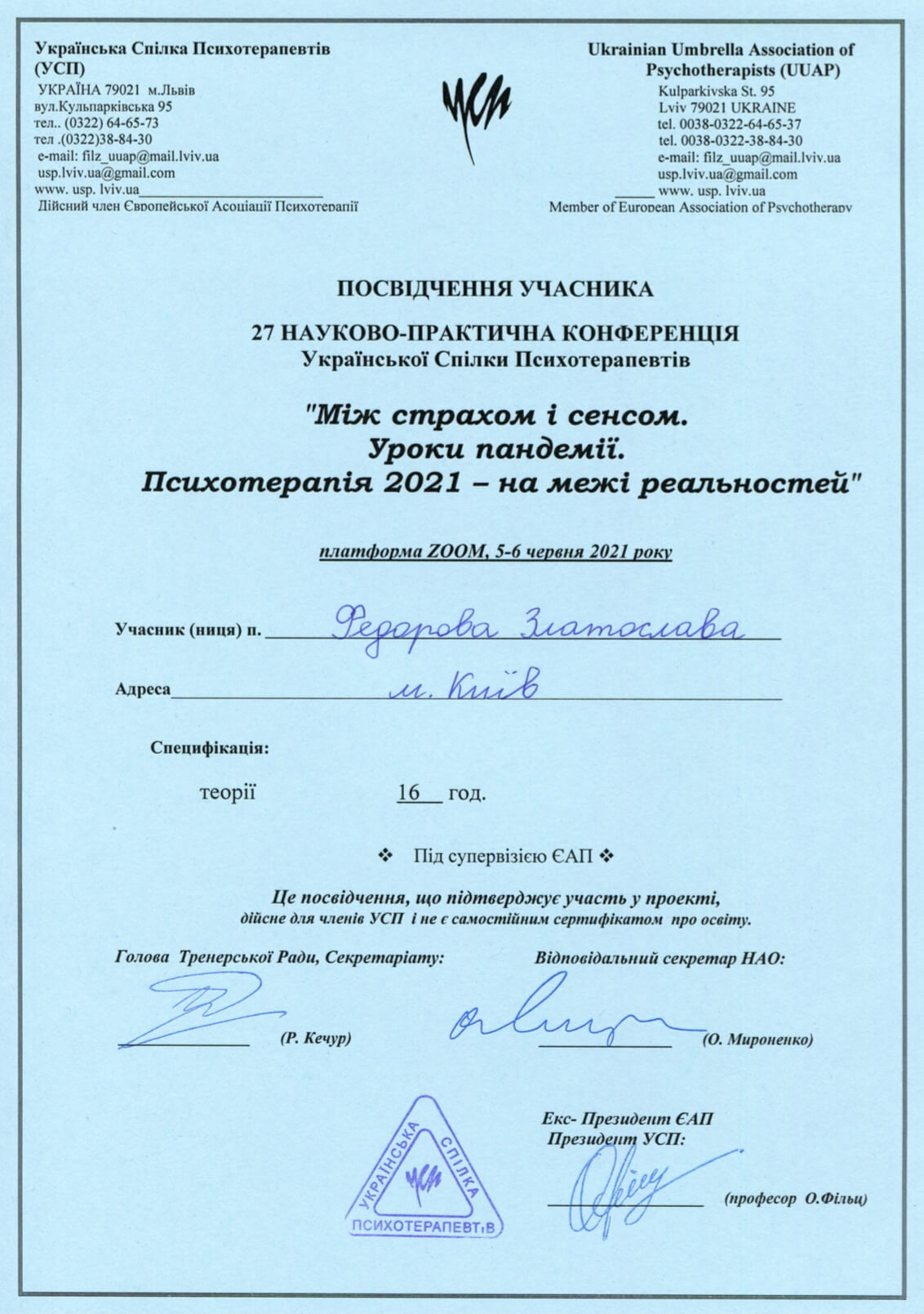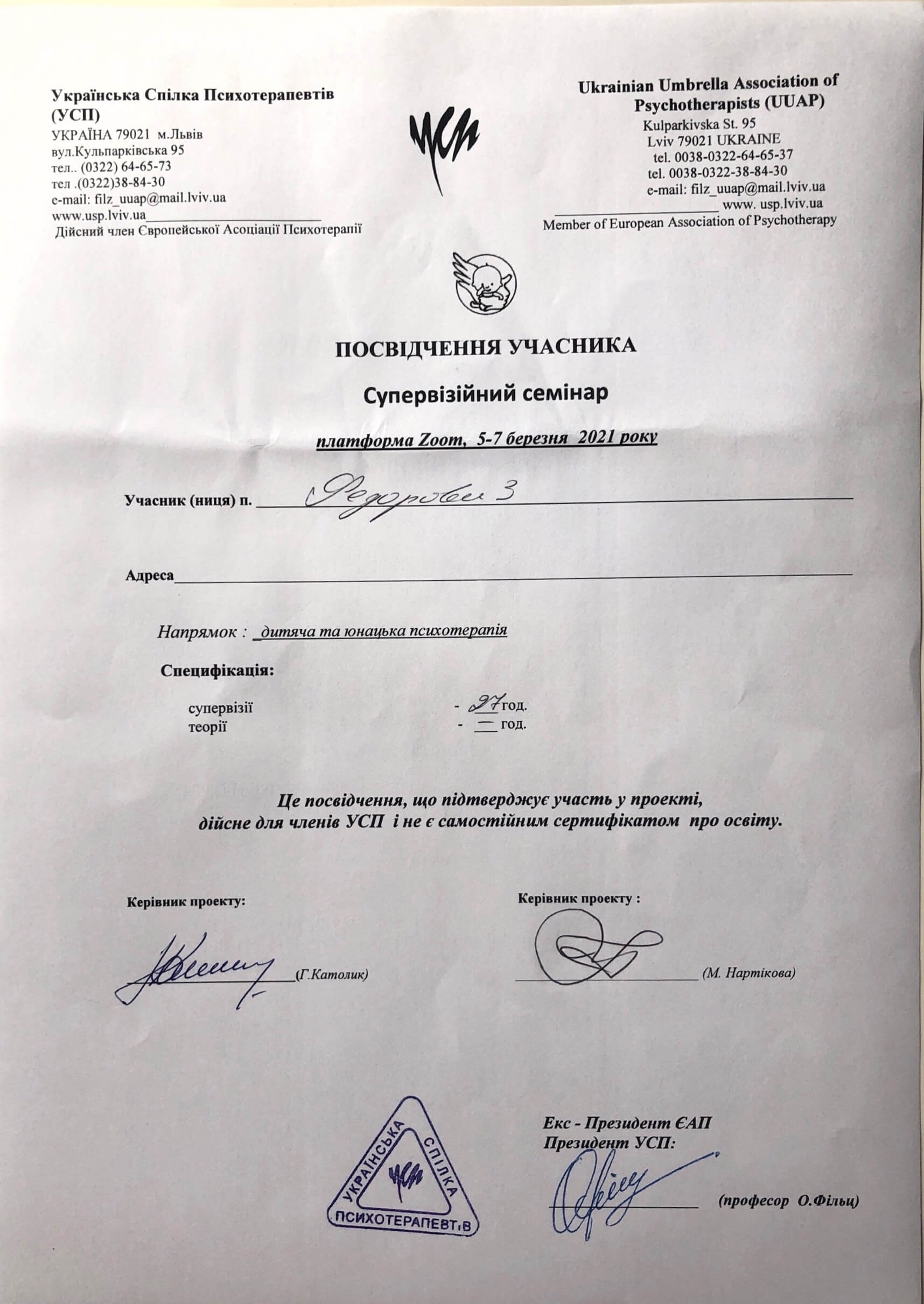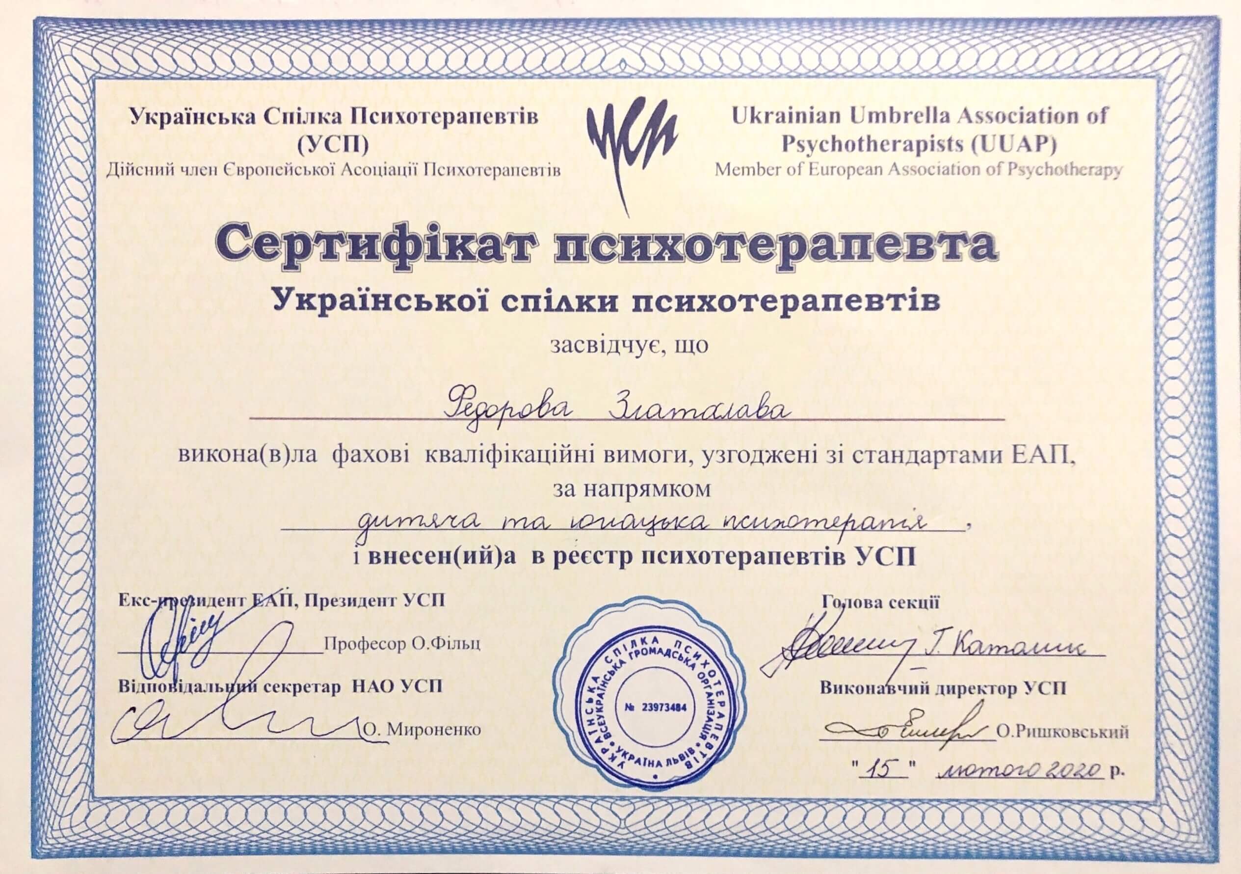 Сертифікат психотерапевта Української спілки психотерапевтів