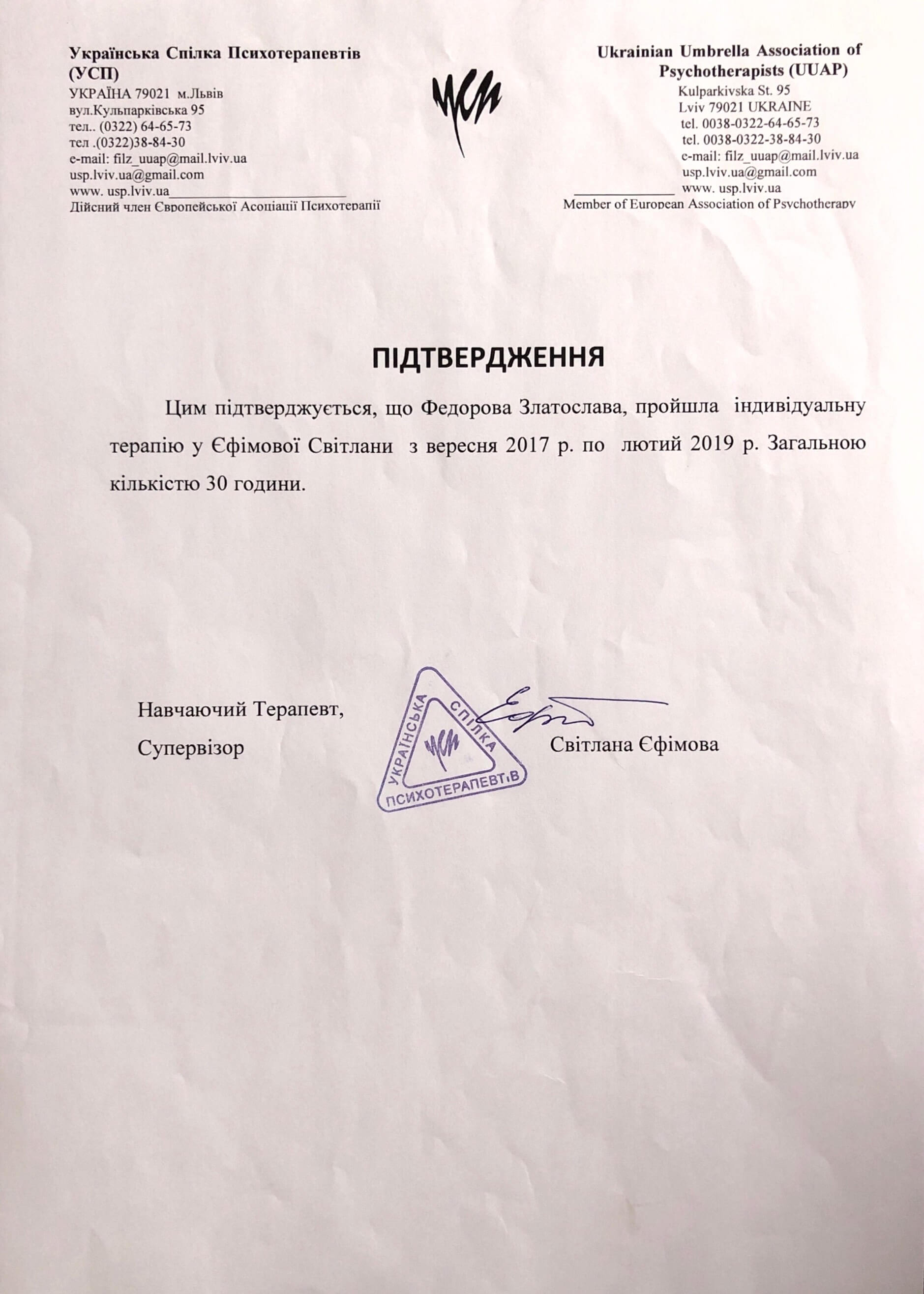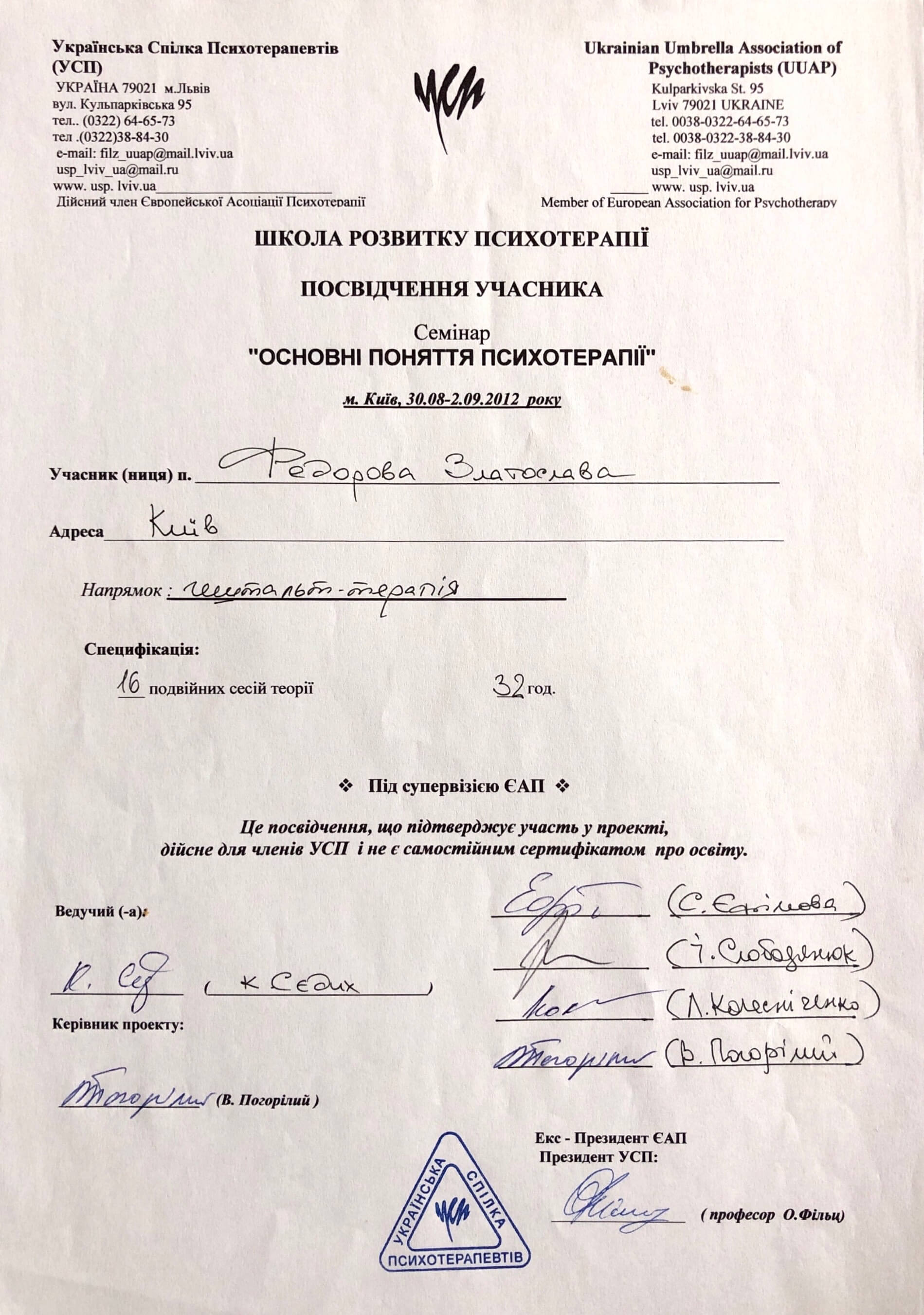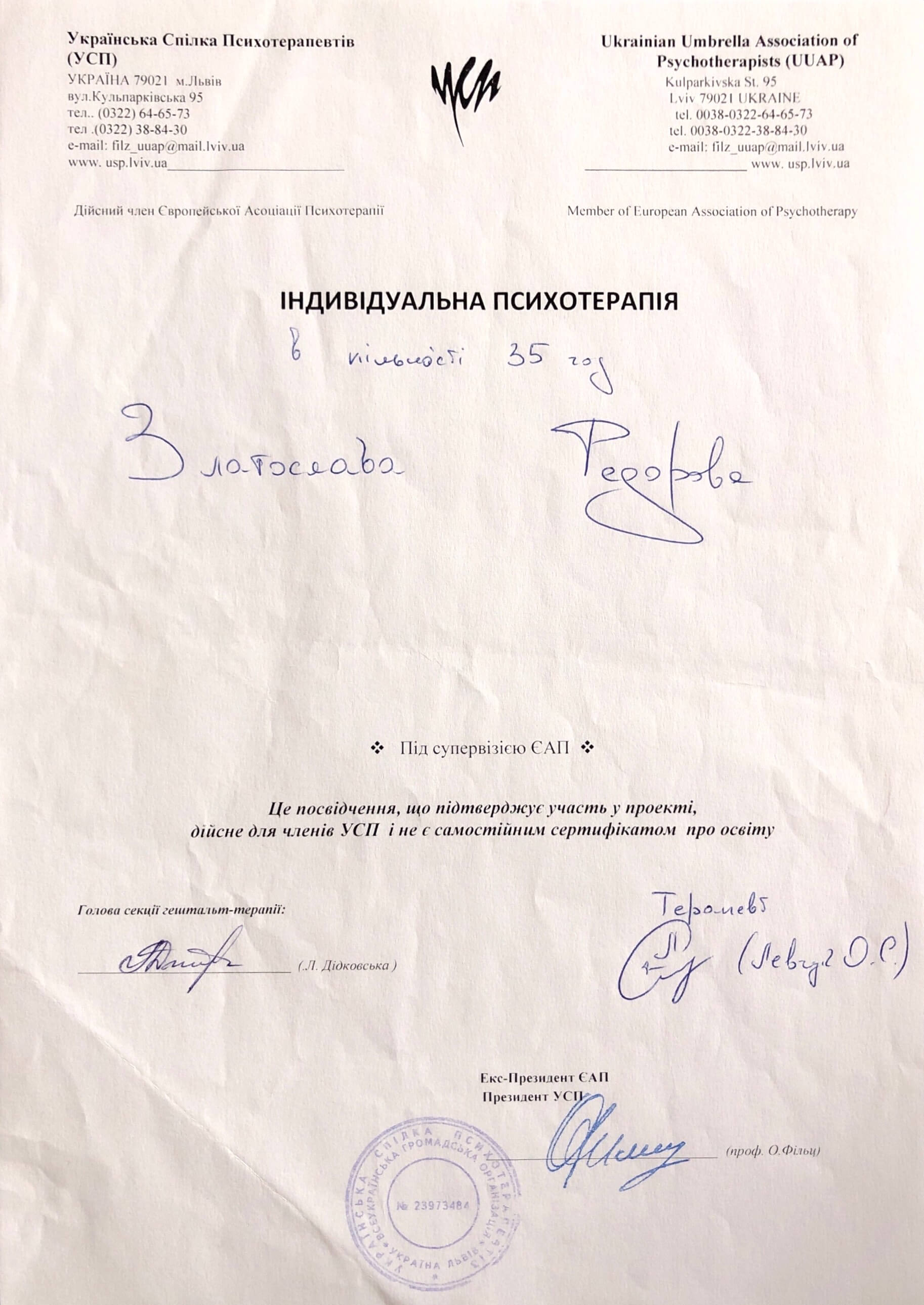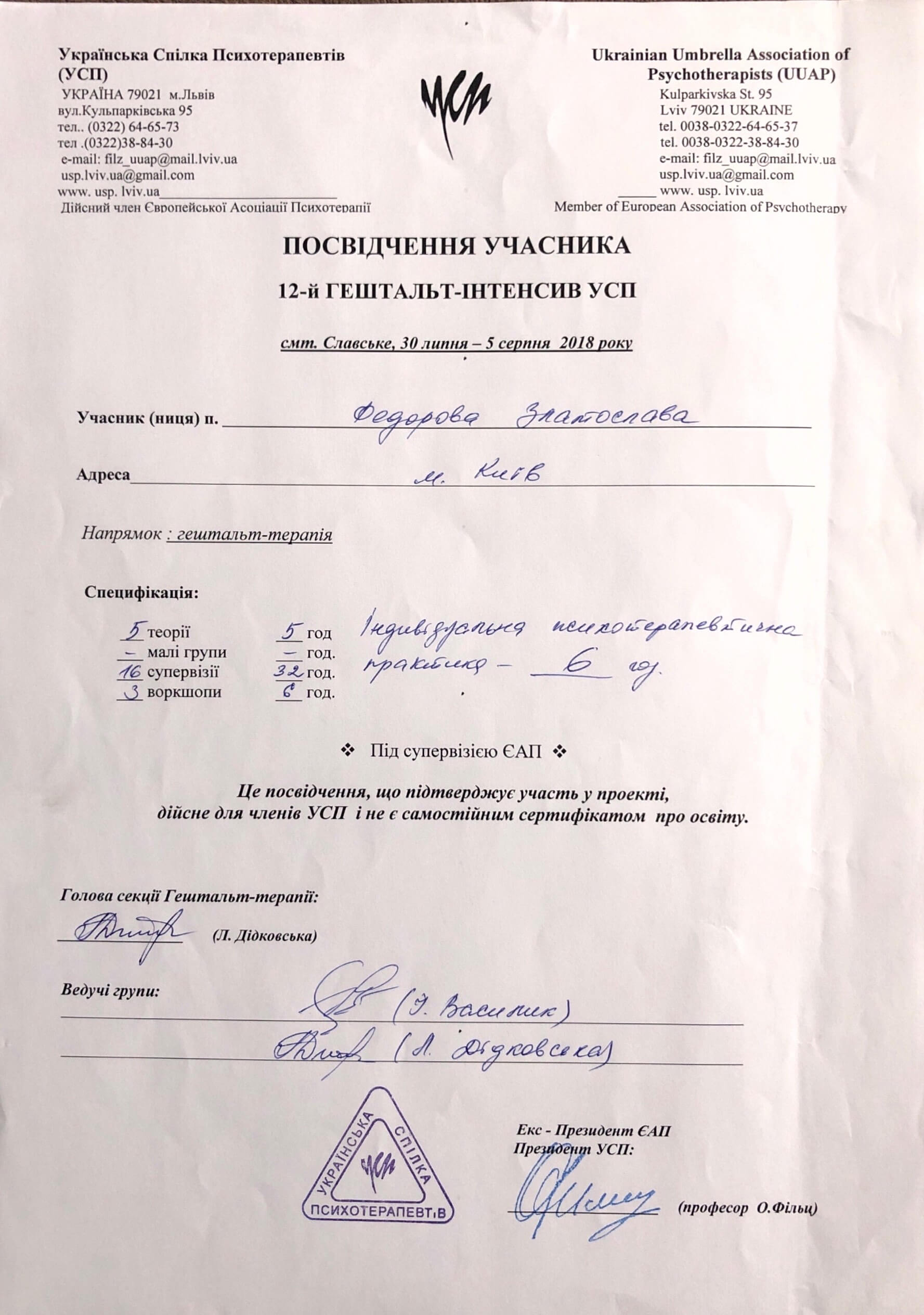 Сертифікат психотерапевта Української спілки психотерапевтів