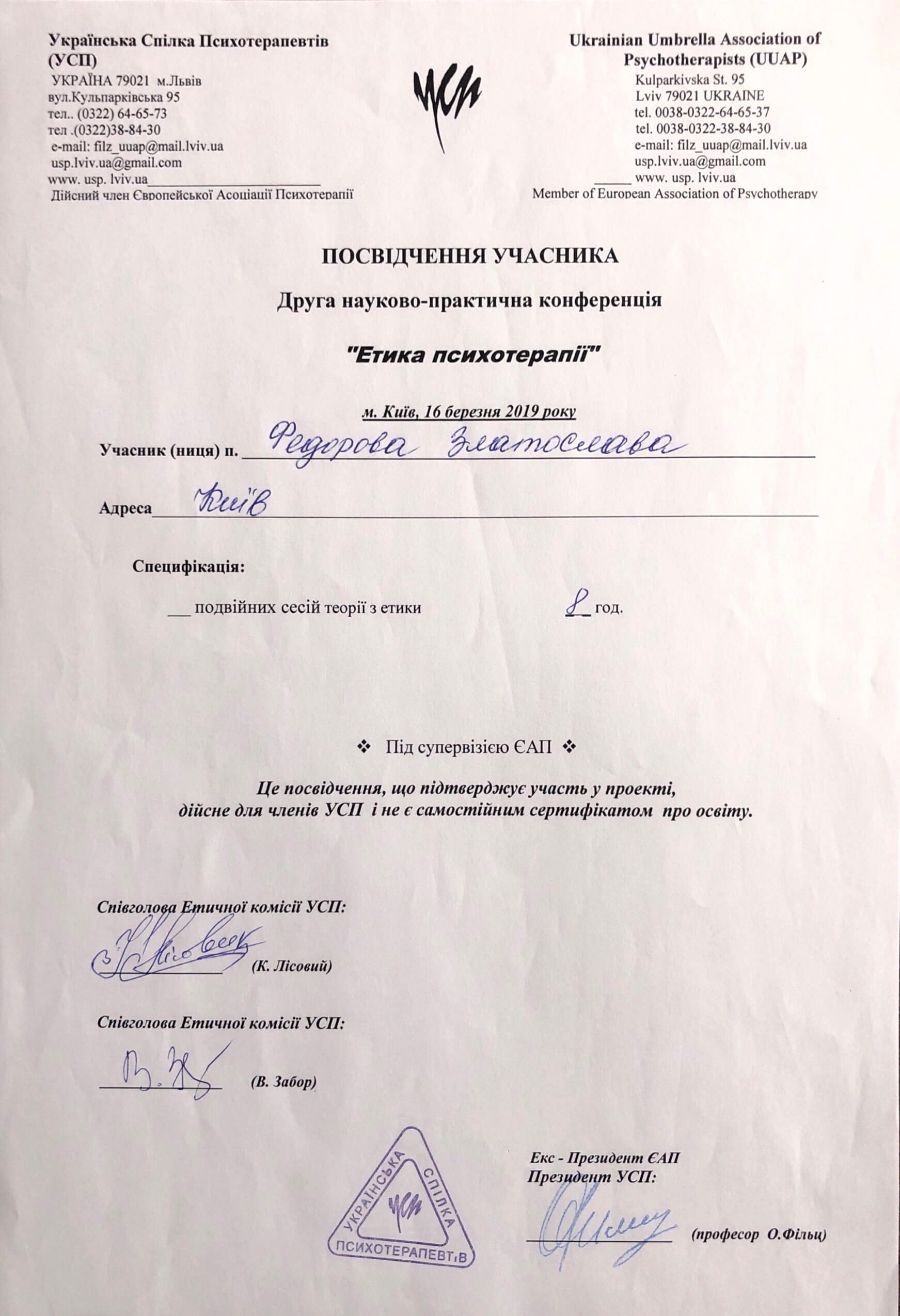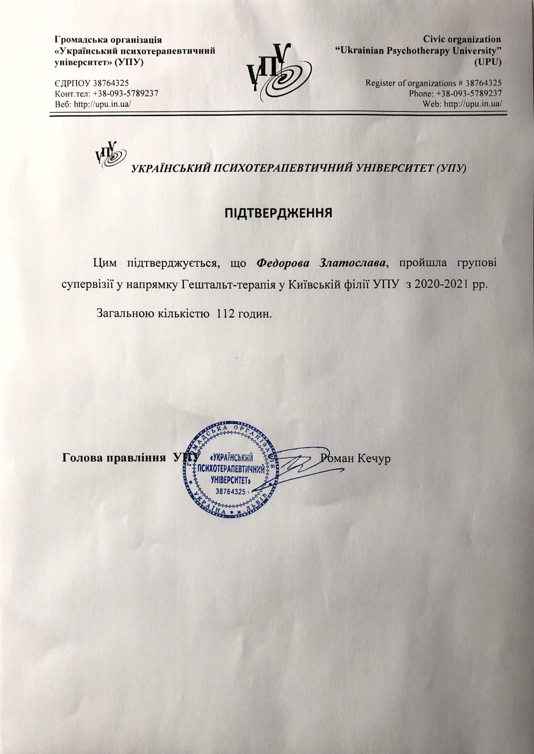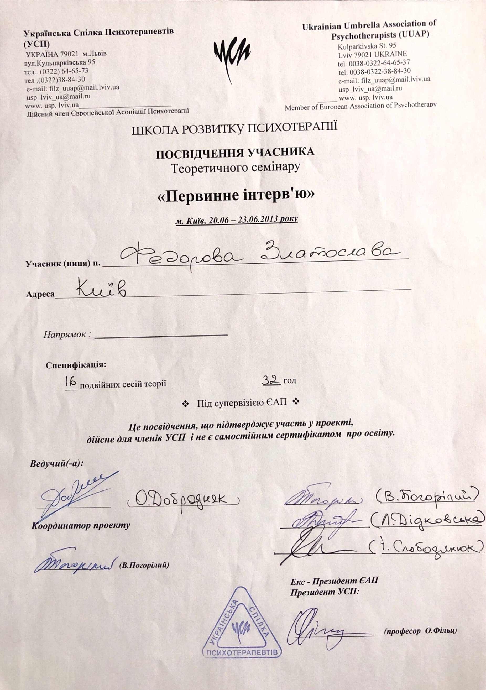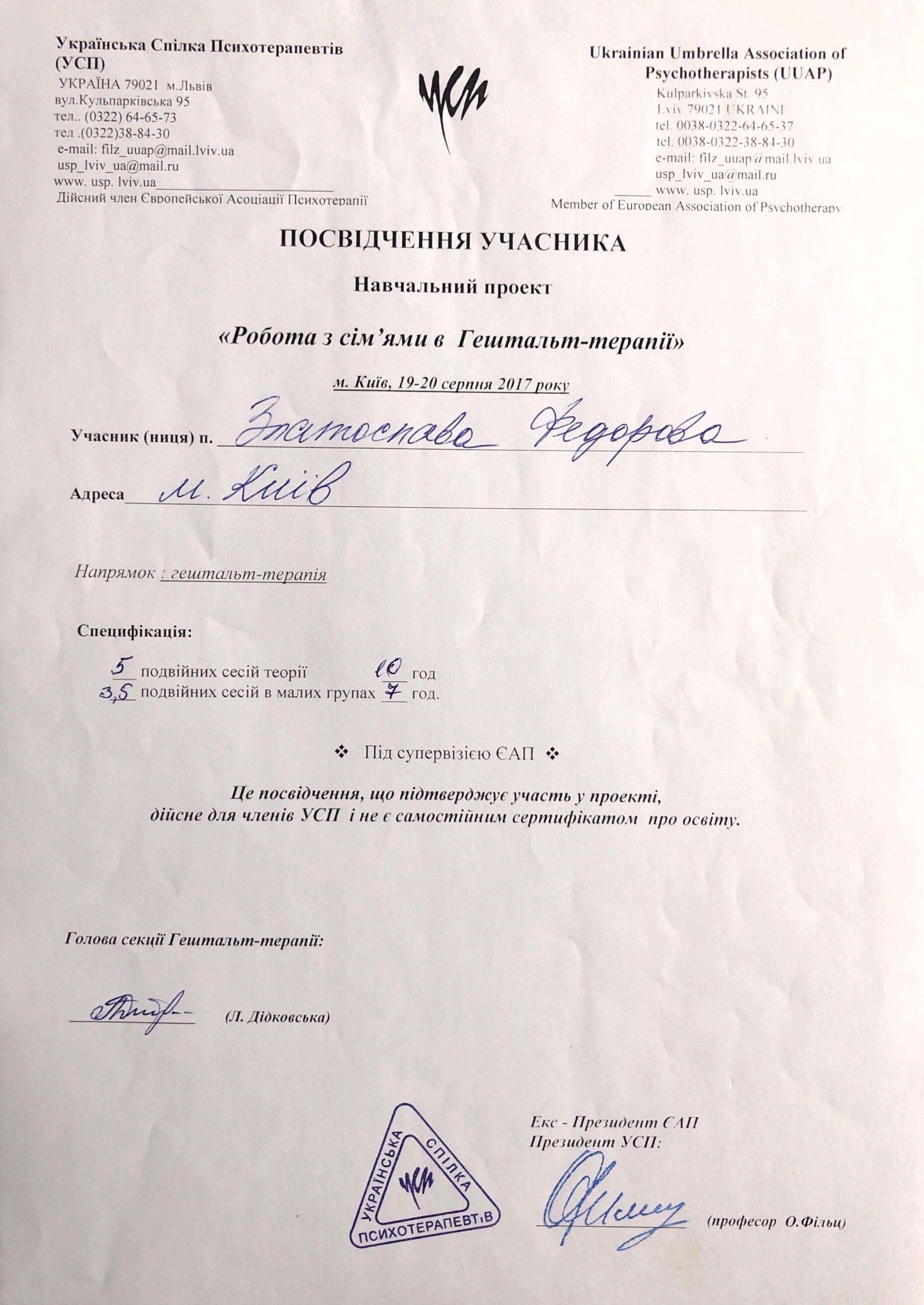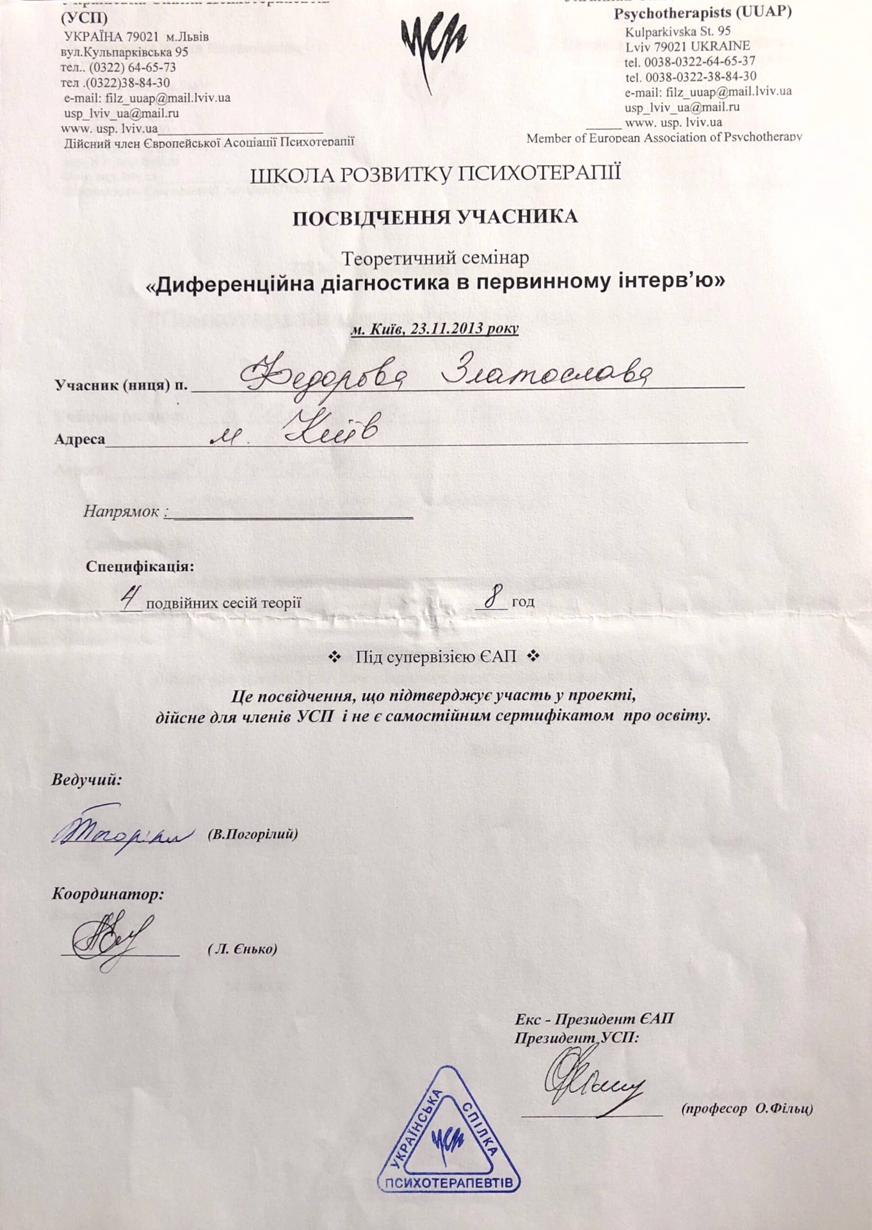 Сертифікат психотерапевта Української спілки психотерапевтів