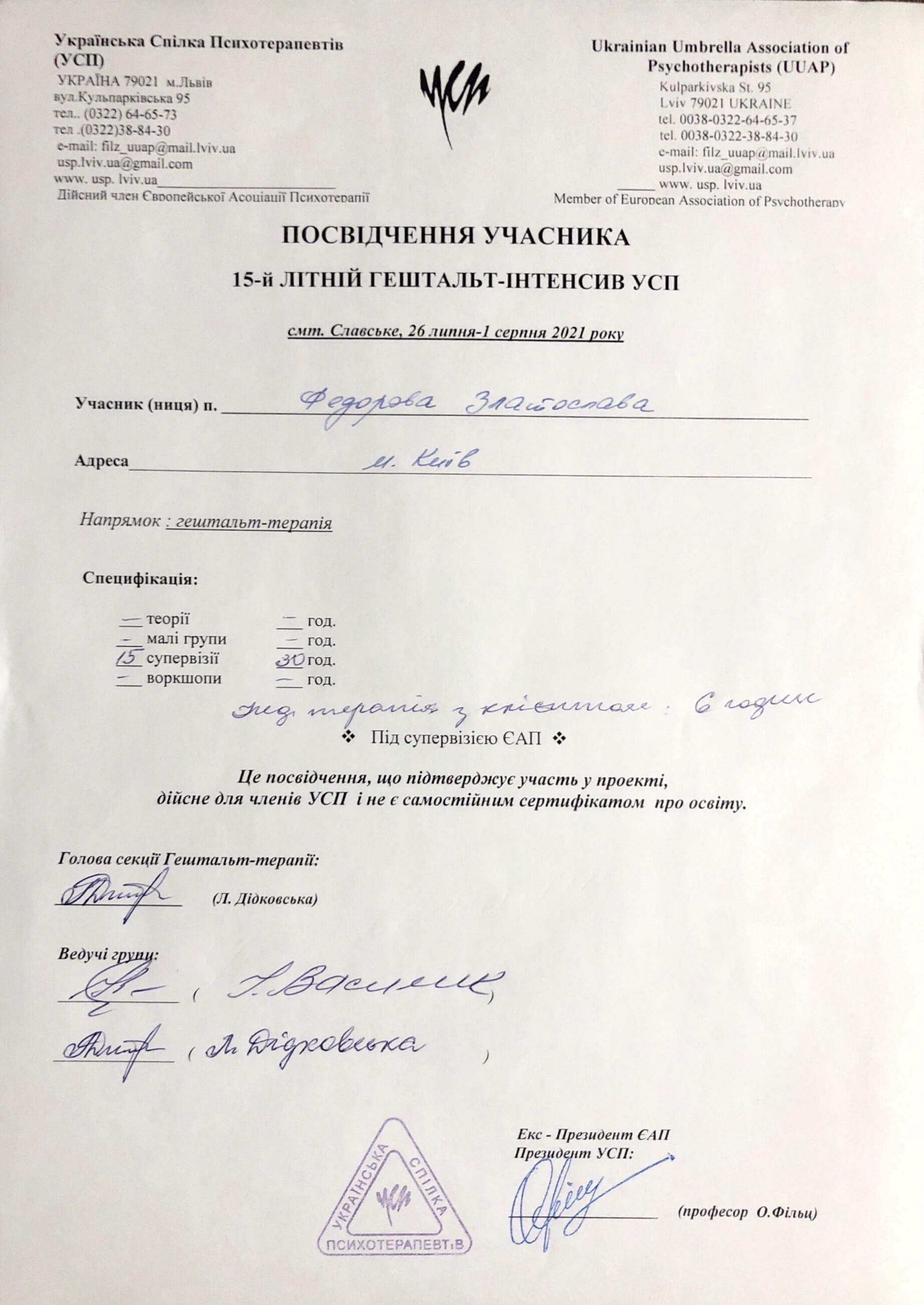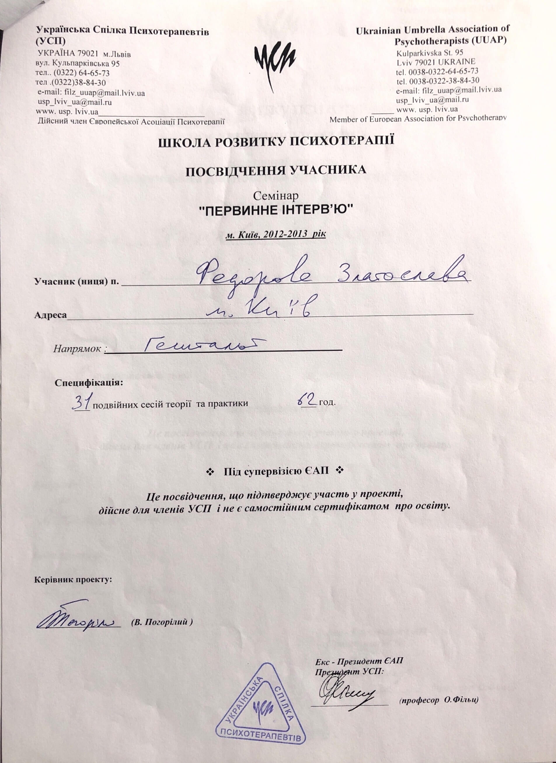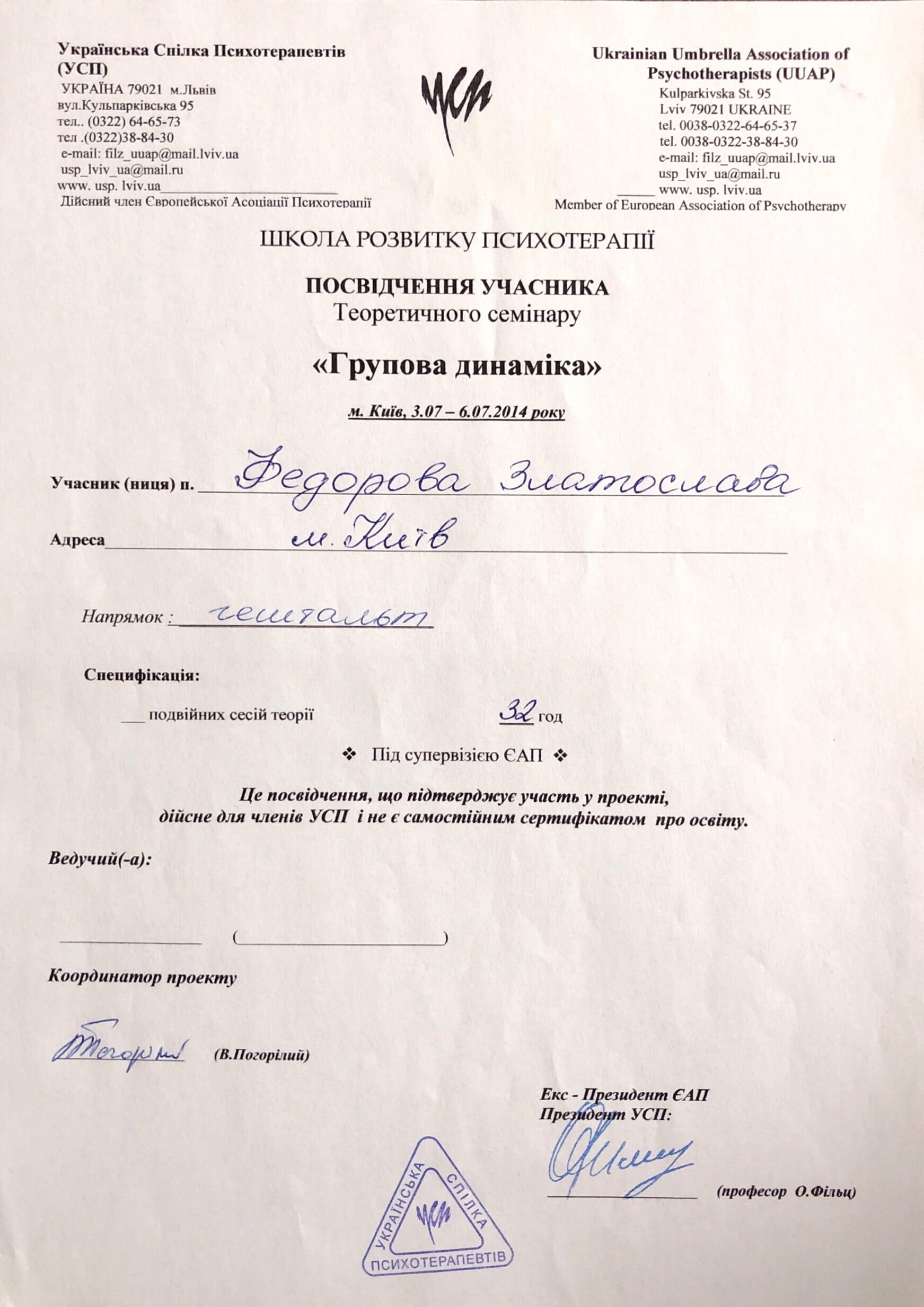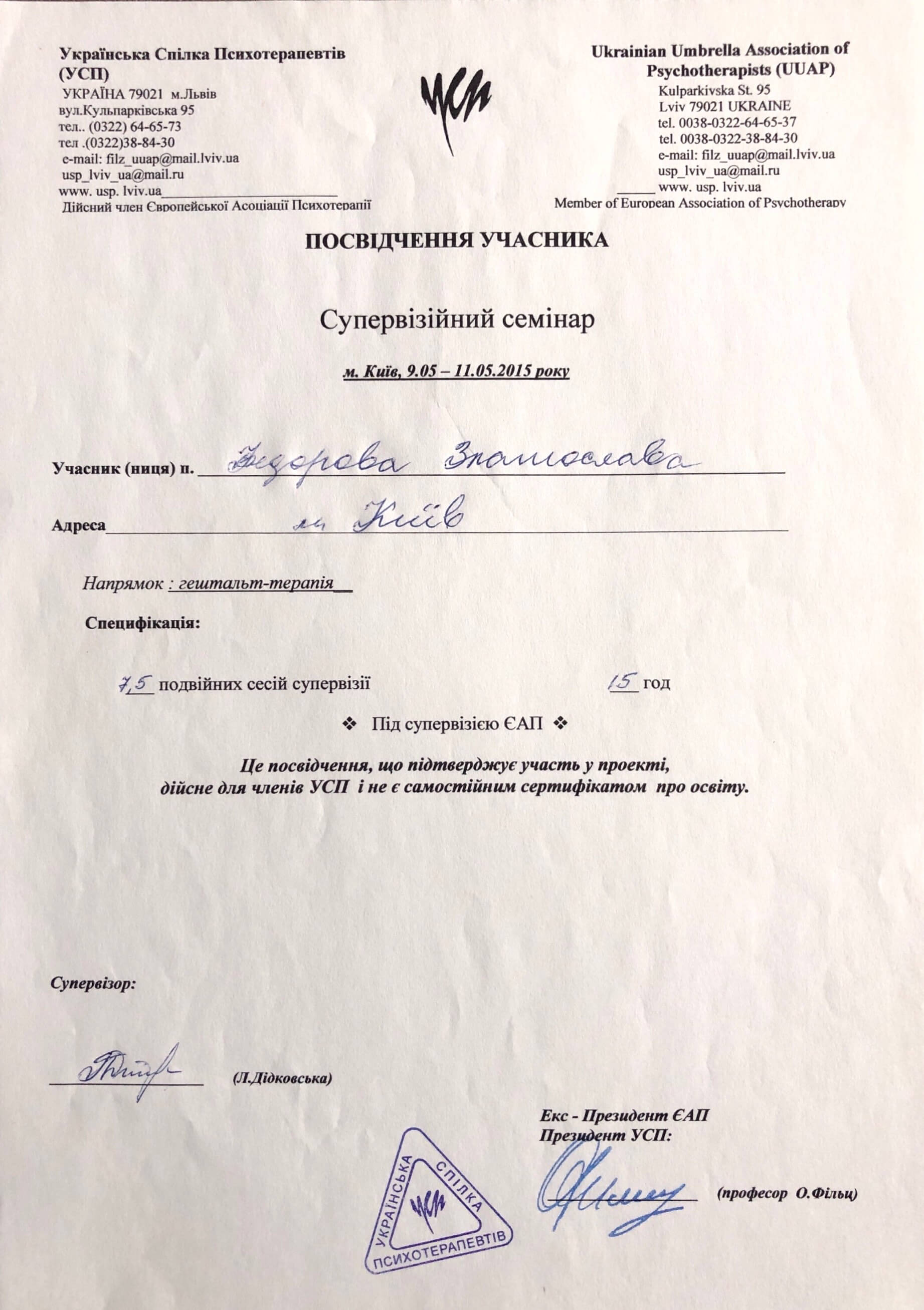 Сертифікат психотерапевта Української спілки психотерапевтів