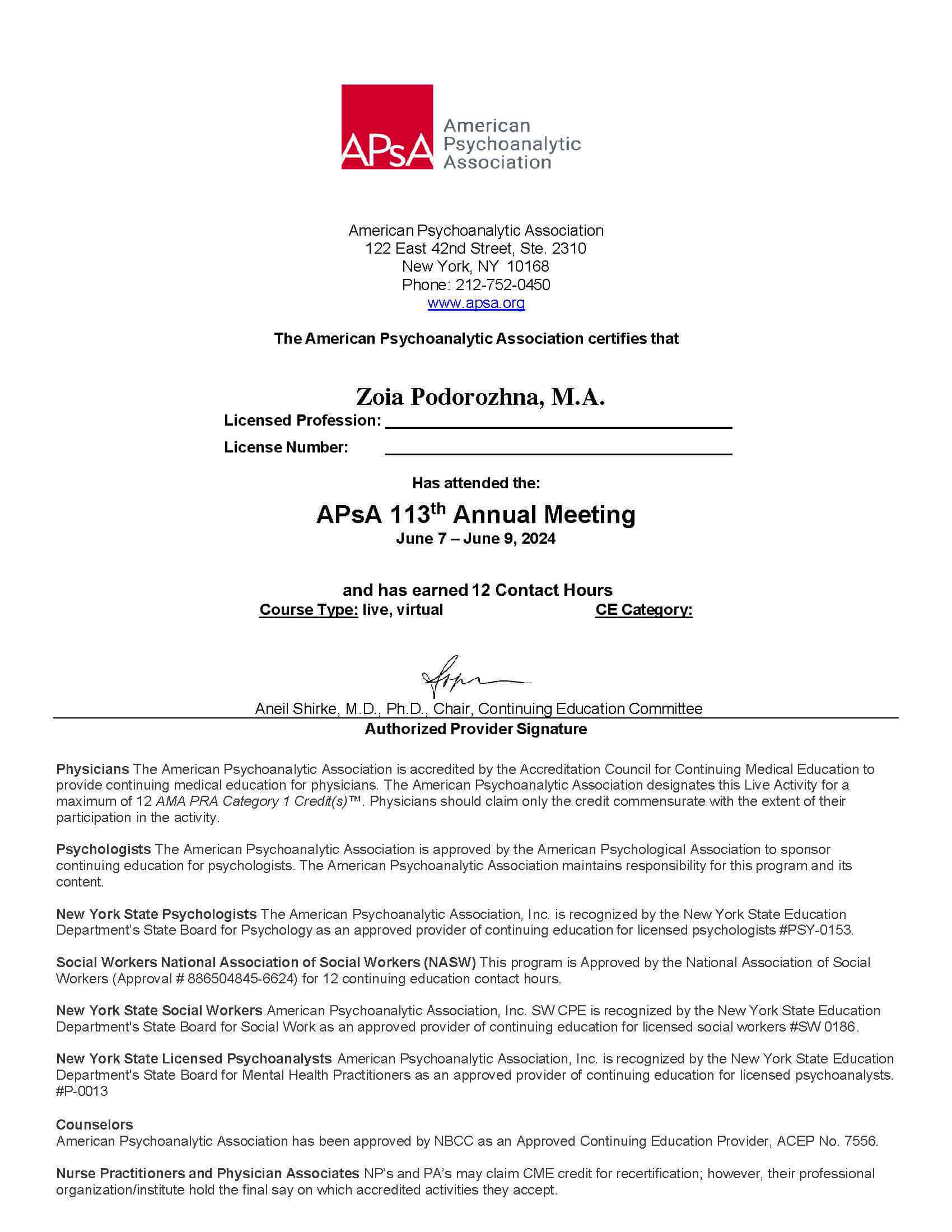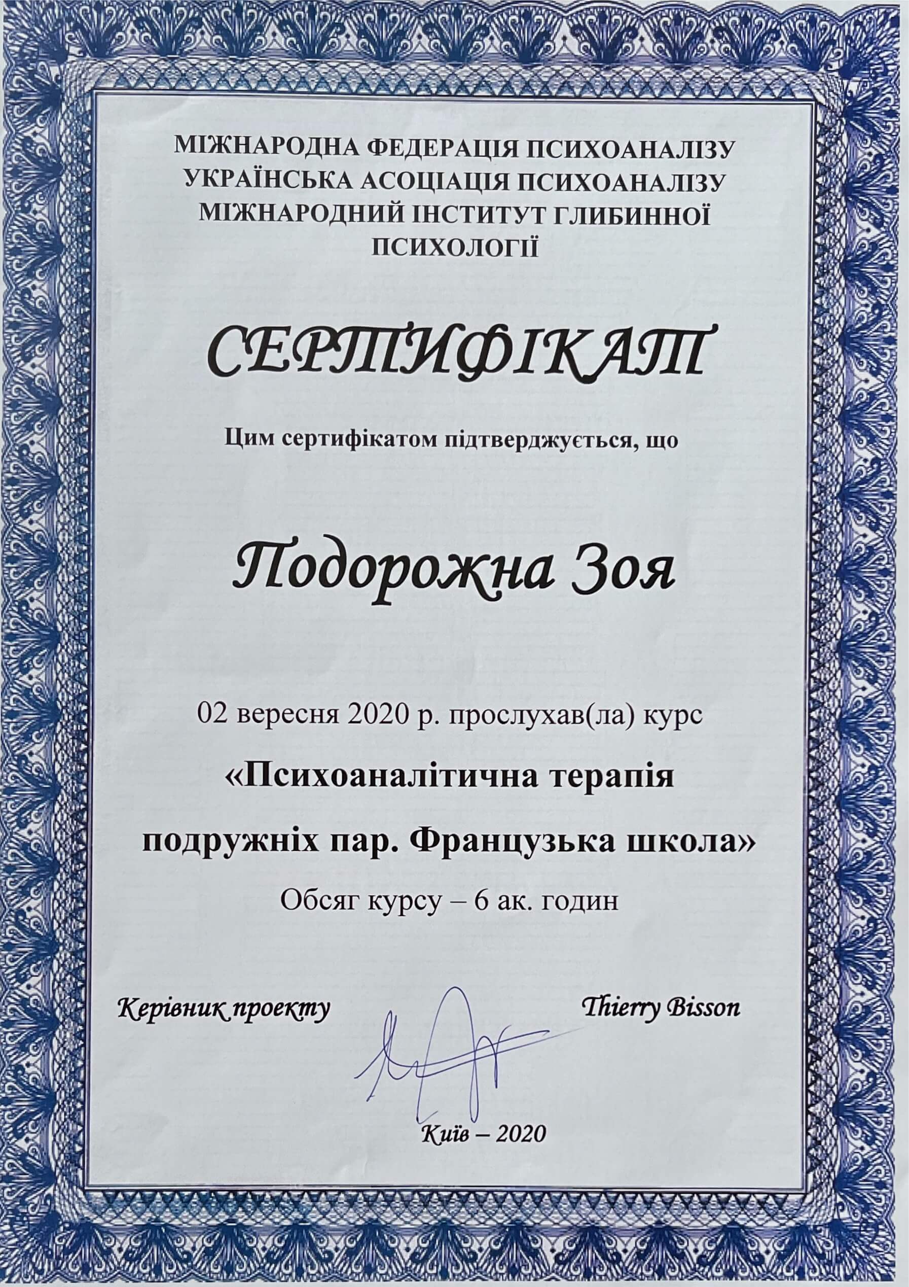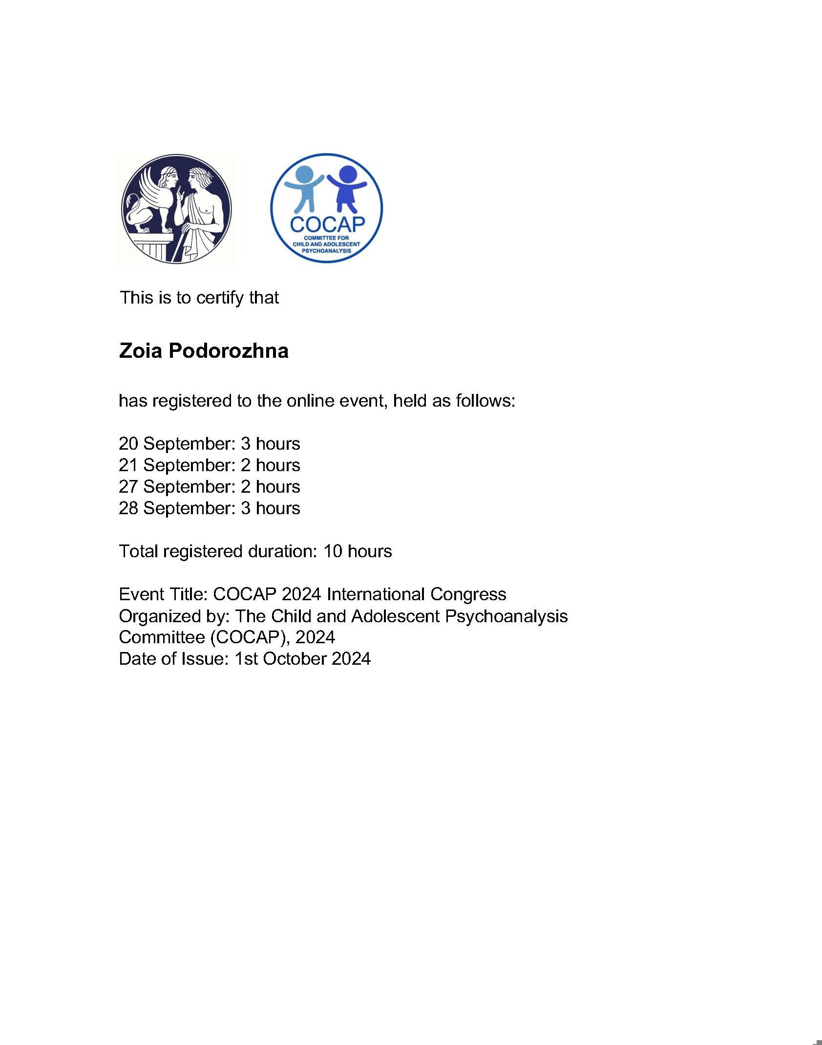 ✓2021 г- Сертифицированный Психоаналитик Украинско - Европейского реестра UAP-ECPP (Ukrainian Assosiation of Psychoanalysis - European Confederation of Psychoanalytic Psychoterapies).